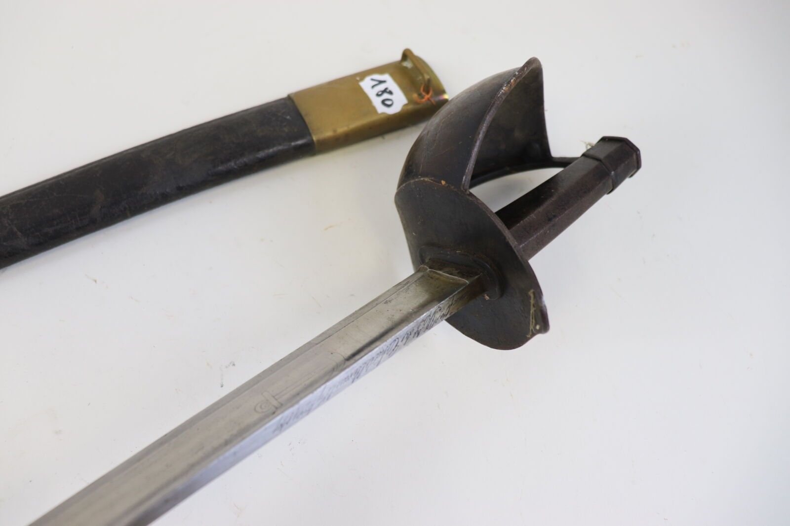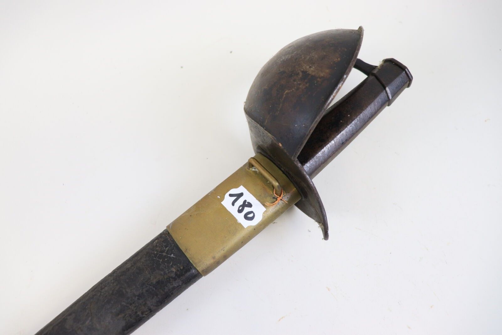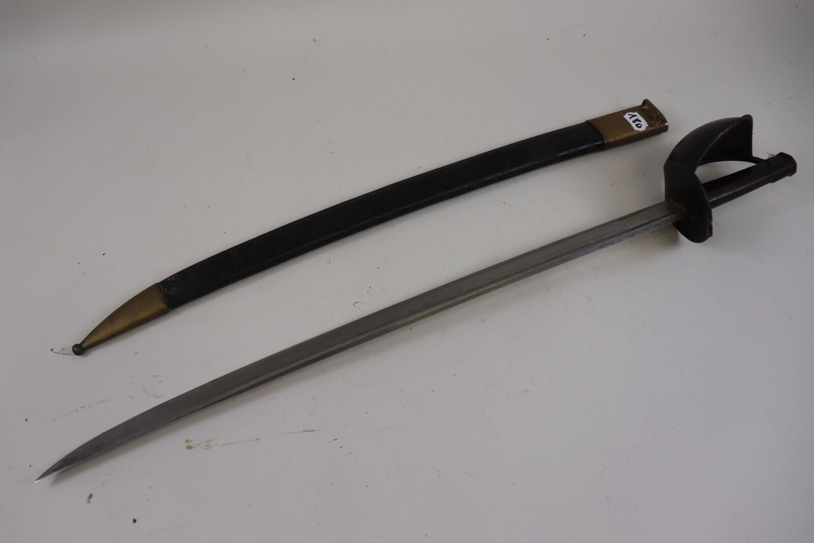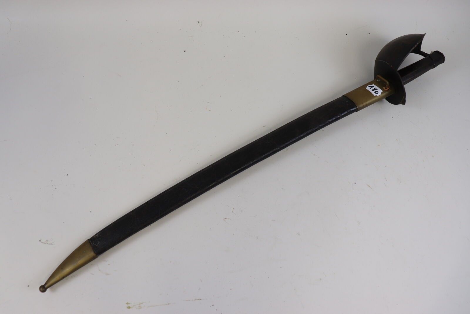 Side sabre, model 1833. Blackened iron mounting. Wraparound hilt. Curved blade with flat back marked "Manufre Rle de Châtellerault 7bre 1847" and hollow sides, engraved with the anchor. Leather scabbard with two brass fittings. ABE (wear, oxidation, dents to leather)