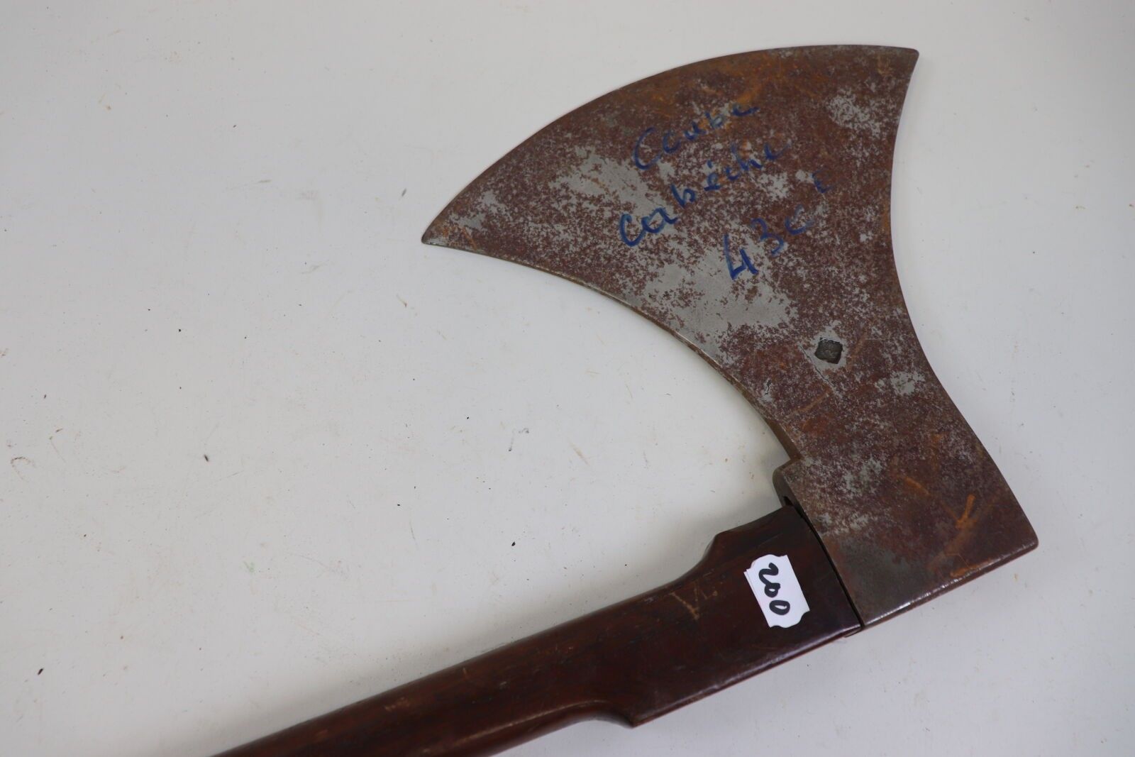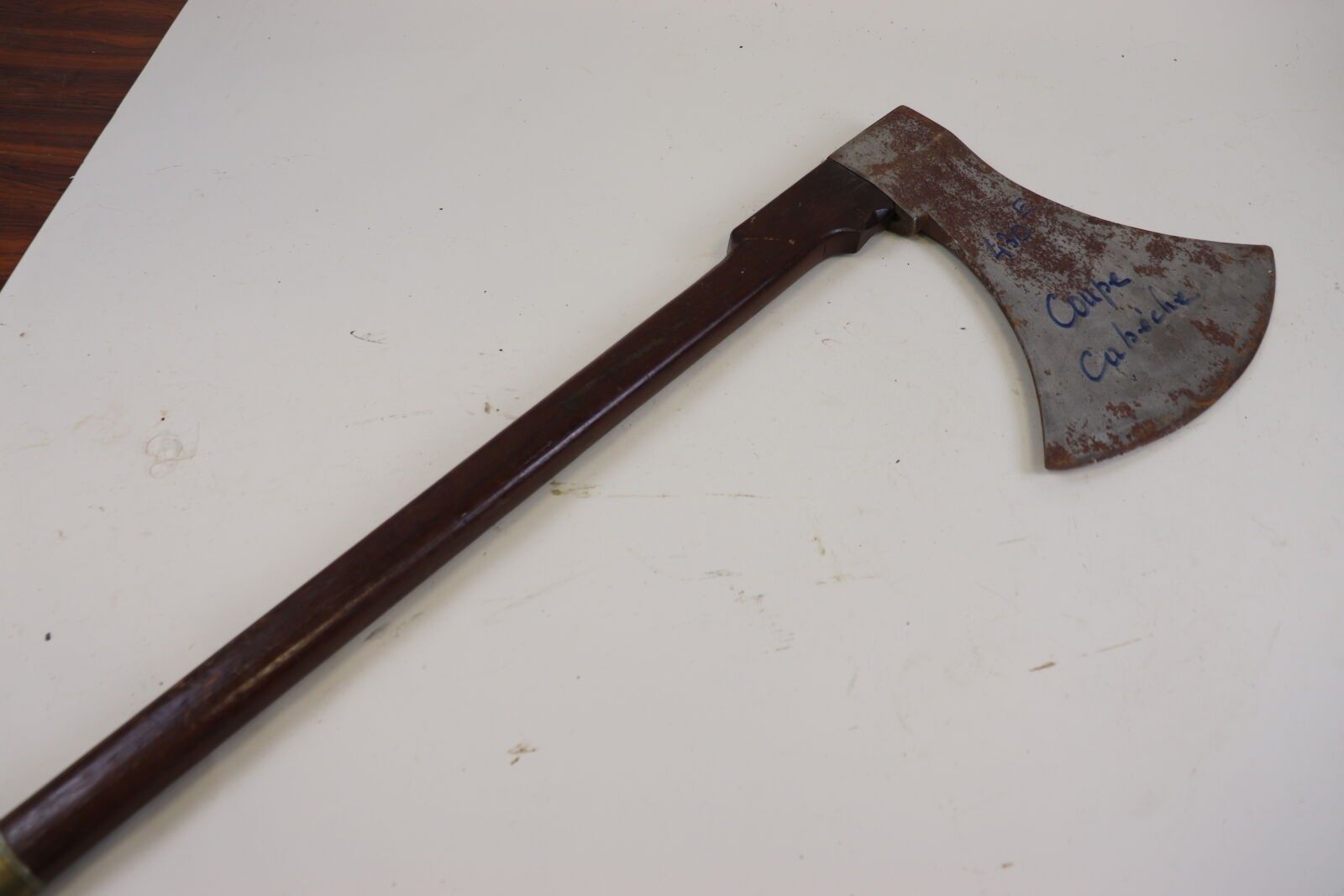 Sapper's axe. Crescent-shaped, wrought iron, hallmarked. Varnished wooden handle, brass sabot (oxidation).