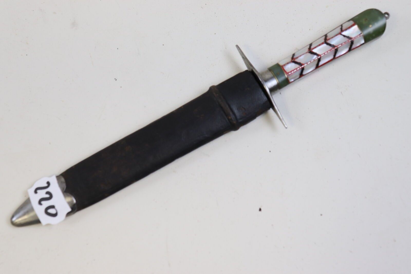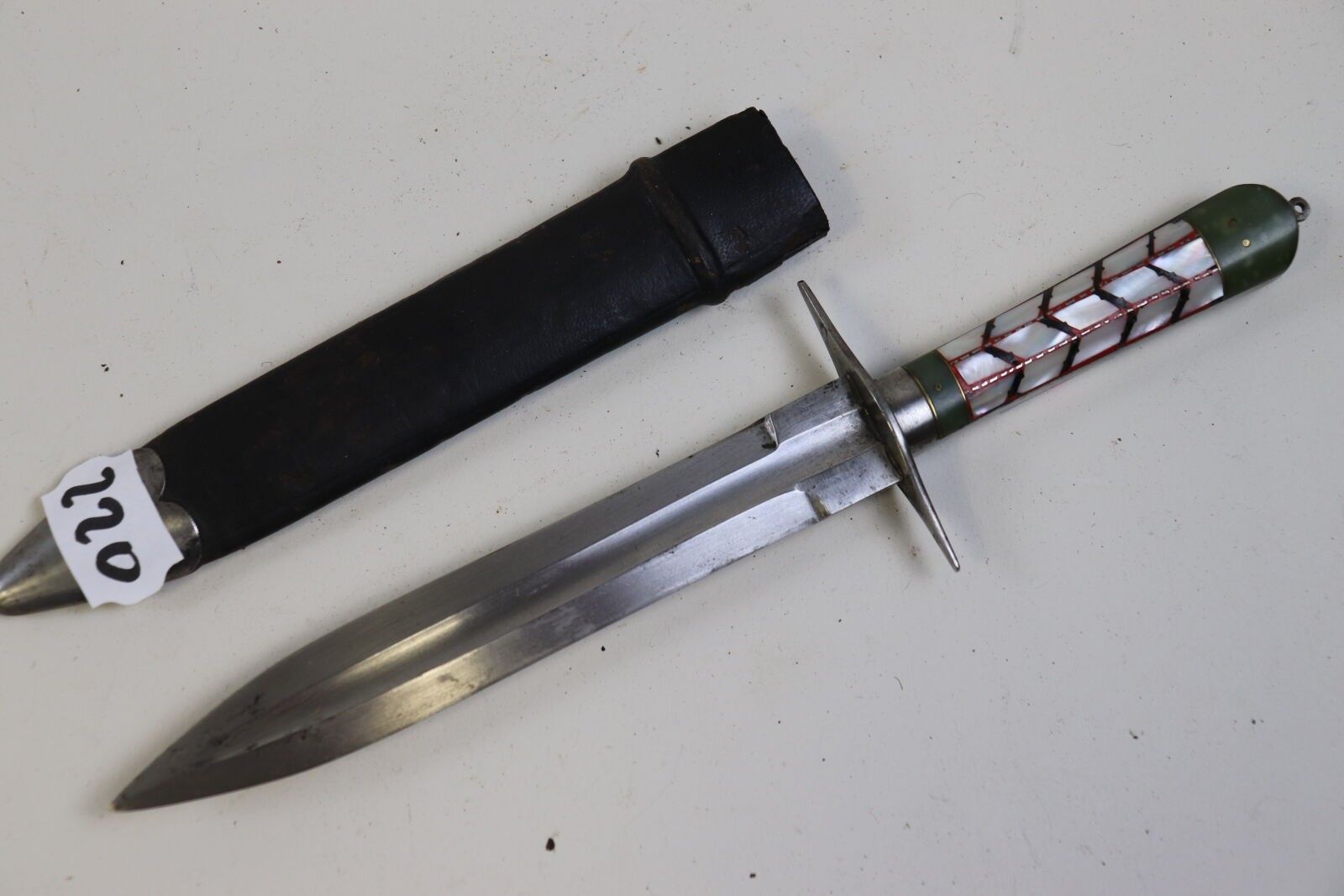 Dagger with mother-of-pearl and coloured stone handle. Double-edged blade with central hollow. Leather-covered scabbard with iron bolt. ABE (wear)