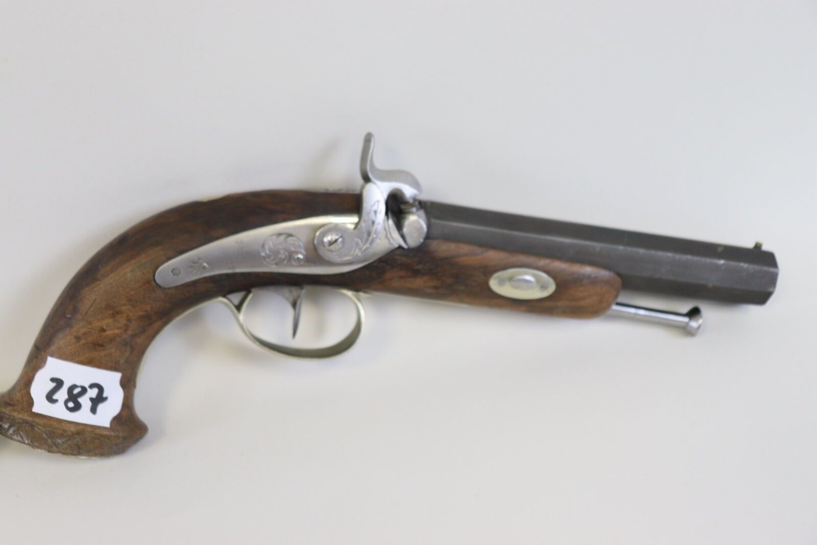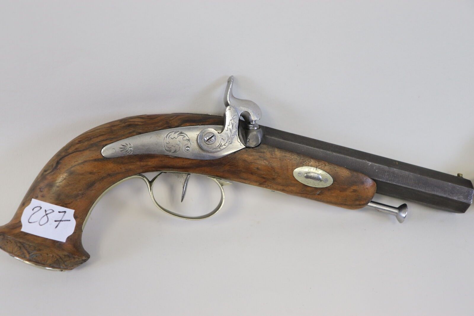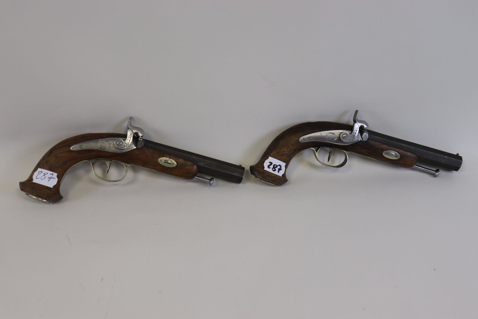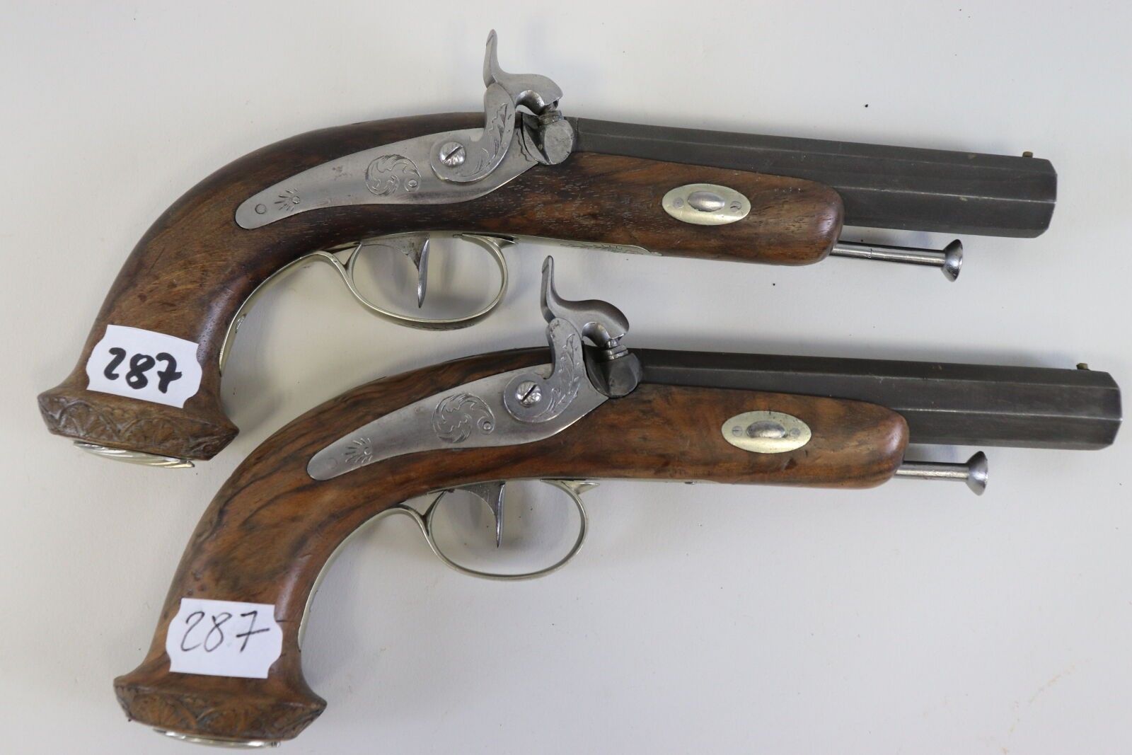 Pair of percussion pistols. Faux damascus barrels. Engraved locks and hammers. Cut-out white metal fittings, decorated en suite. Opening caps. Walnut stock, partly carved. Iron ramrods. ABE (arms restored, ramrods later)