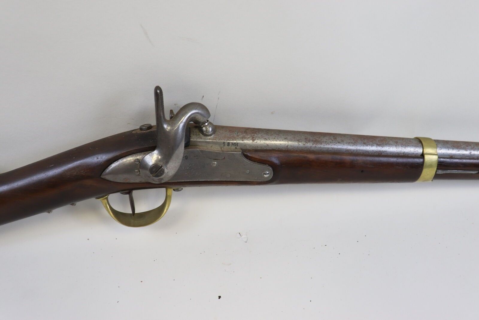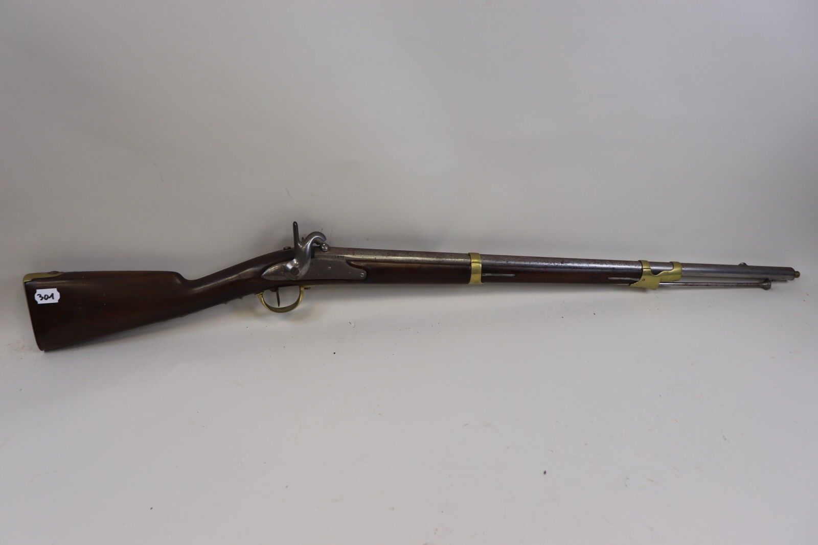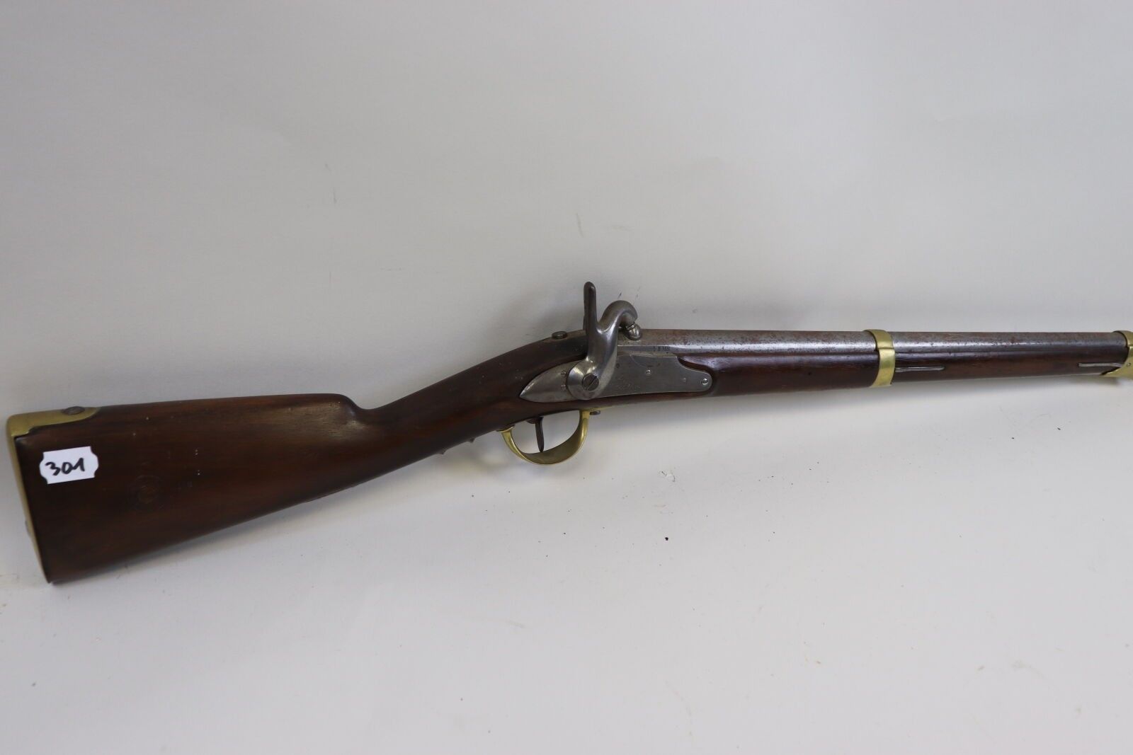 Cavalry musket, model 1825 T bis. Round barrel with thunderbolts. Lock engraved "Mre Rle de St Etienne". Brass fittings. Walnut stock with stamp. Iron ramrod and brass and wood cap. ABE (oxidation, later ramrod and cap).
