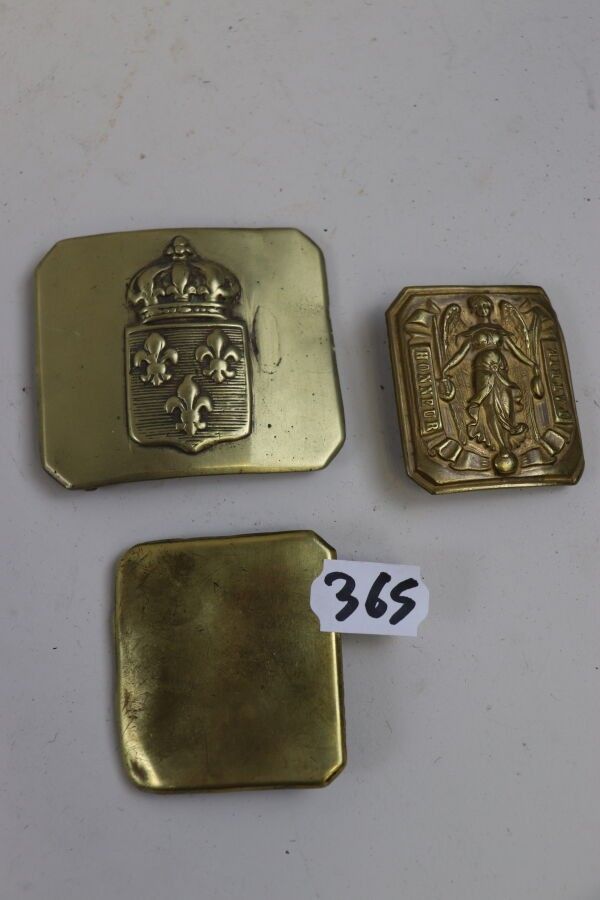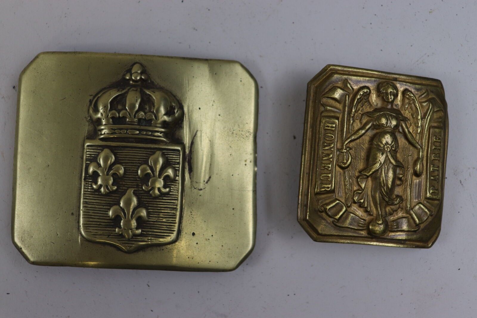 Set of 3 brass belt buckles: Royal Guard dragoons (wear, barbs missing); National Guard officer; smooth.