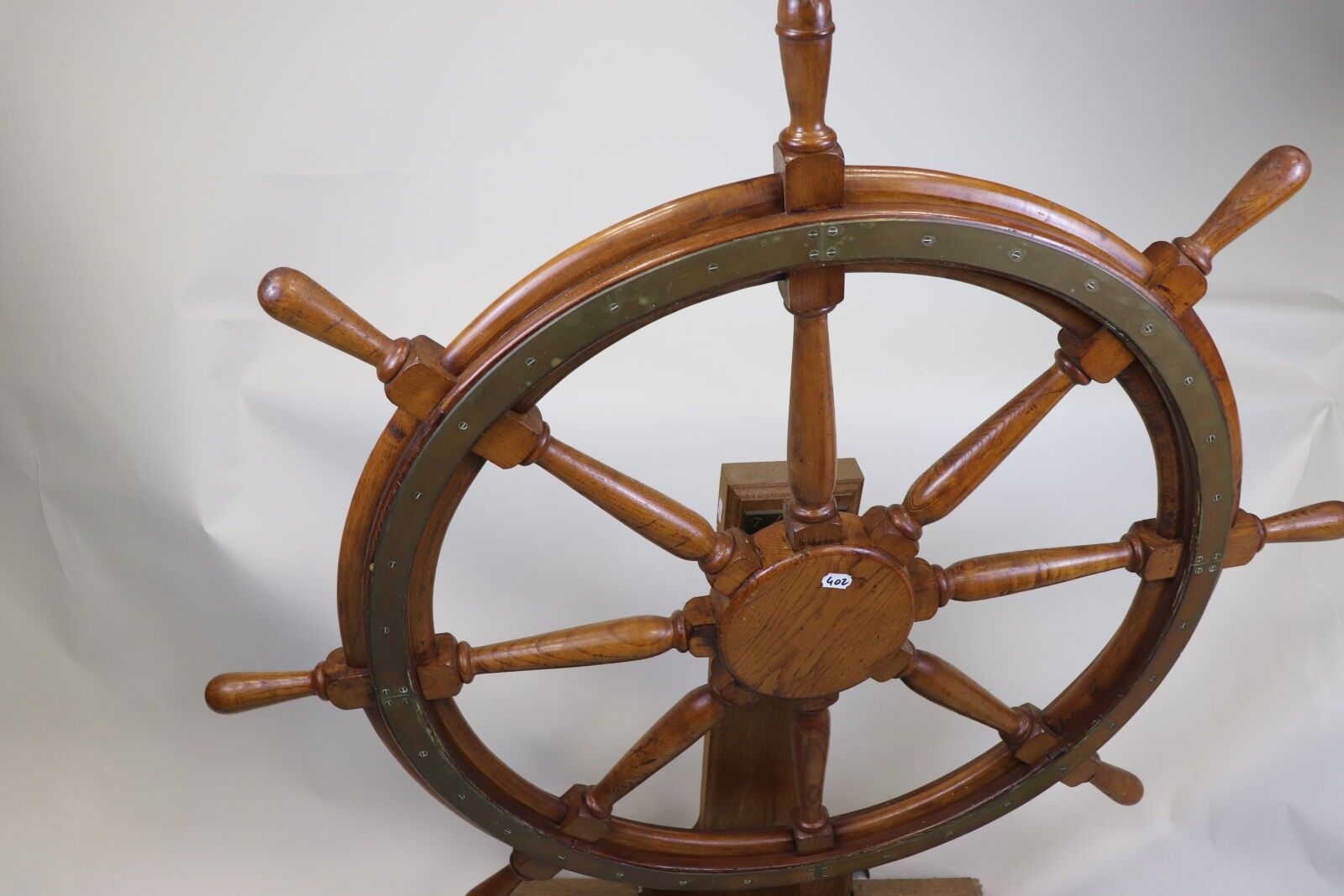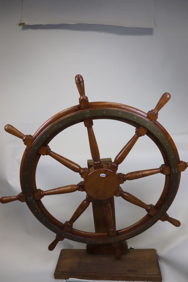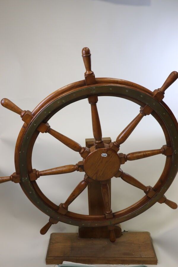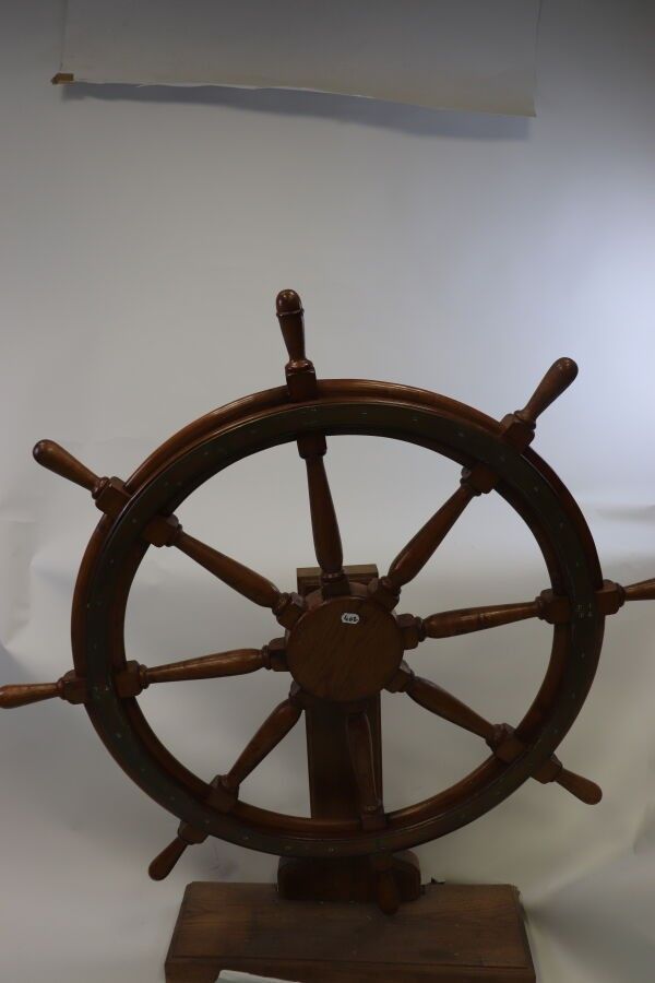Brass-reinforced wooden wheel bar with eight spokes. Ø: 130 cm Presented on a stand with axle.