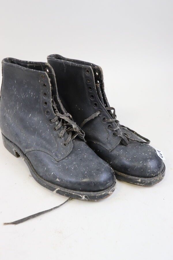 Pair of black leather brodequins with 9 pairs of eyelets, lined with ecru fabric with ink stamp. Smooth leather soles, with stamp. ABE