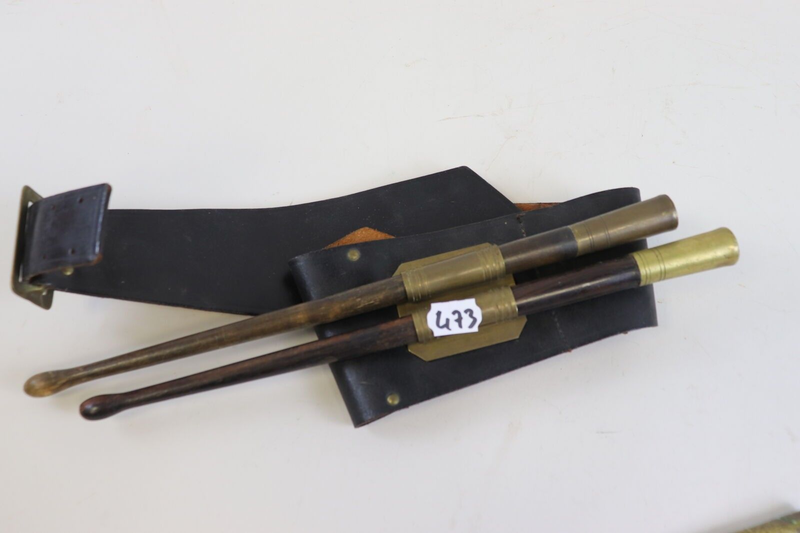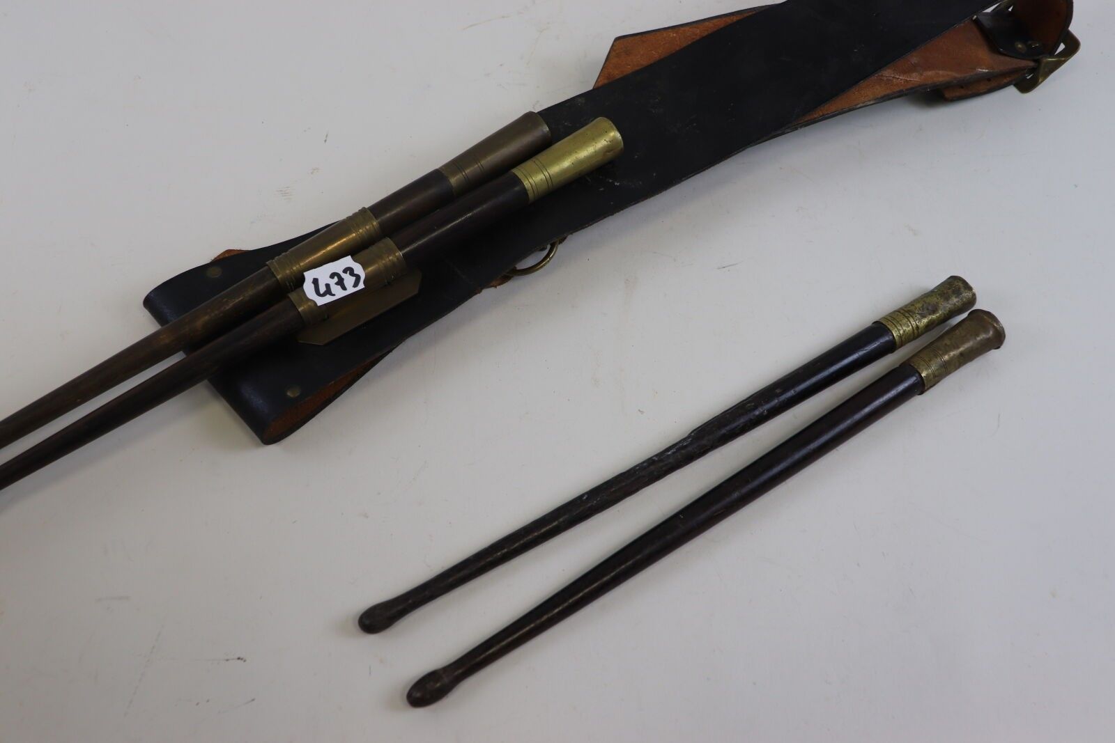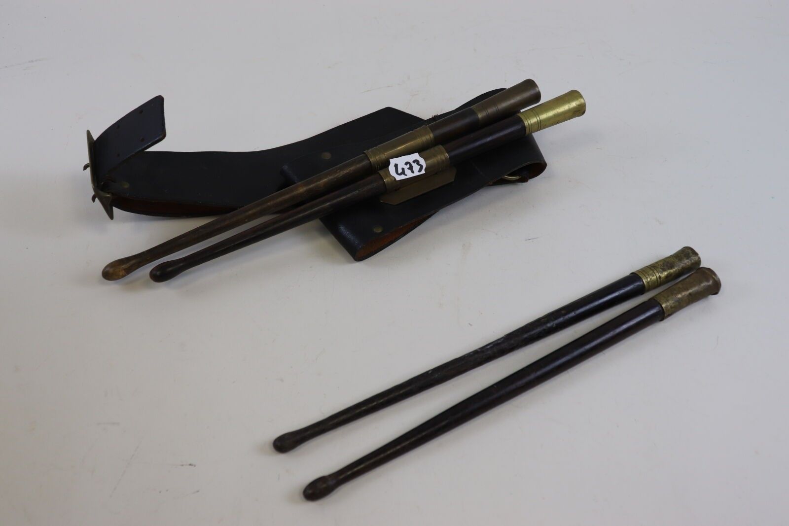 Chopstick holder, leather, with a pair of chopsticks. Another pair of chopsticks is attached (one pair is missing and damaged).