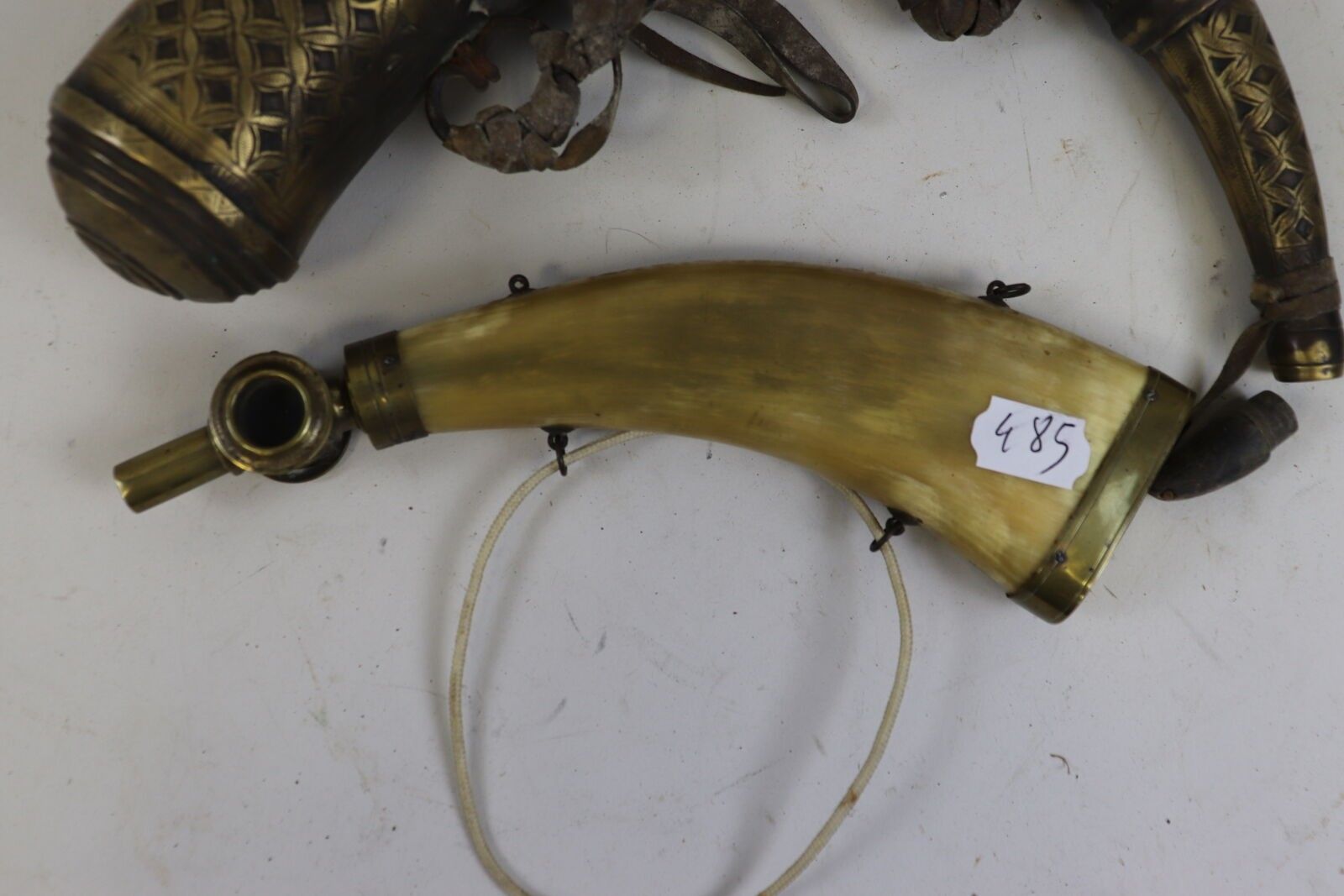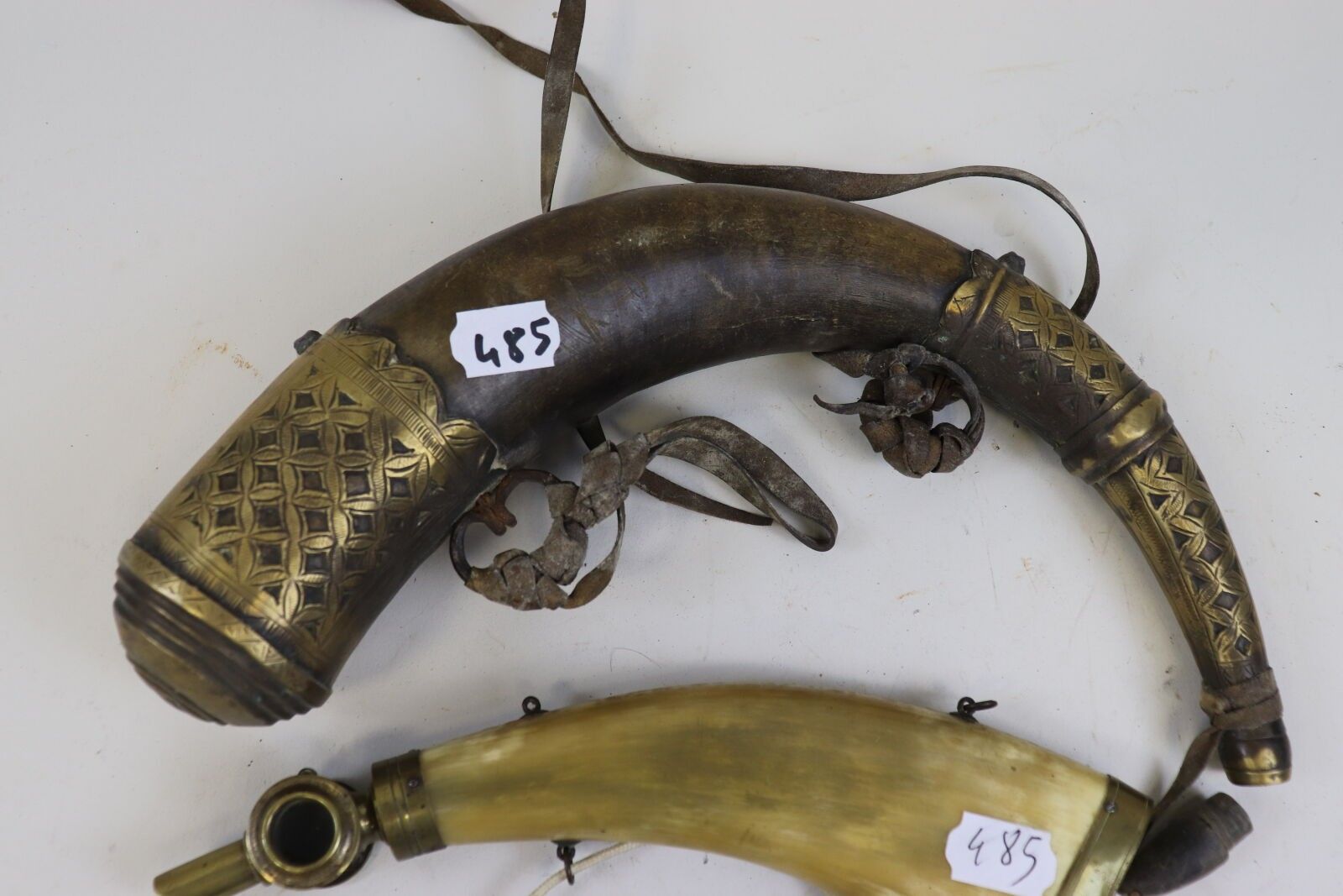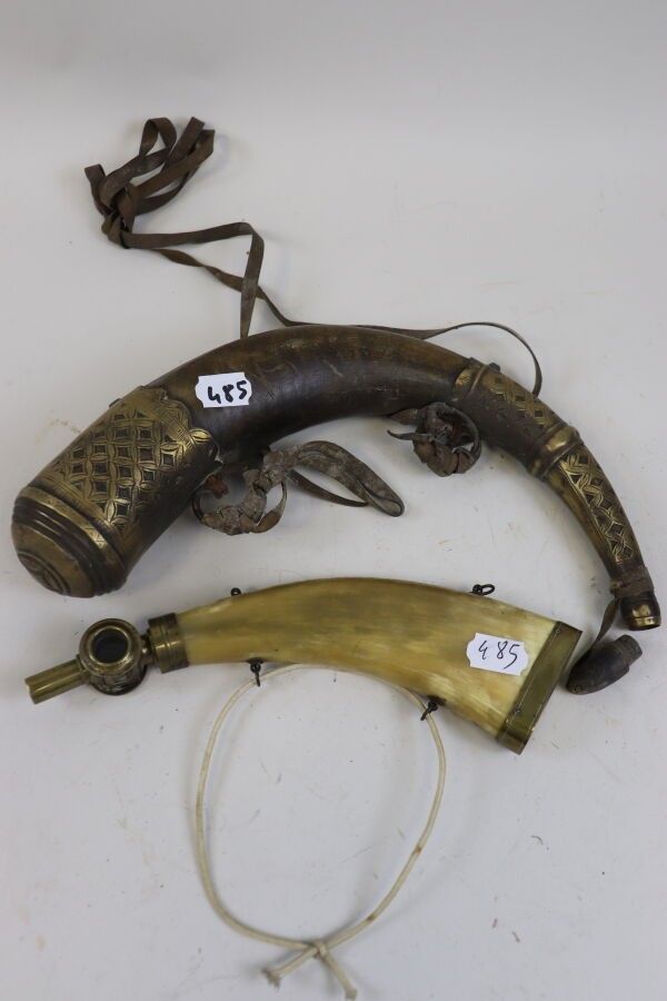 Set of 2 horn powder flasks, one oriental.