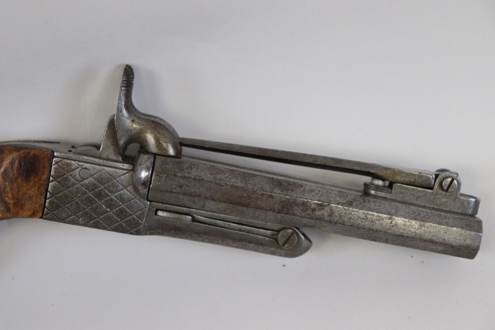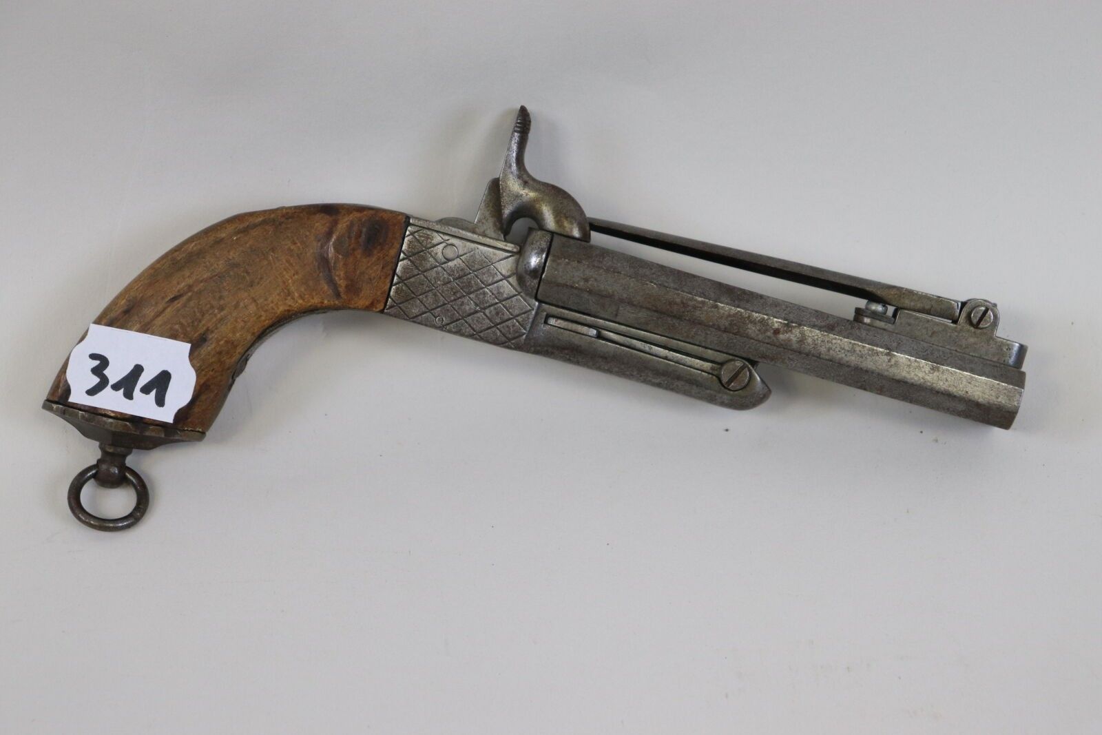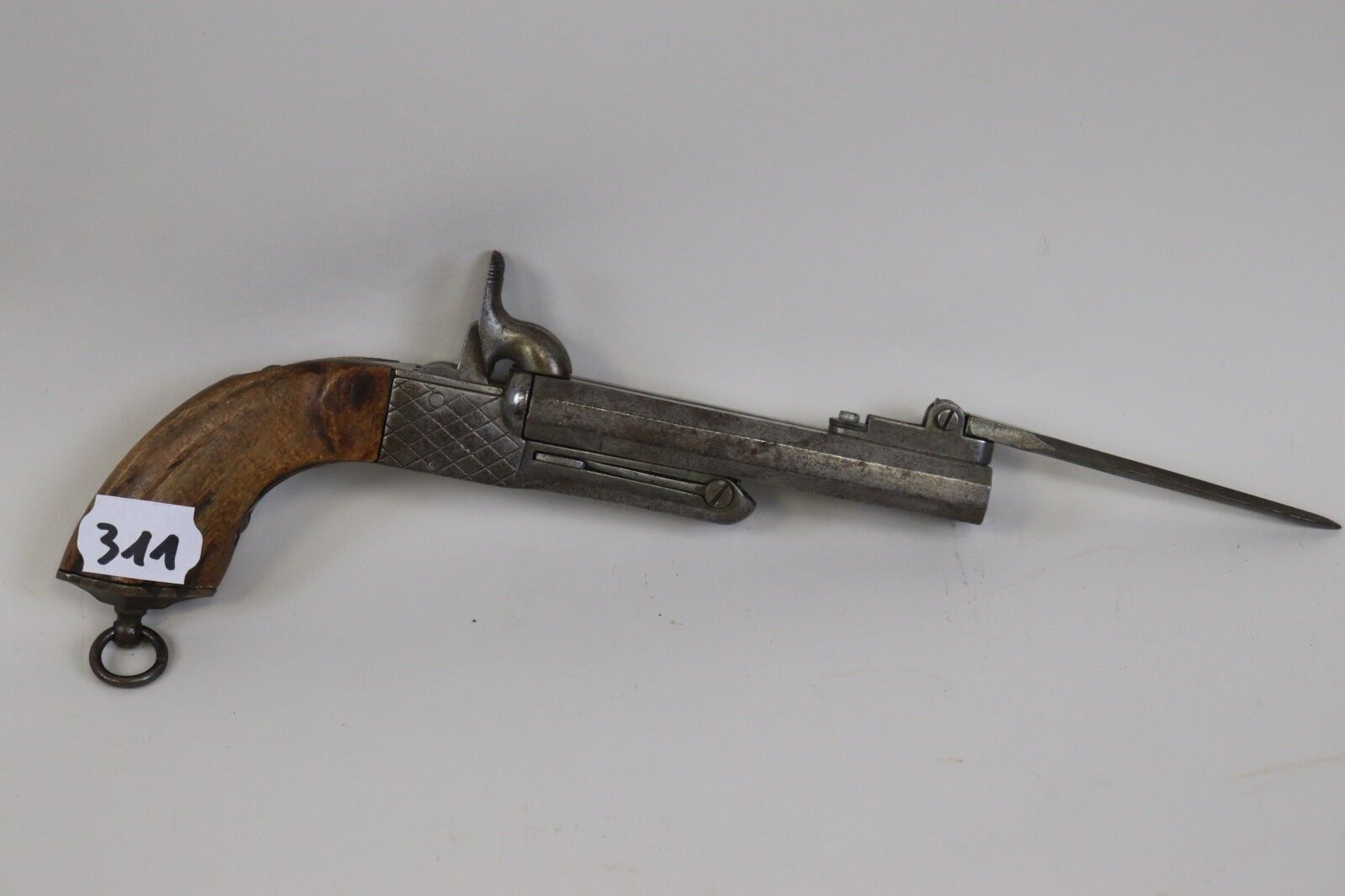 Pistol, double, with case, with pin, with bayonet. Juxtaposed barrels, with sides, with swivelling bayonet with diamond-shaped blade. Recessed trigger. Walnut stock. ABE (pitting)