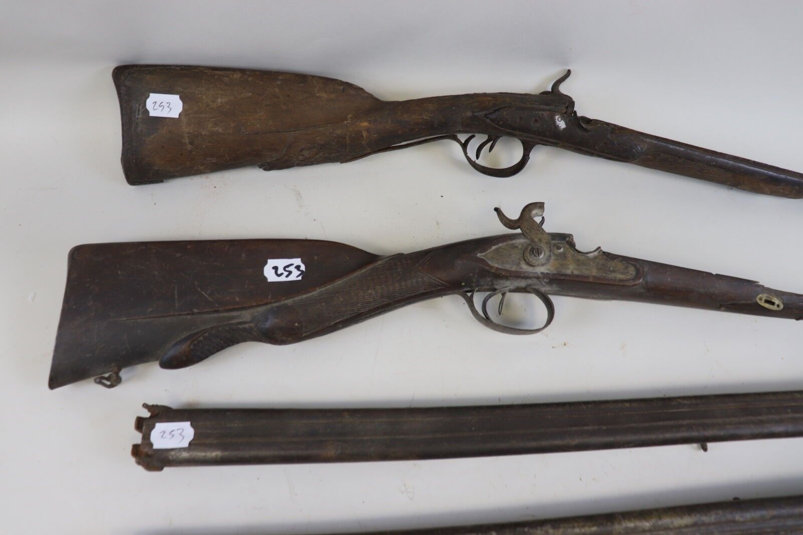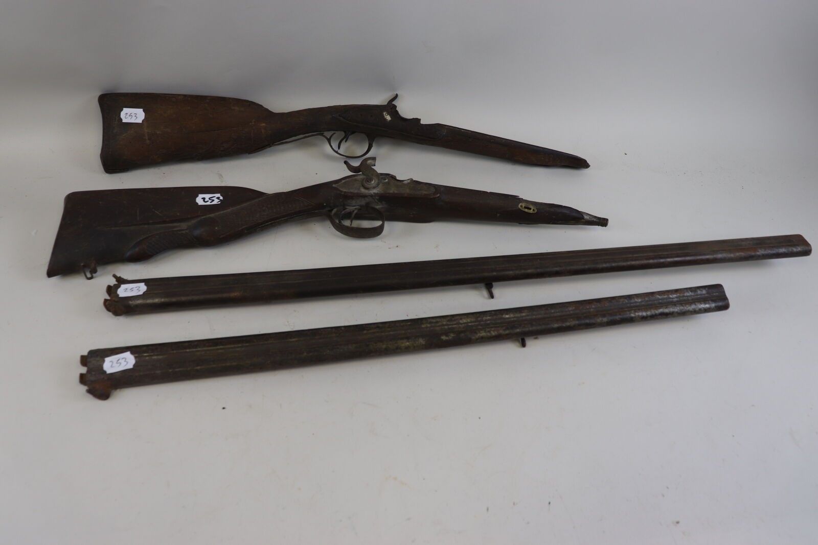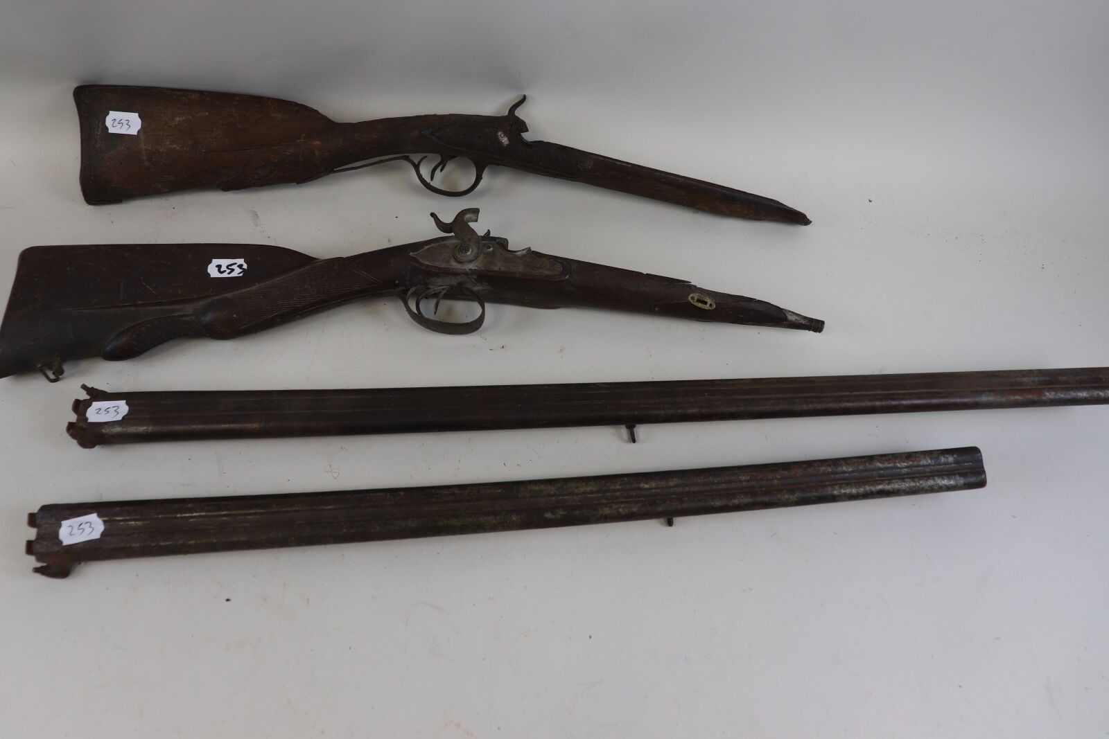 Set of 2 remaining double shotguns, converted to percussion. Walnut stocks. As is (accidents, missing parts, pitting).