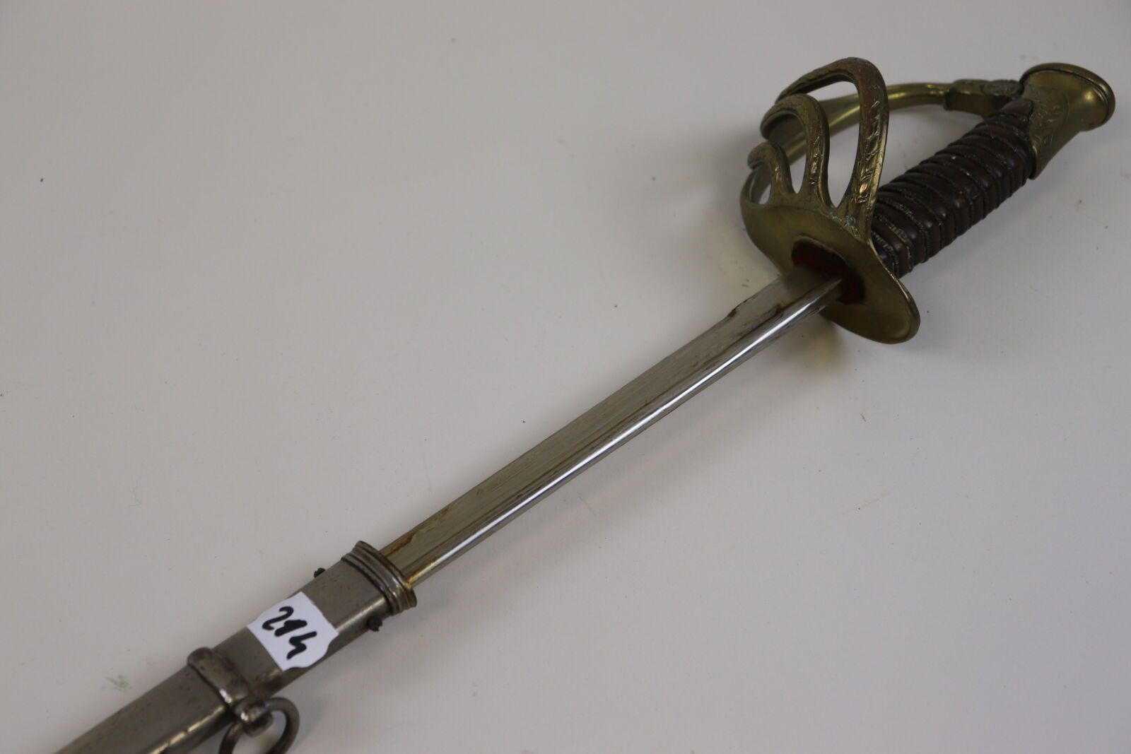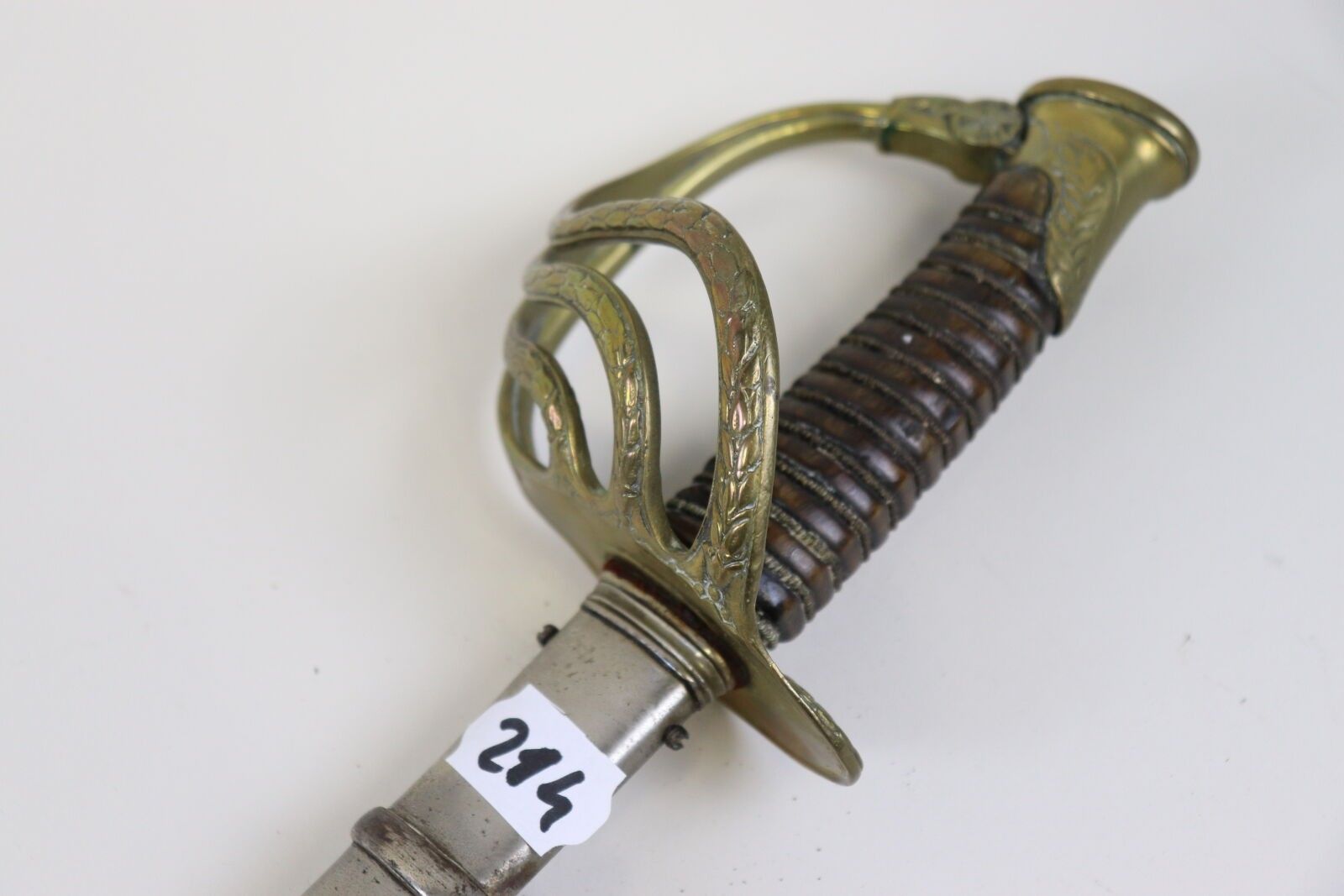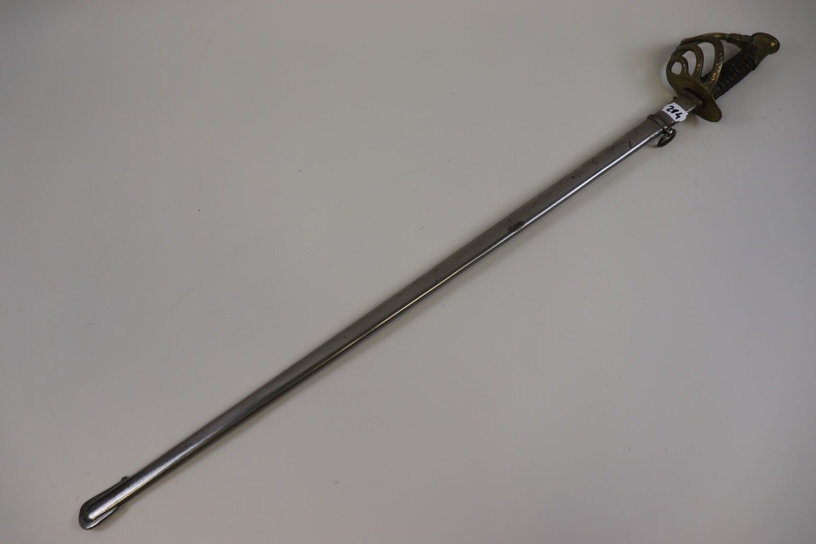 Officer's sabre, fancy model. Horn handle with filigree. Chased brass mounting. Four-point hilt. Baguette-backed blade. Scabbard with one nickel-plated strap. ABE (oxidation)