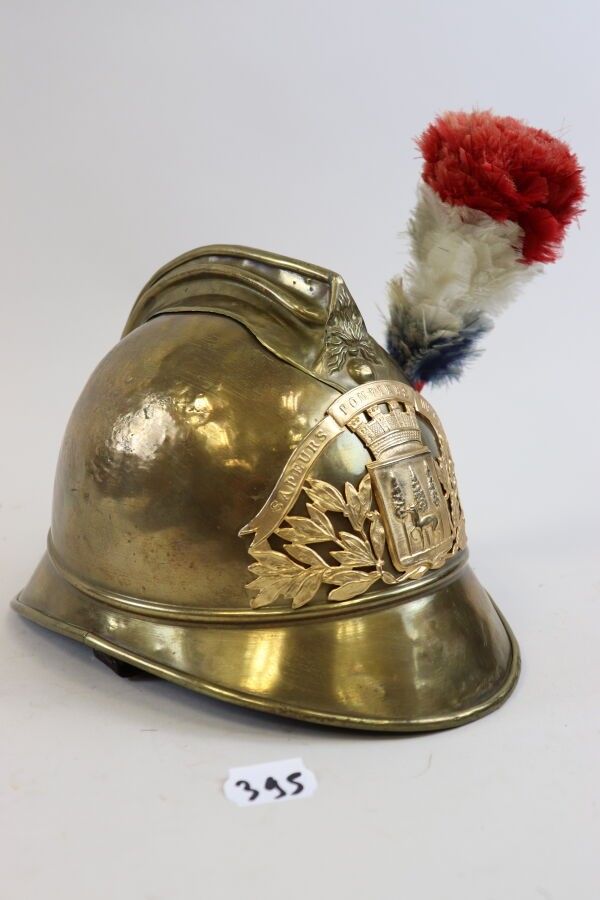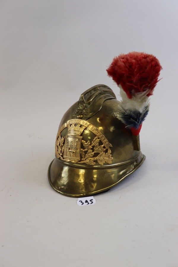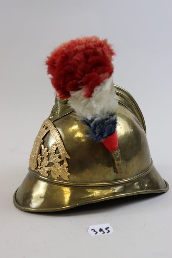 Gueret Fire Brigade helmet shell, model 1886, in brass. Plaque with the town's coat of arms. Tricolour plumet (dents, plate attached).