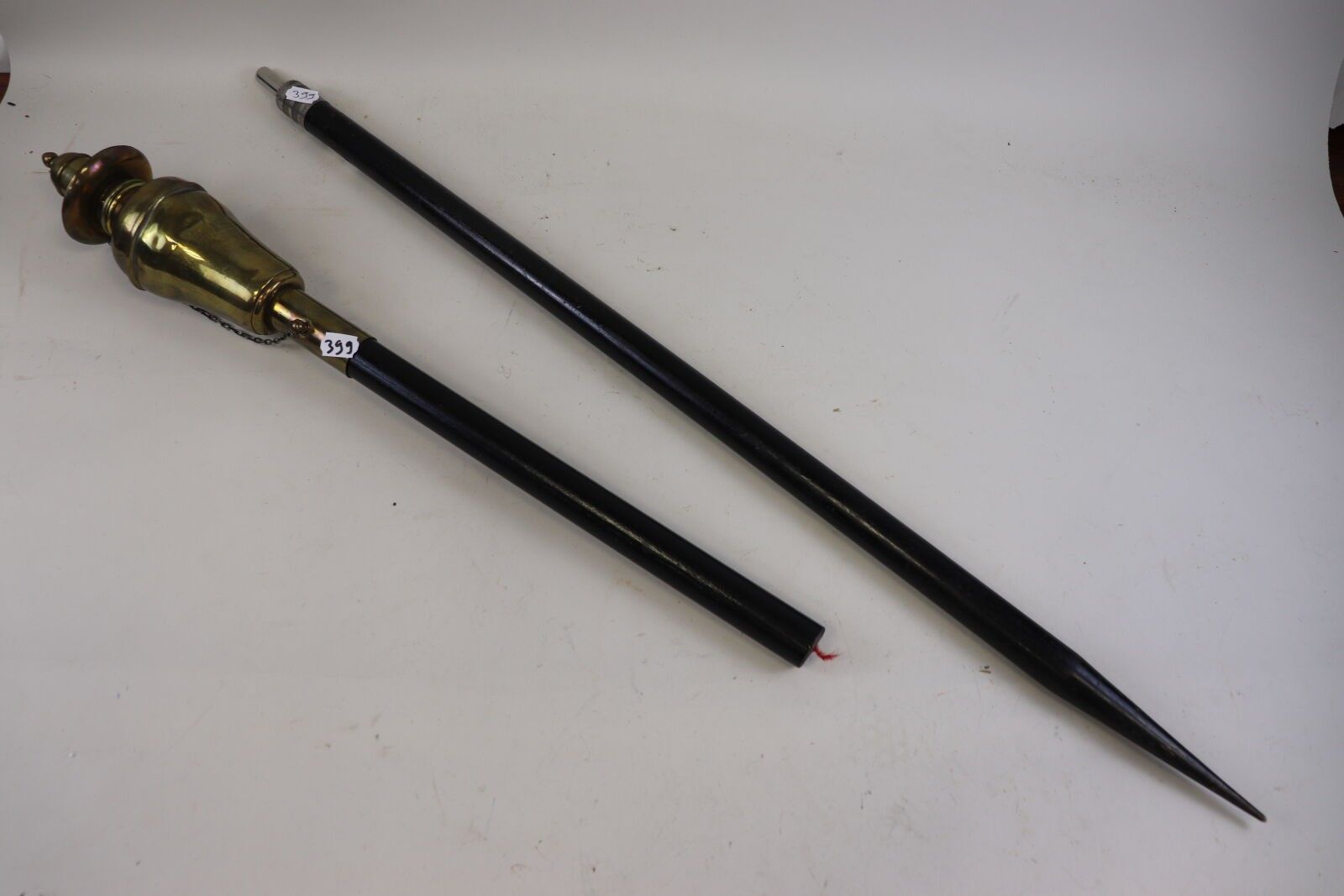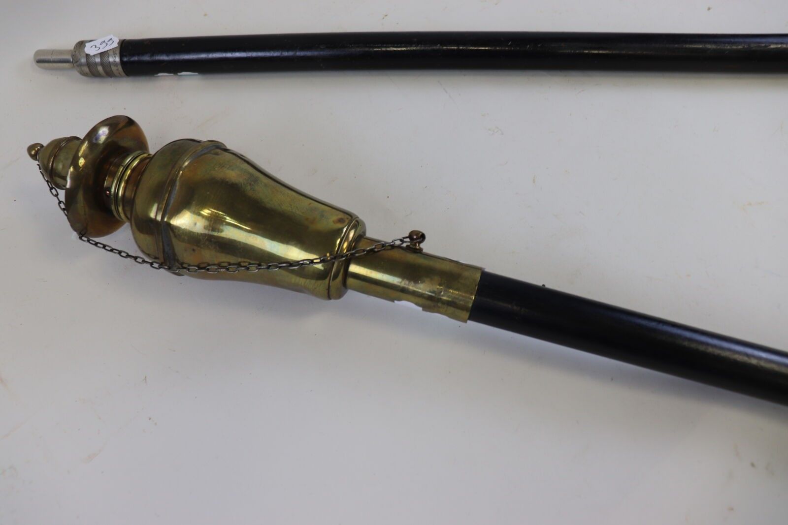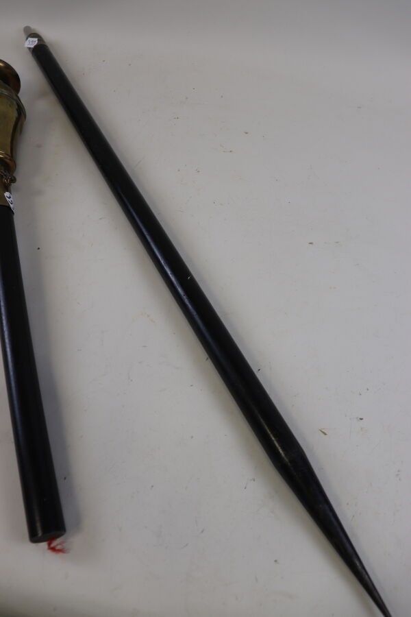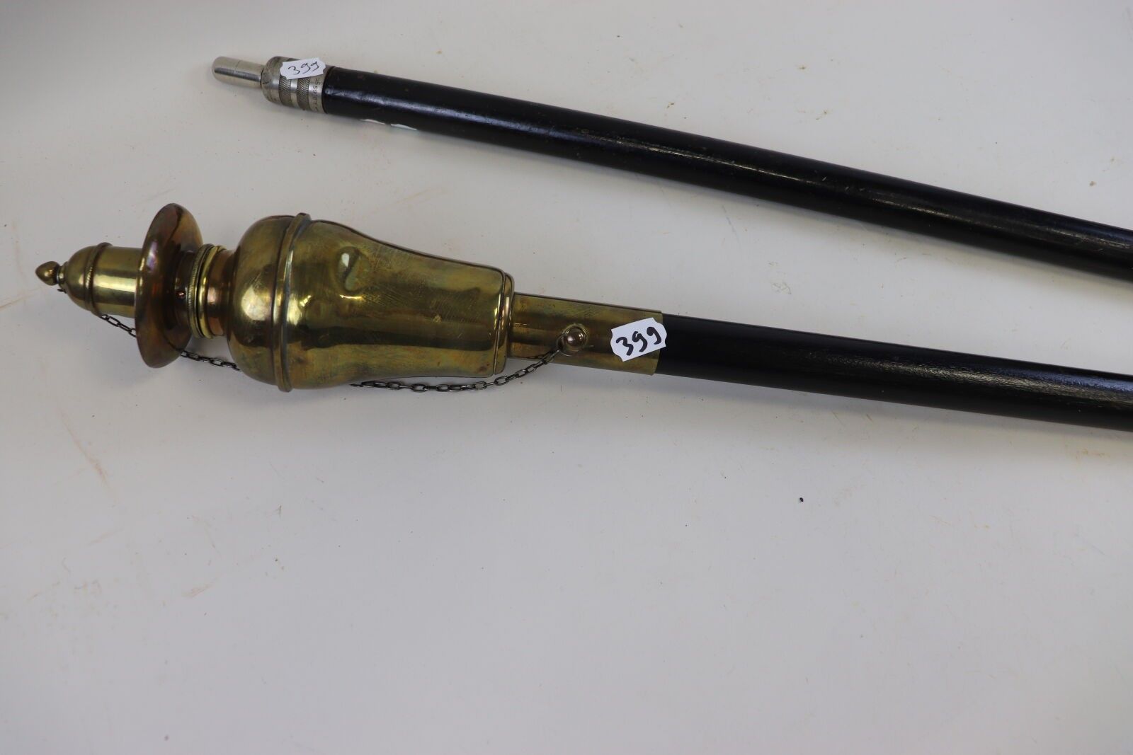 Set of 2 firemen's torches: one brass, the other nickel-plated. Blackened poles.