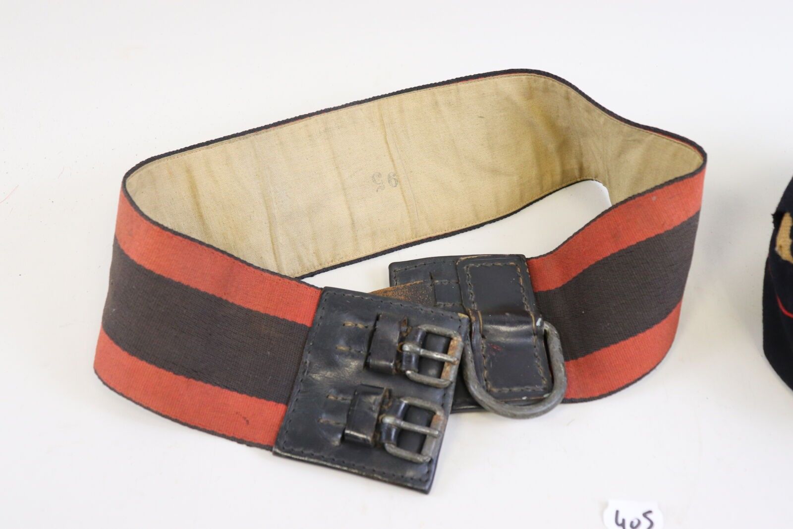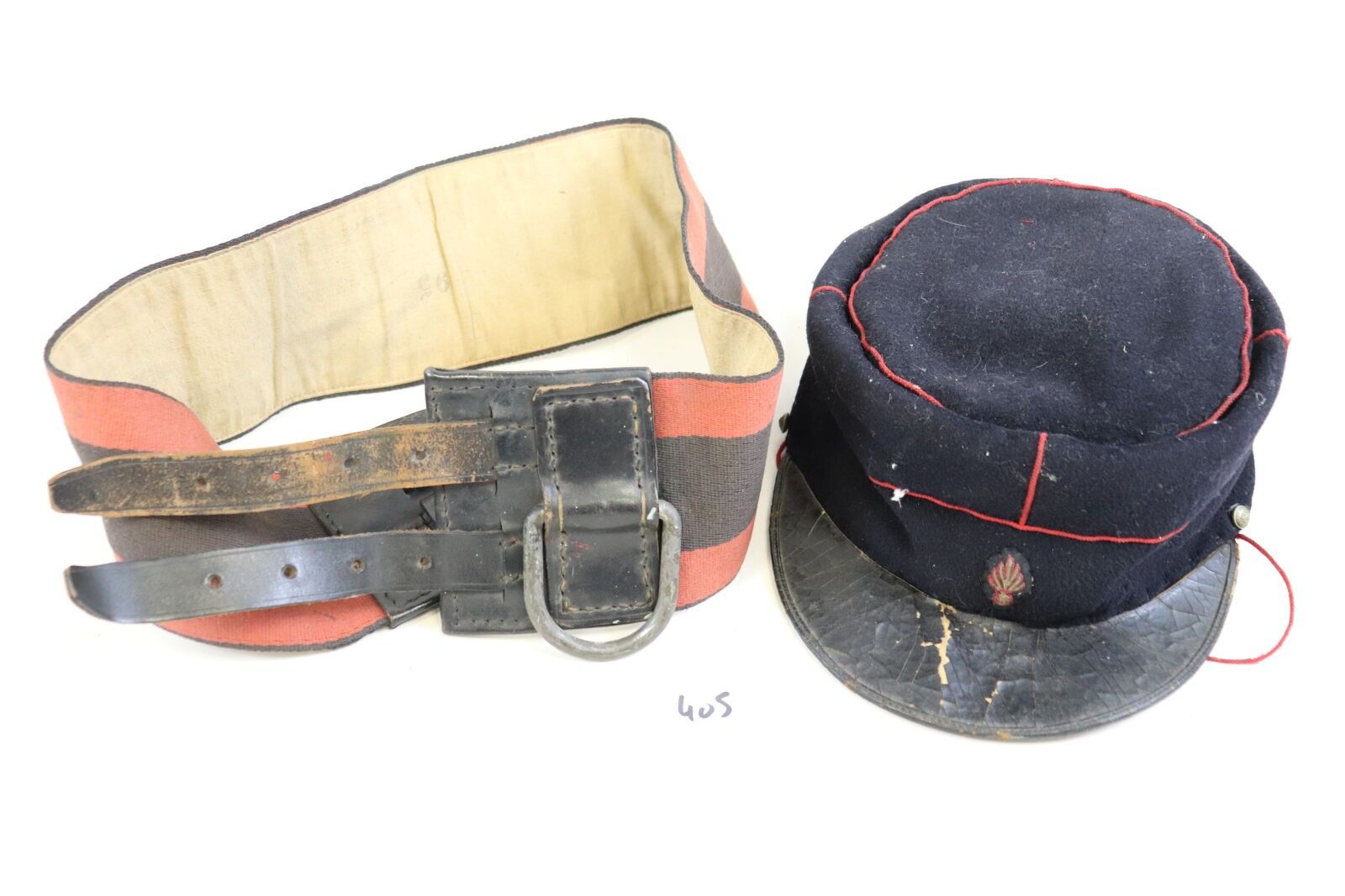 Fireman's lot: kepi, in black cloth, leather visor; power belt. As is (accidents, missing parts)