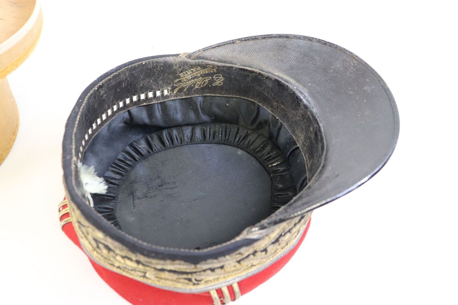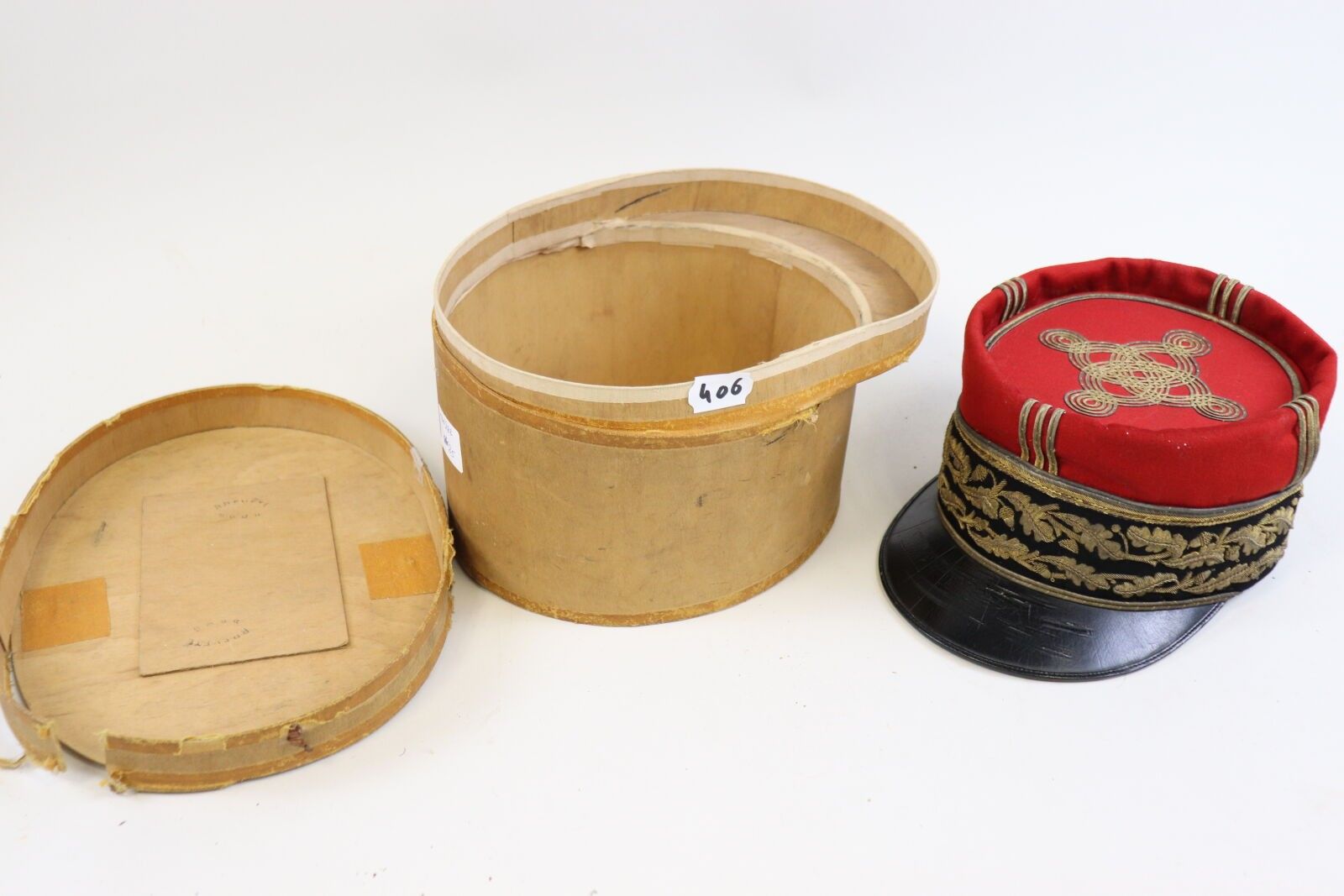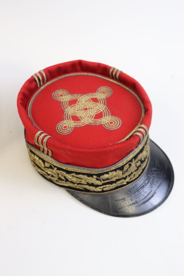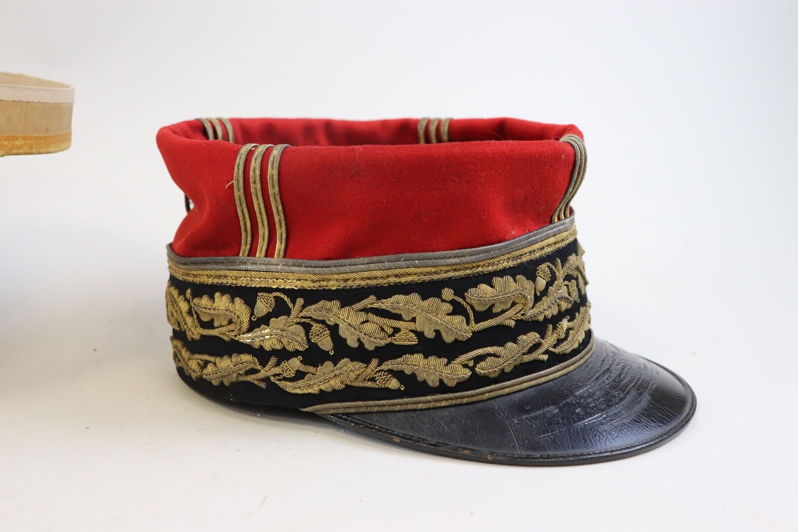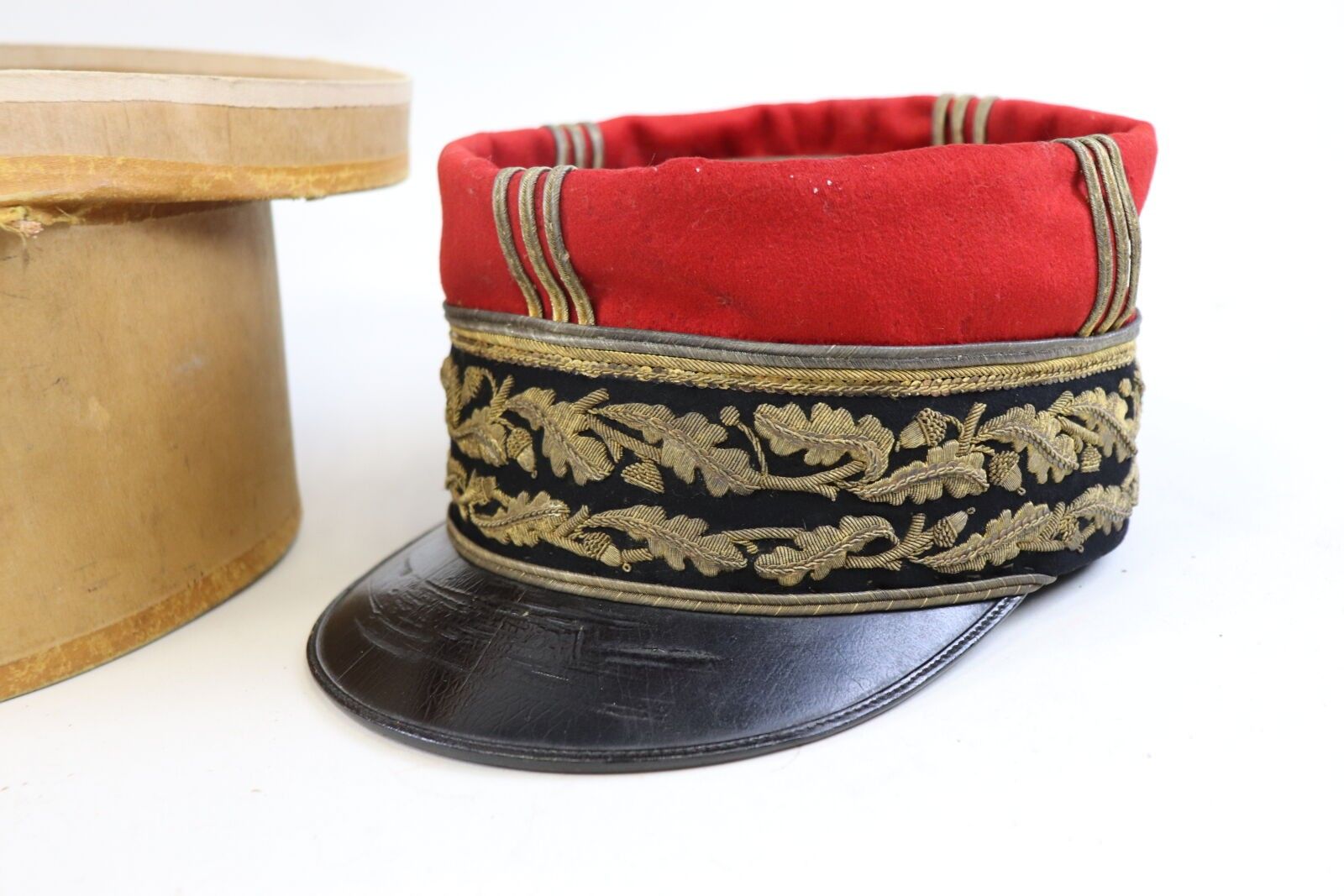 Major General's kepi, in red cloth, headband in black cloth, with double row of embroidered oak leaves, gold braid and bow. Leather visor. Leather and black cloth inner cap. Made by E Bidal Paris. BE With a shaped wooden box (accident to the lid).