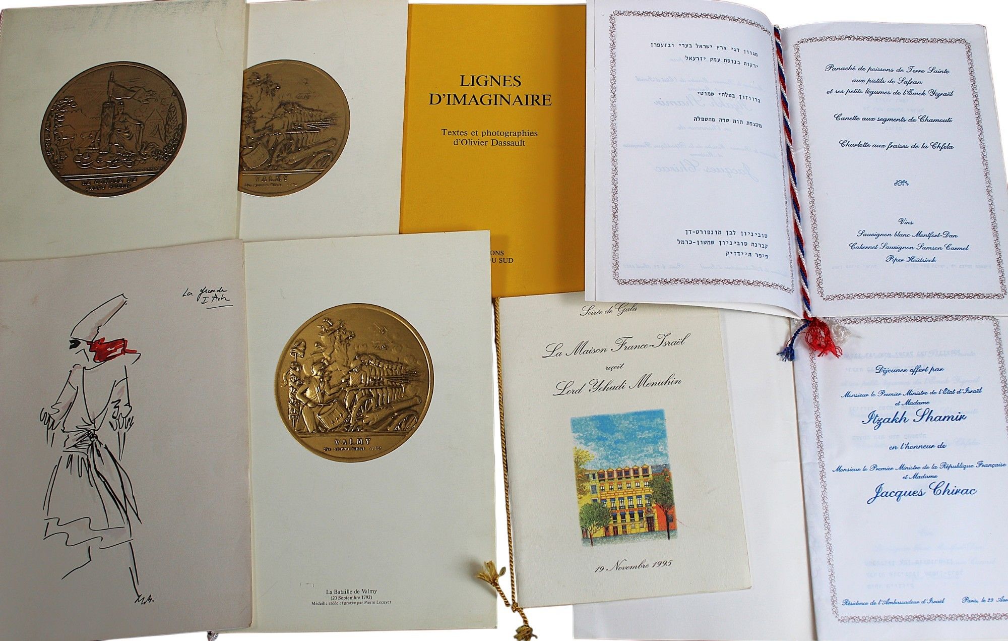 3 MENUS DE L'AMBASSADE D'ISRAEL EN FRANCE et de la MAISON FRANCE-ISRAEL et "Lignes Imaginaire" d'Olivier DASSAULT, textes et photographies de l'auteur, en cahiers et feuillests sous chemise cartonnée jaune,1985,éditions Porte du Sud, n-4, un des 900 exemplaires numéroté avec envoi de l'auteur.