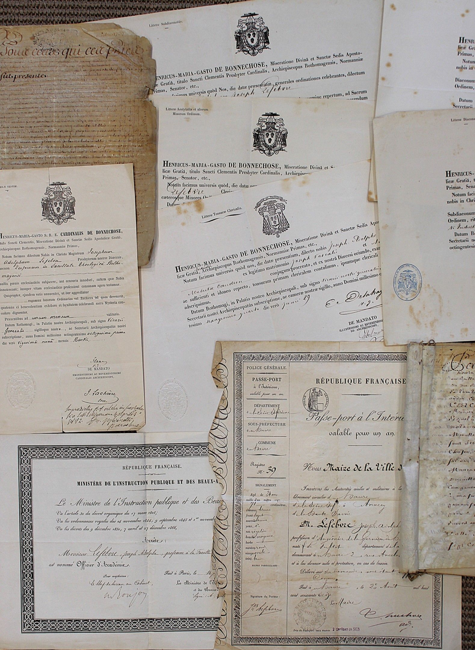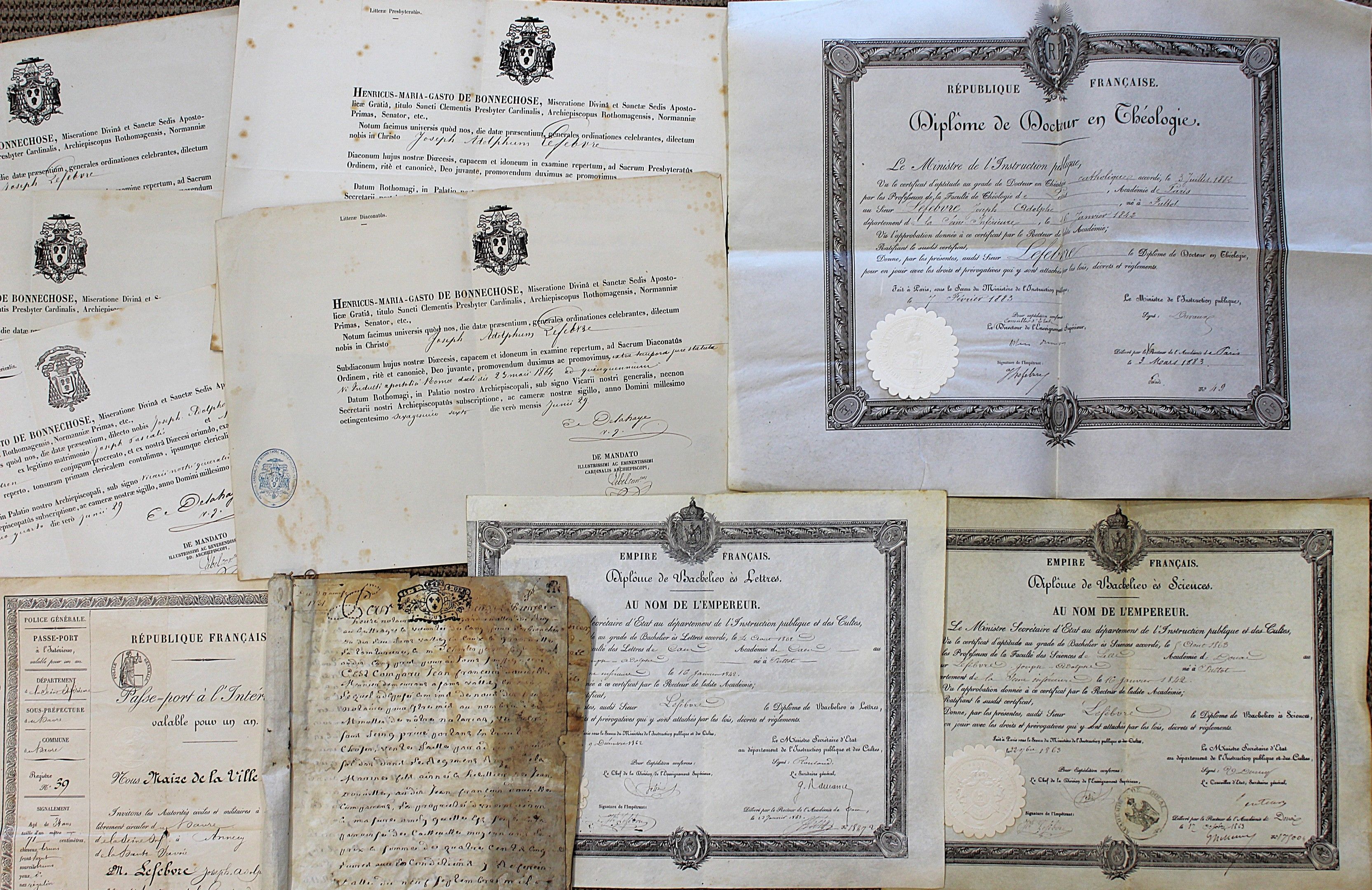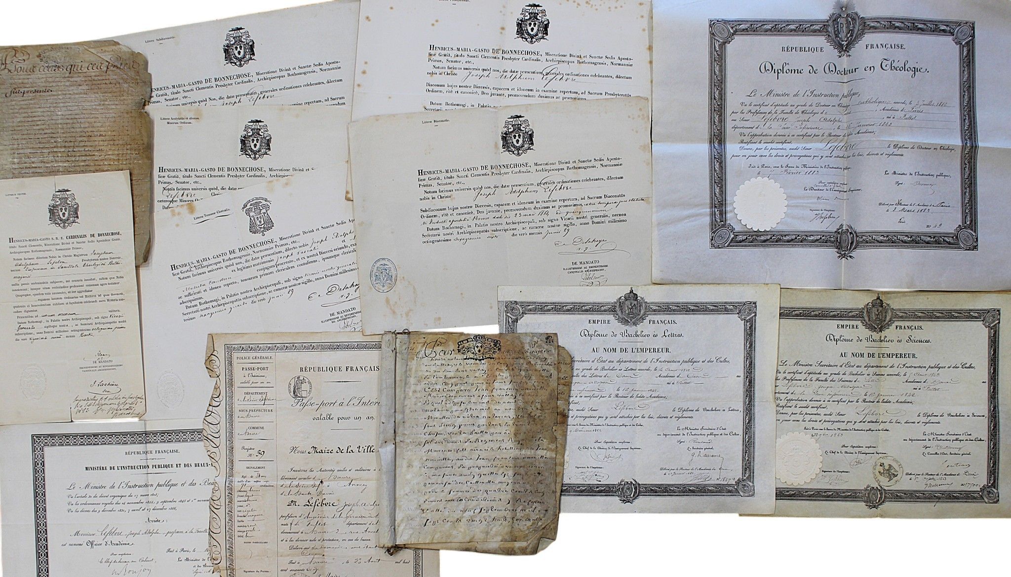 Set of DIPLOMES including: SECOND EMPIRE - DIPLÔME DE BACHELIER ES SCIENCES, on wove paper, 1862, DIPLÔME DE BACHELIER ES SCIENCES, on wove paper, 1863, III REPUBLIQUE - PASSPORT, 1876, III REPUBLIQUE - DIPLÔME D'OFFICIER D'ACADEMIE, on vellum, 1884, III REPUBLIQUE - DIPLOMA OF DOCTOR IN THEOLOGY, on vellum, 1883, various XVIIIth NOTARY ACTS and CATHOLIC CHURCH - 6 RELIGIOUS ACTS from the archdiocese of Rouen, 1920s.