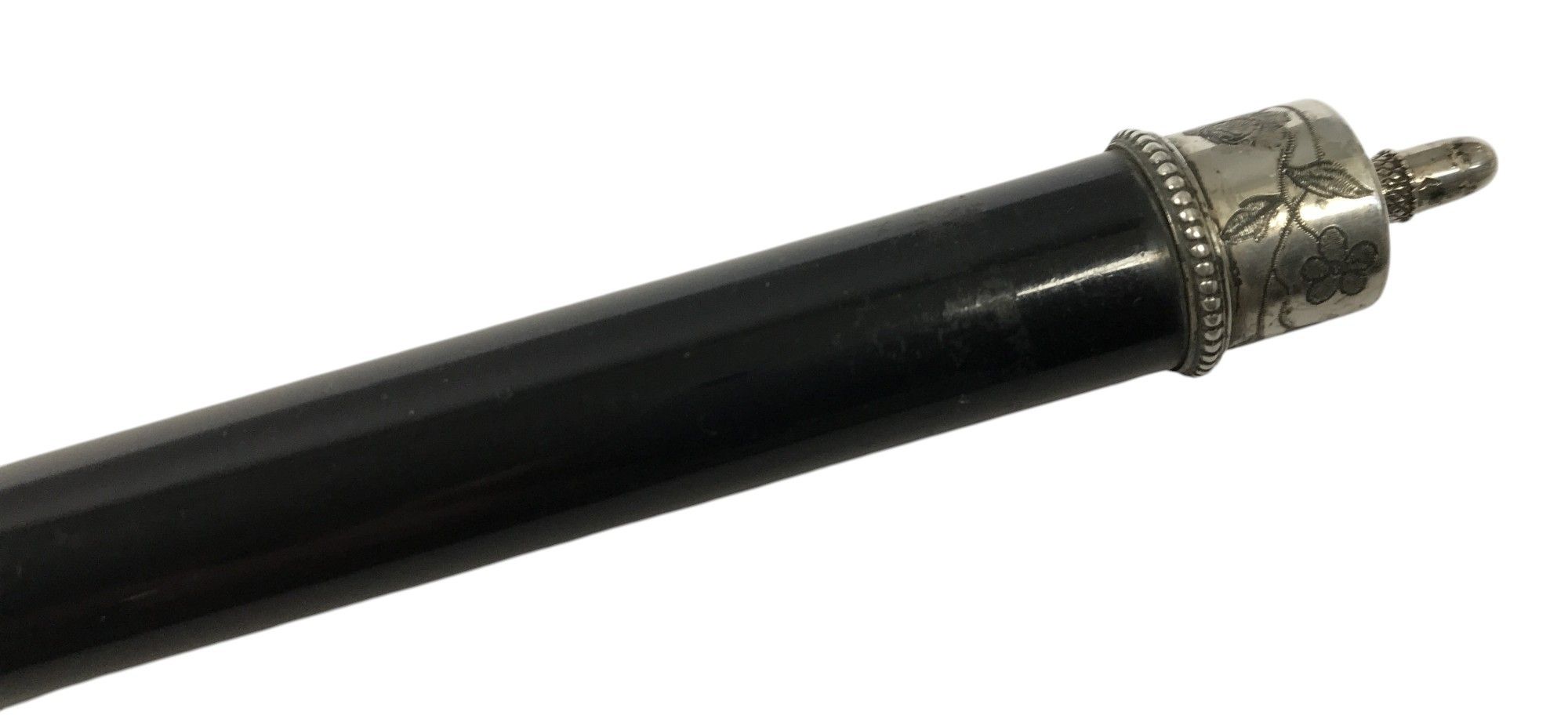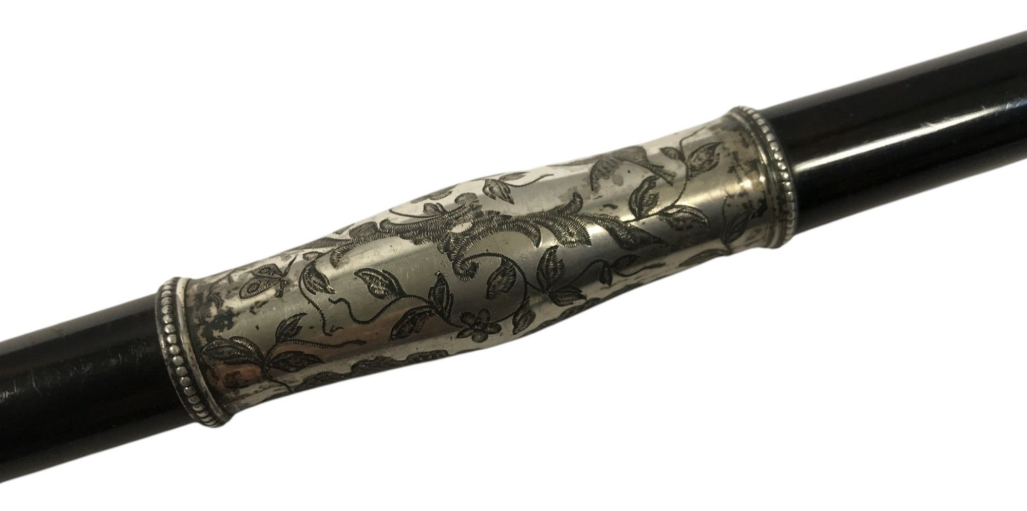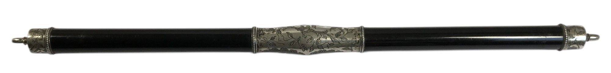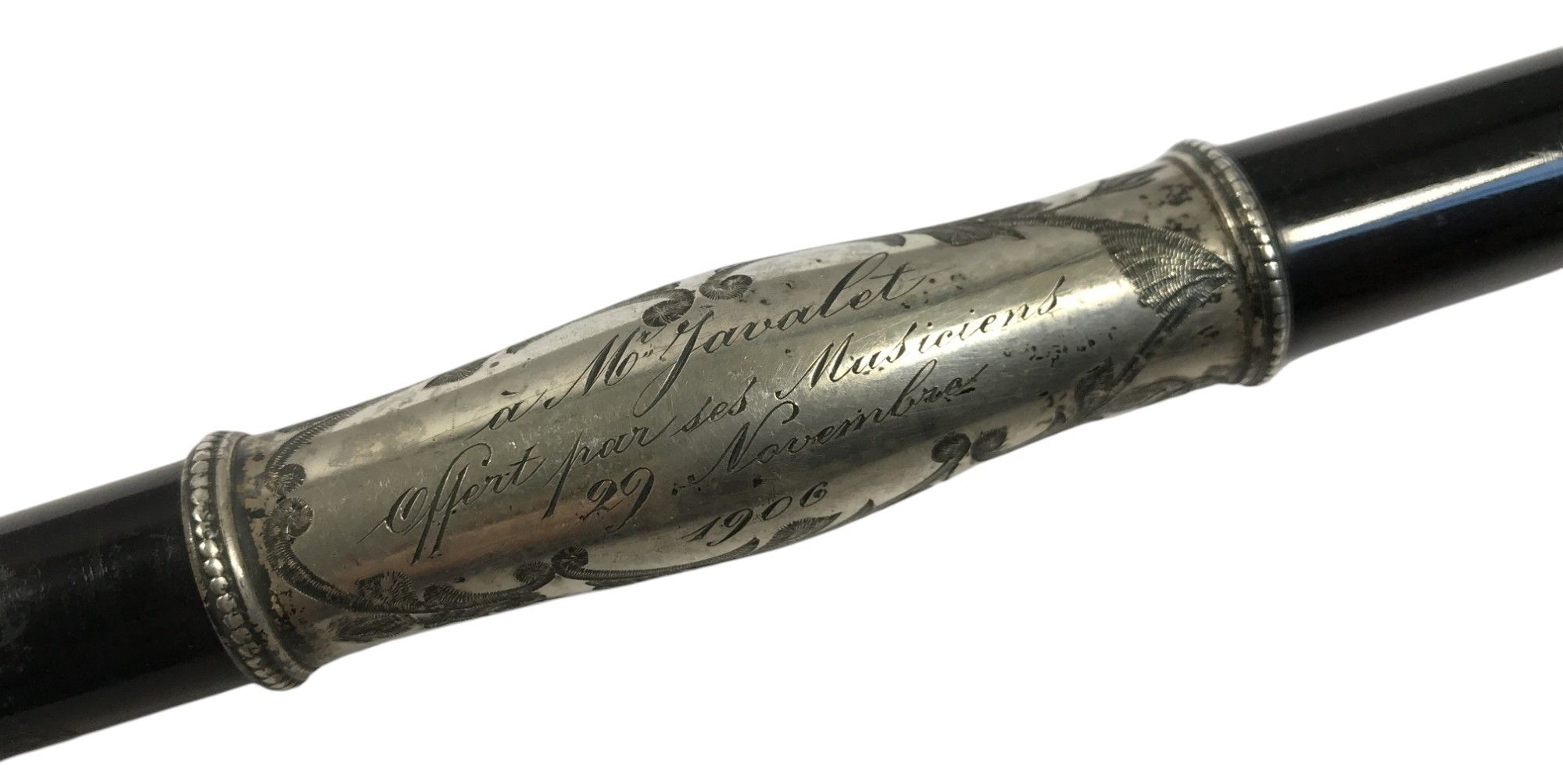 CONDUCTOR'S RING, ebony with silver-plated metal mount engraved with foliate scrolls, domed central trim engraved in a 4-line cartouche in the centre "to Mr Javalet / offered by his Musicians / 29 November /1906", length: 39 cm.