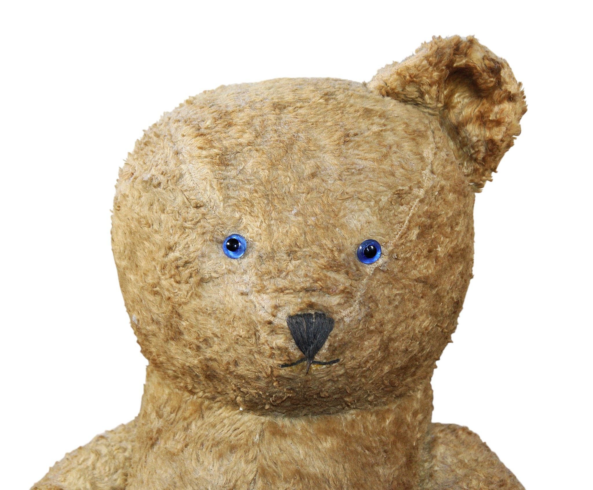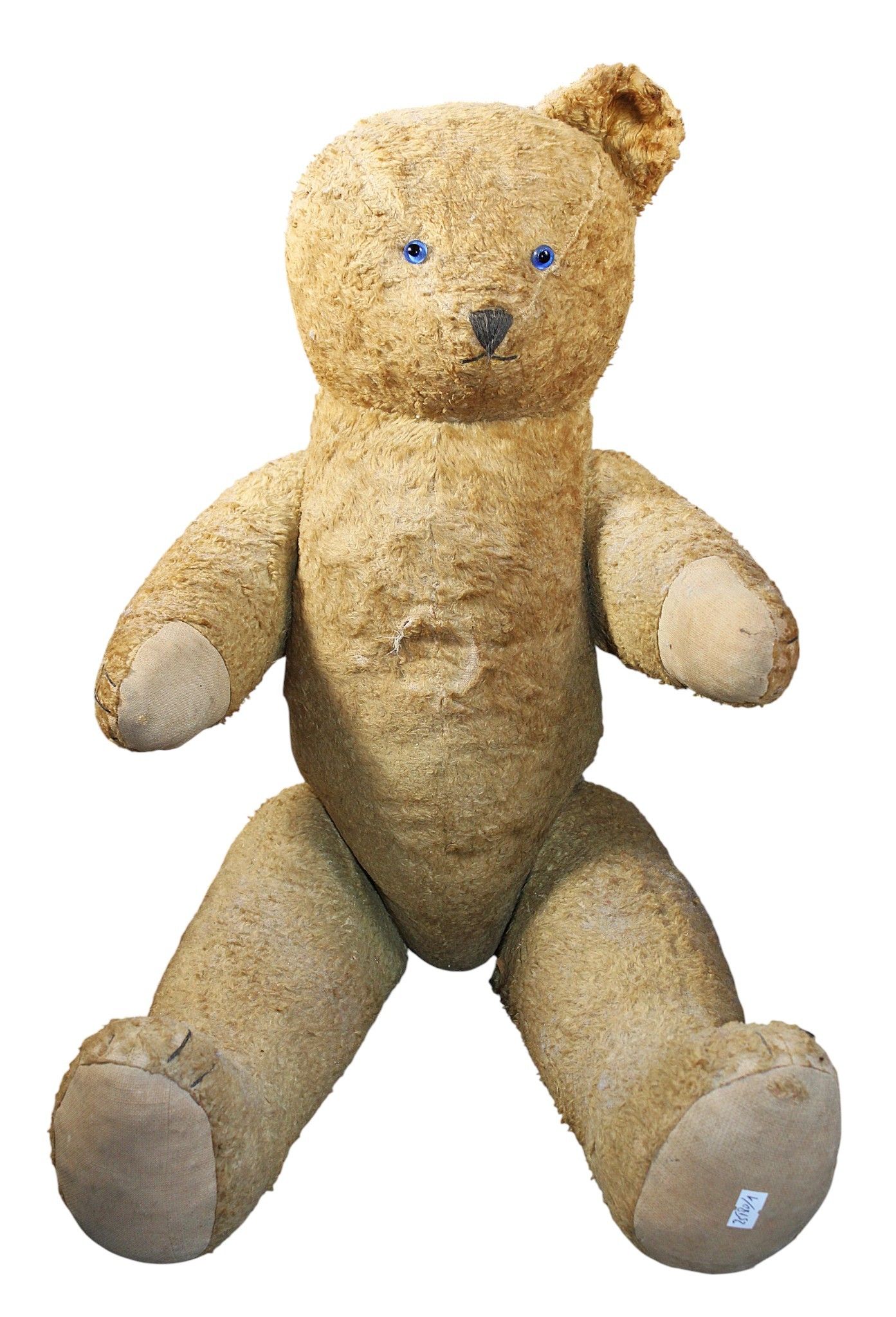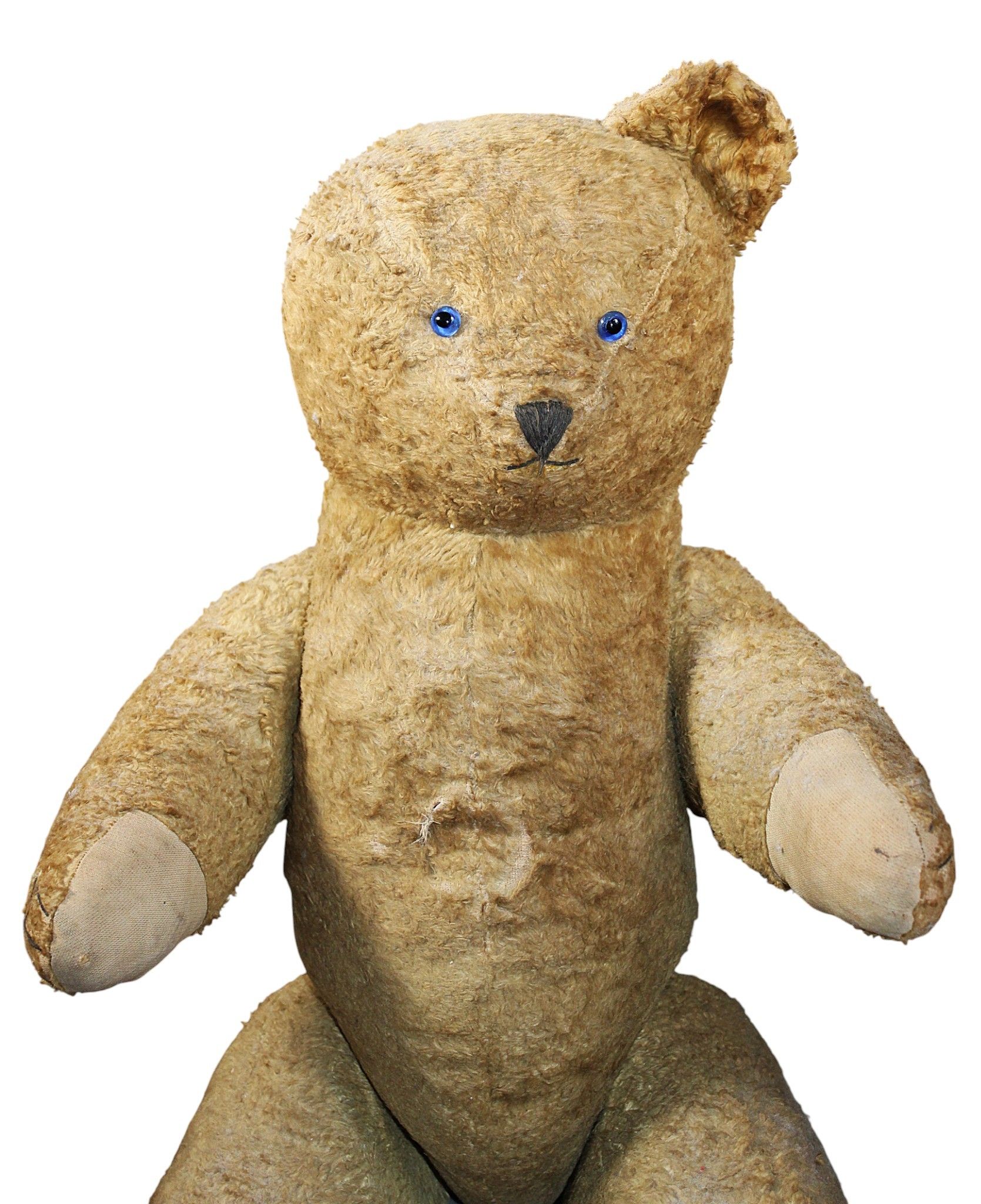 Old and large plush BEAR, blue glass eyes, height: 78 cm. One ear missing.