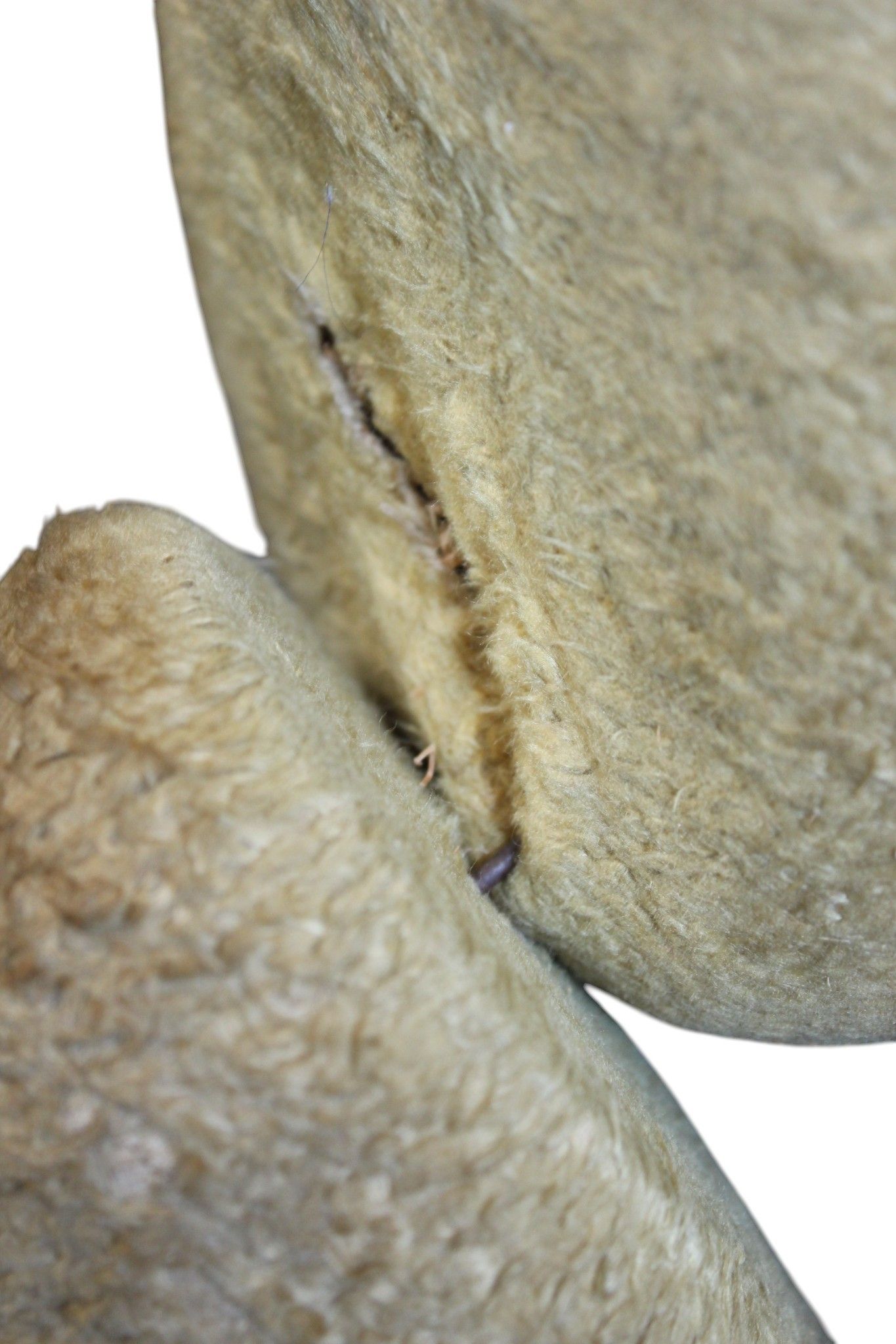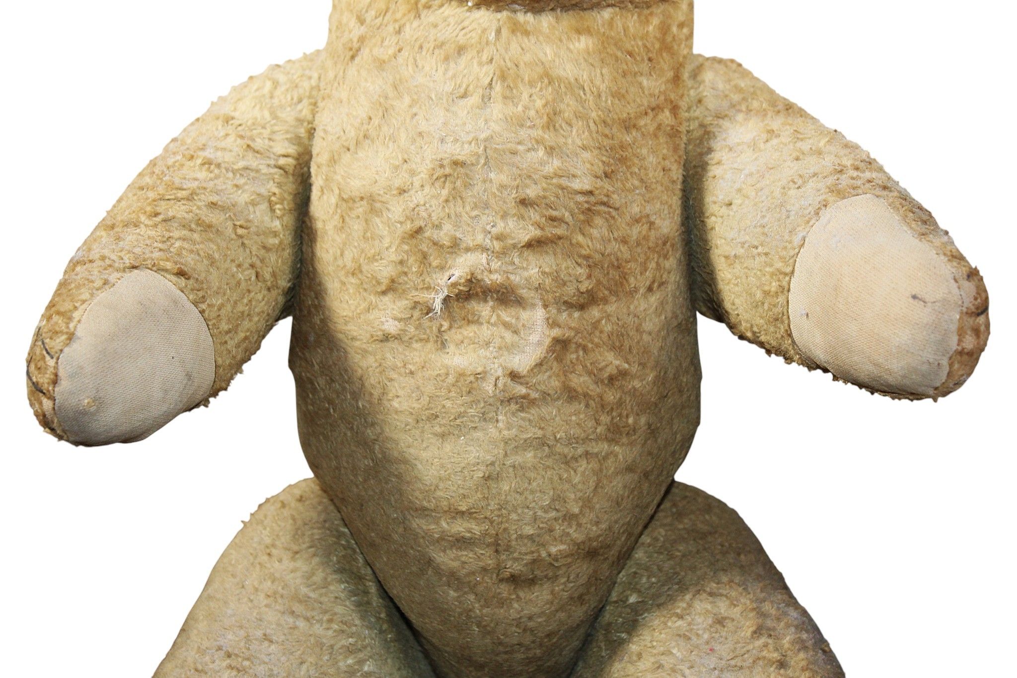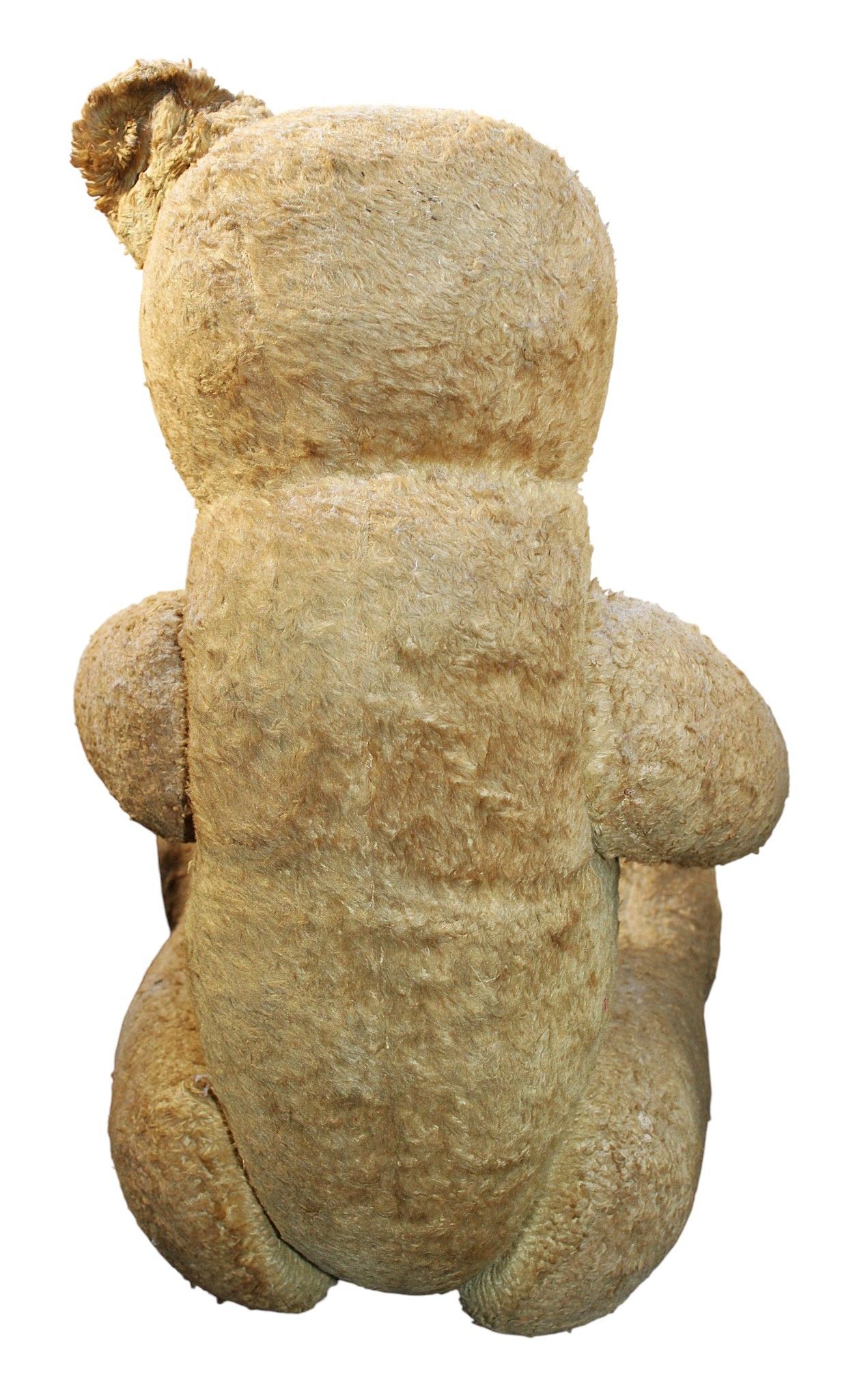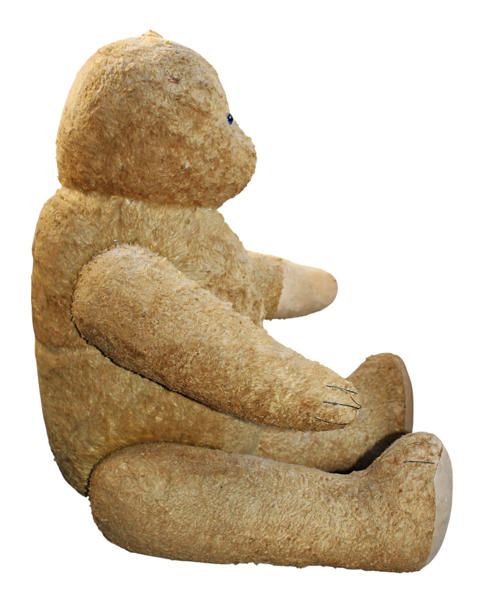 Old and large plush BEAR, blue glass eyes, height: 78 cm. One ear missing.