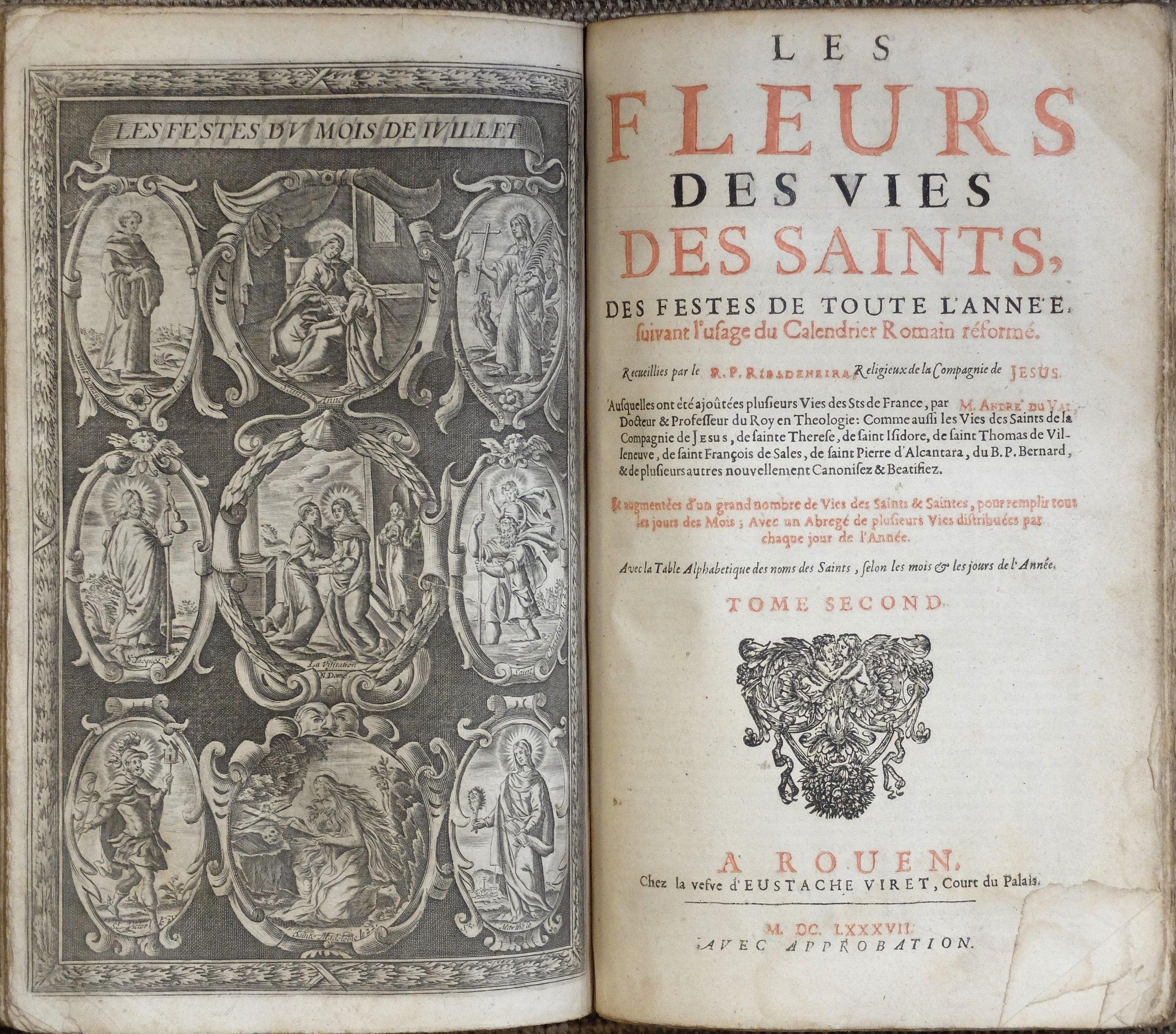 "Les fleurs des vies des saints des festes de toute l'année...", 2 volumes in one, 703 + 716 pages, first page missing, first 30 pages missing without corners, 1687,Vefve d'Eustache Viret à Rouen, in-folio,