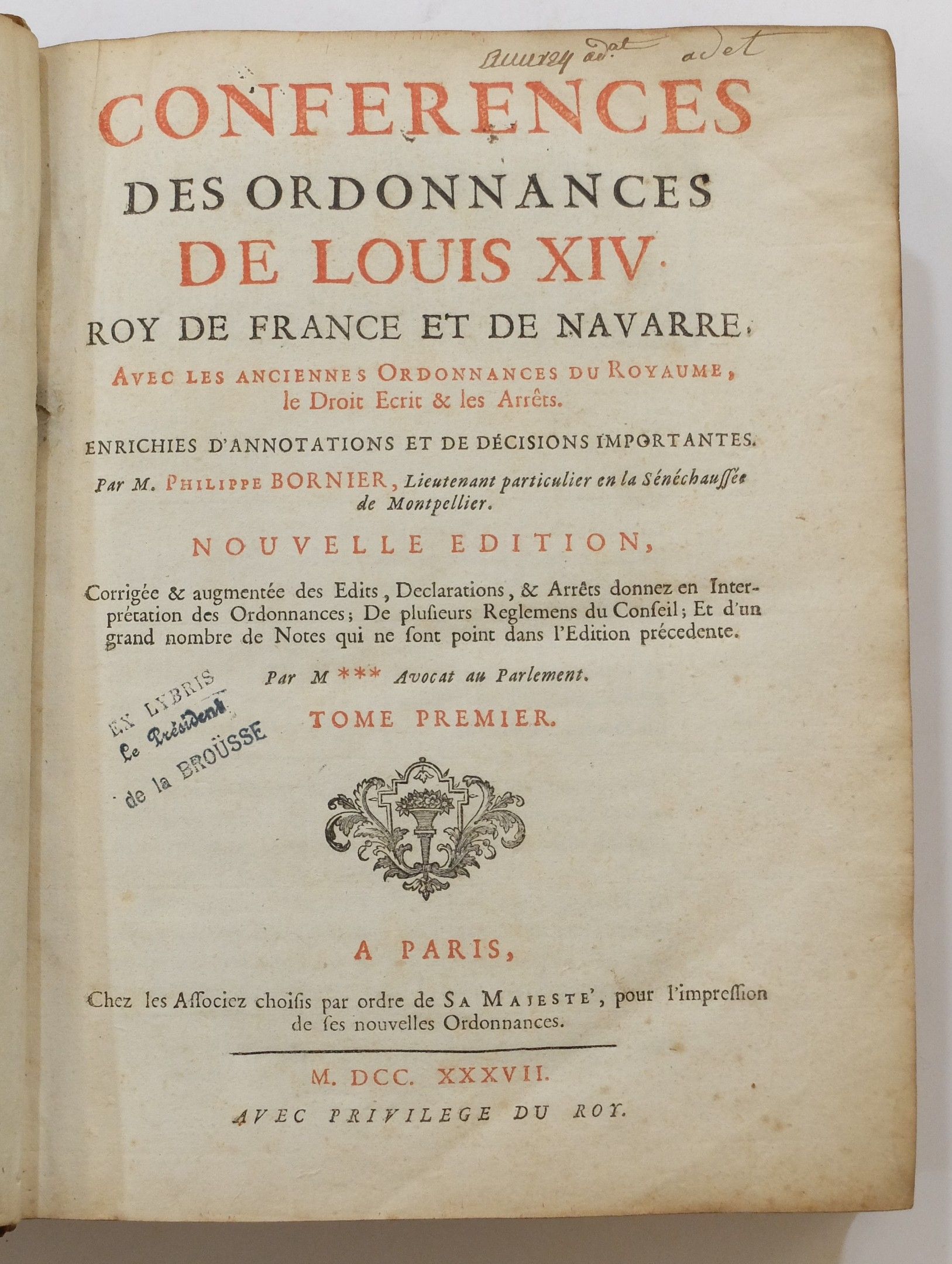 Philippe BORNIER, "Conférences des ordonnances de Louis XIV roy de France et de navarre", 2 volumes, 1737, by the associates chosen by order of His Majesty, in-4, full contemporary calf binding in fair condition, spine boxed.