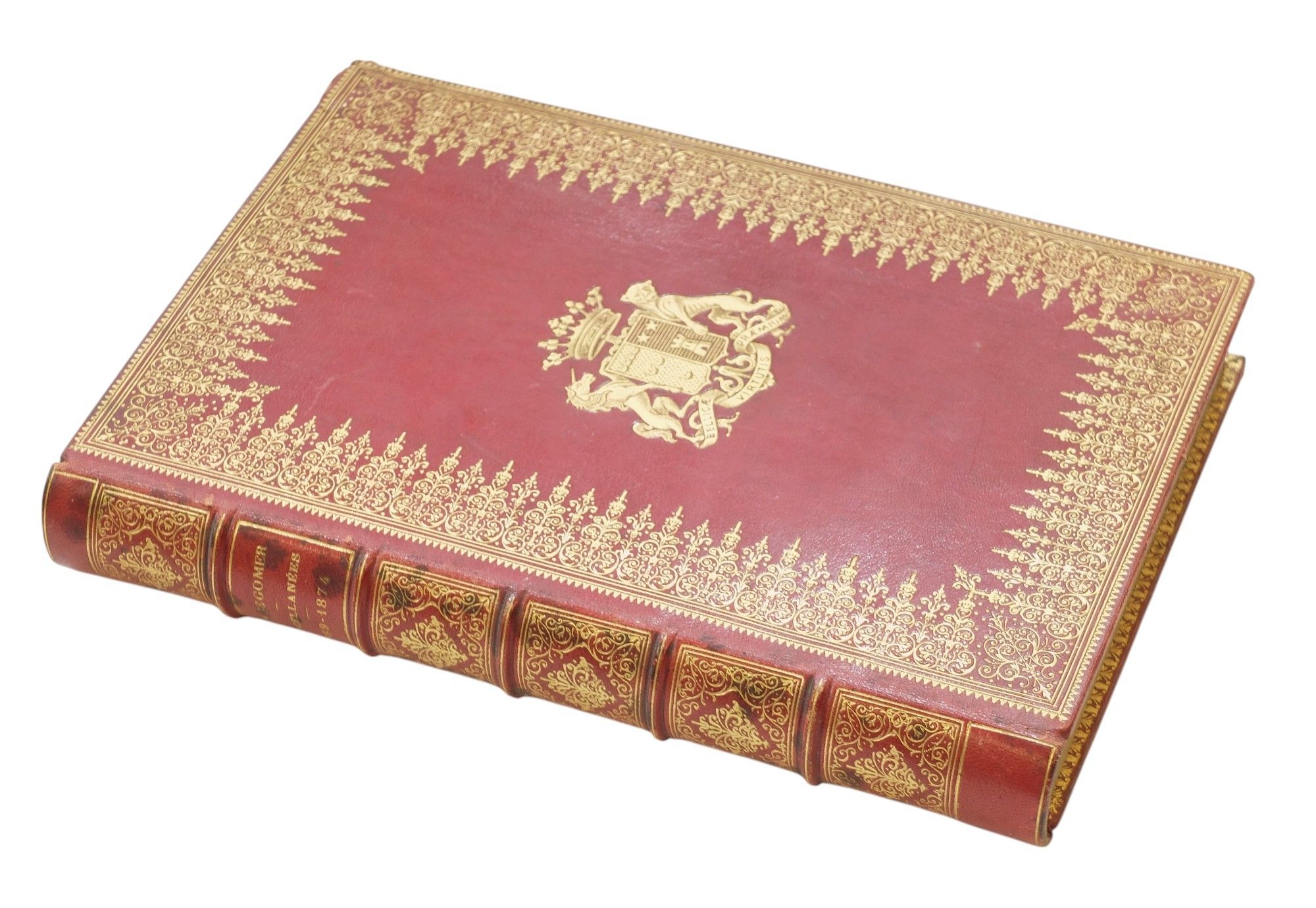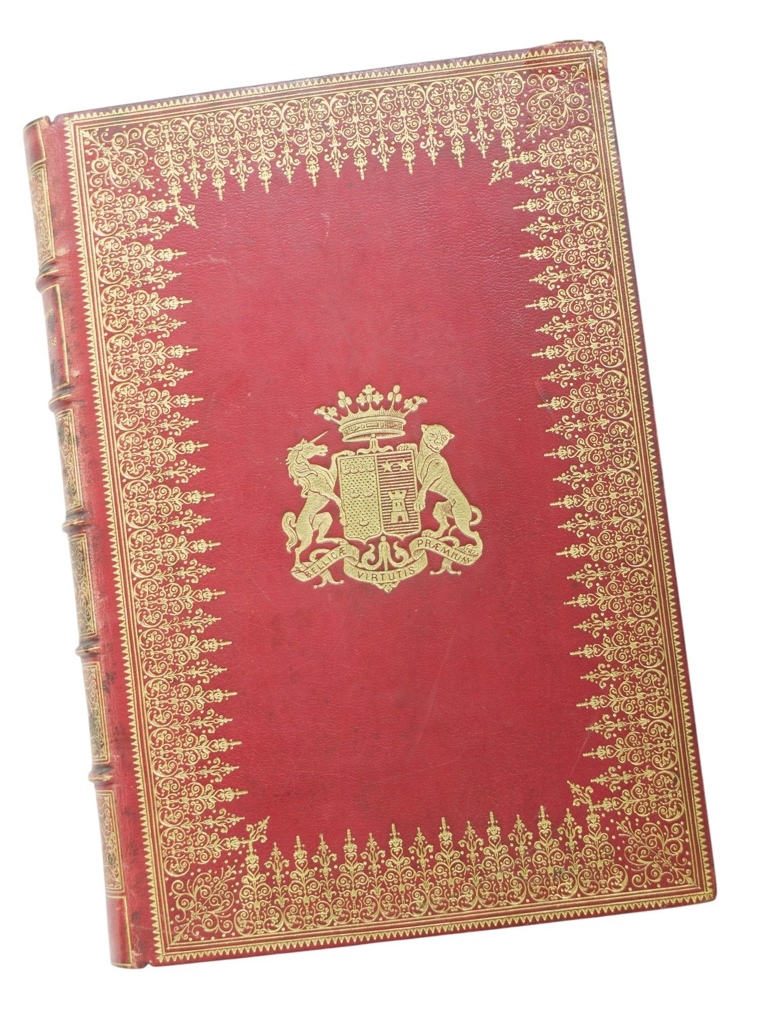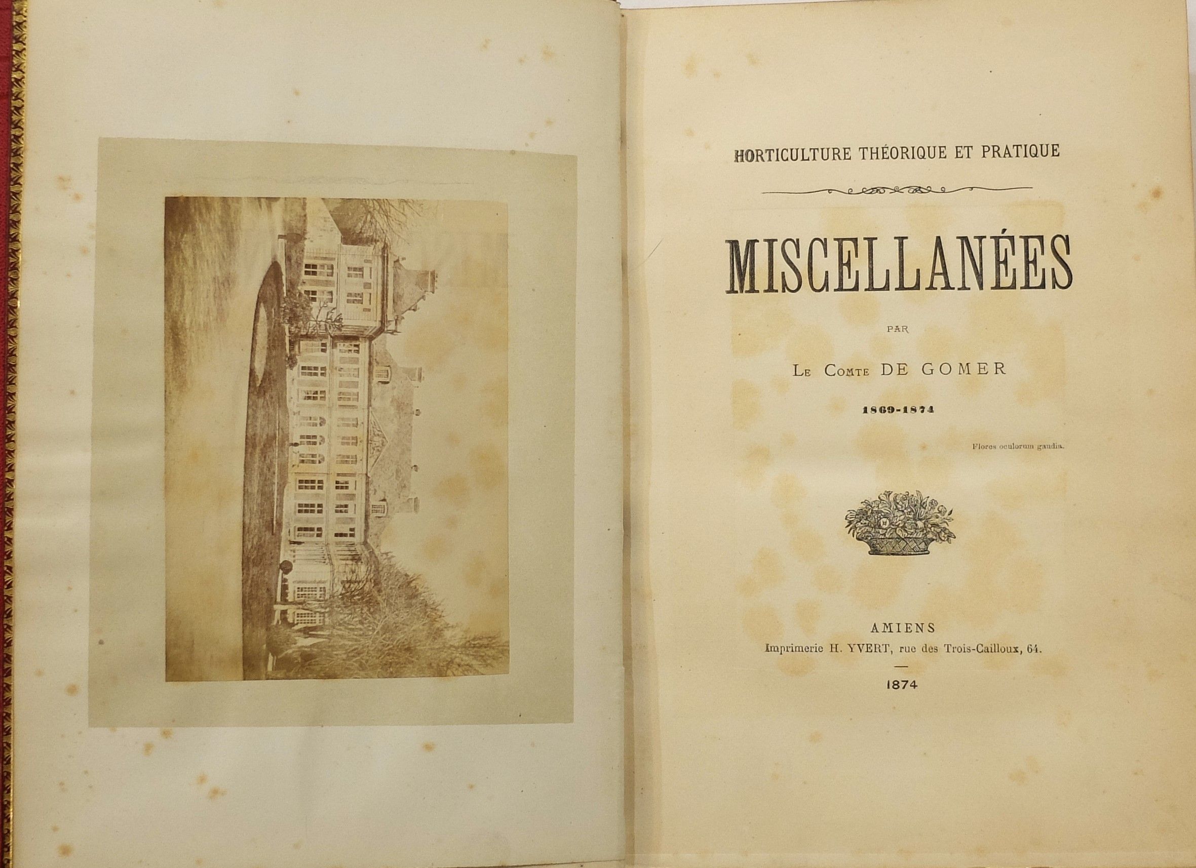 [BOTANY] - Comte DE GOMER, "Miscellanées", 346 pages, illustrations hors texte, 1874, imprimerie Yvert à Amiens, in-4, bound in red morocco, first and last boards with arms under ducal crown with motto: "Bellicae Virtutis Praemium", spine ribbed with boxes, (rubbing and a few stains), spotting.