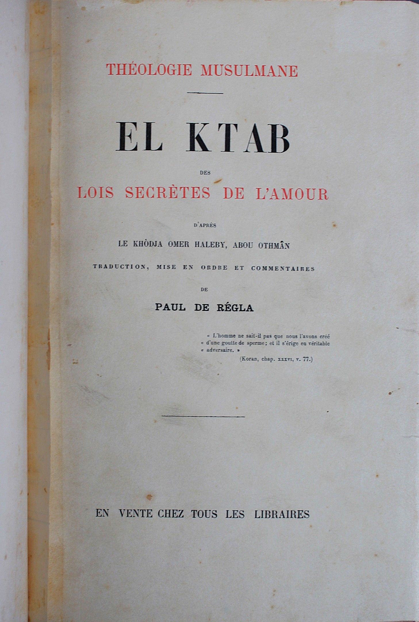 Paul de REGLA, "El ktab des lois secrètes de l'amour", théologie musulmane d'après le khôdja omer haleby abou othmân, 288 pages, undated circa 1900, in-8, half brown leather binding.