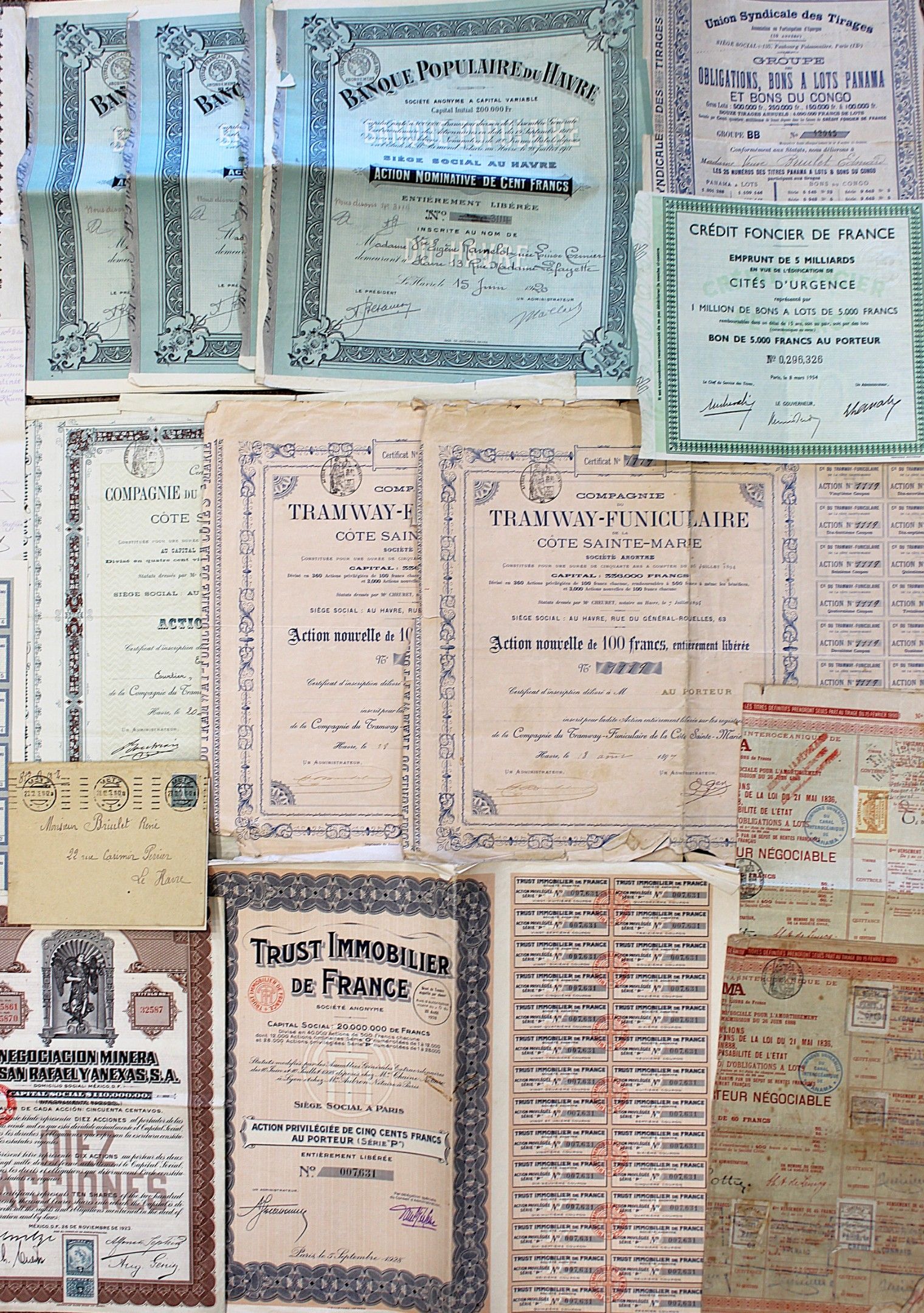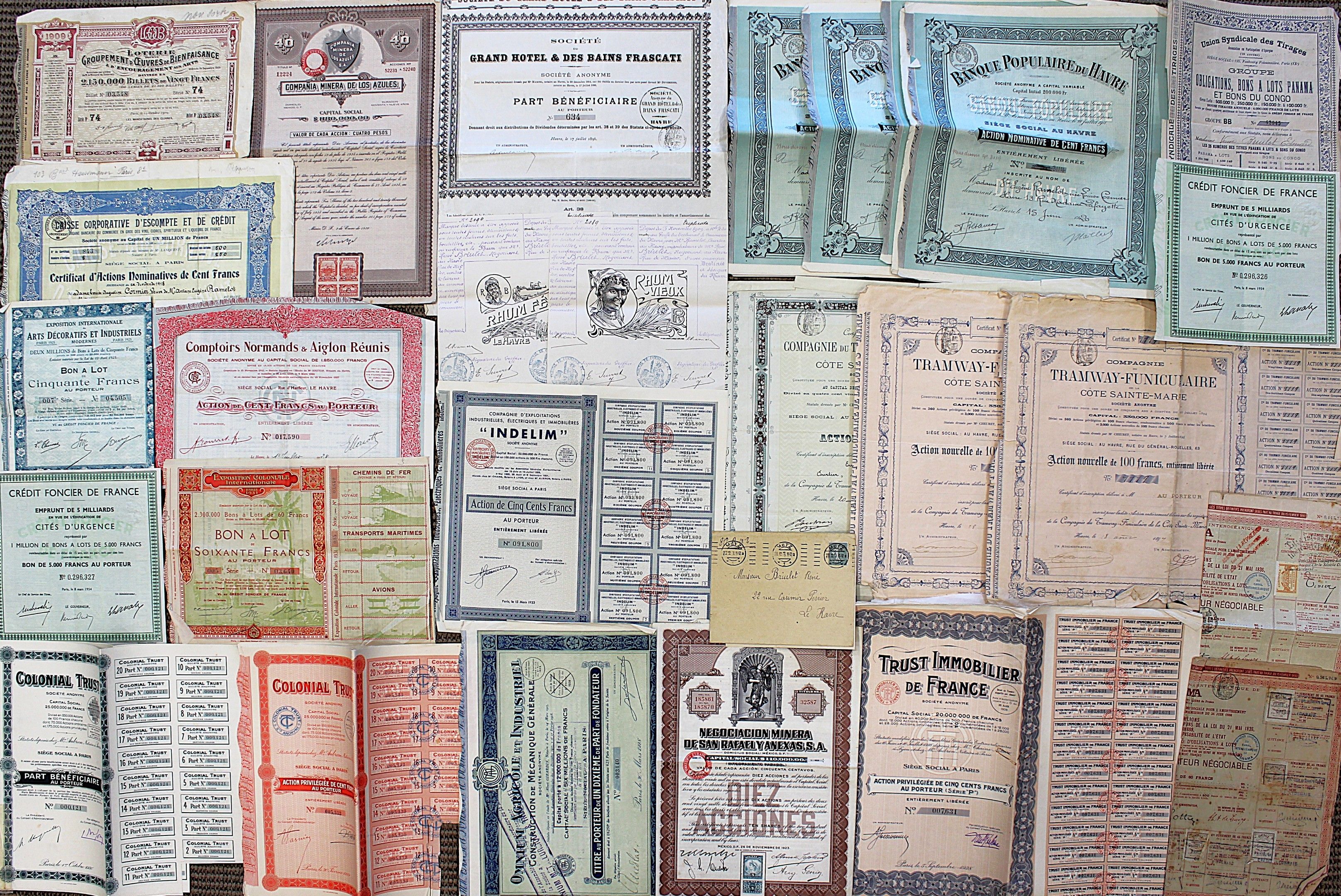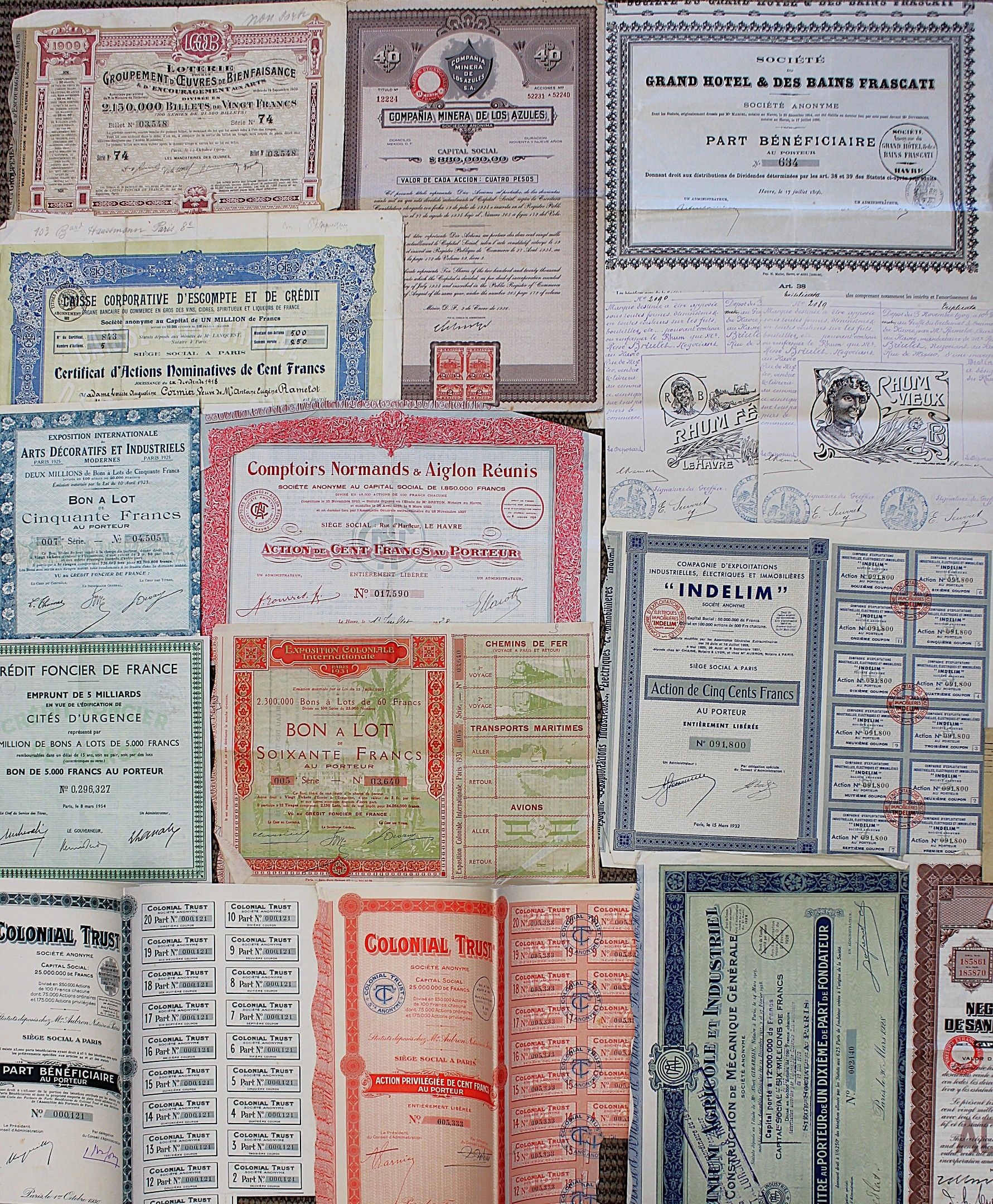Set of SHARES including : GRAND HOTEL & DES BAINS FRASCATI, BANQUE POPULAIRE DU HAVRE x 15, COMPTOIR NORMANDS & AIGLON REUNIS, INDELIM x 3, COMPAGNIE DES TRAMWAY-FUNICULAIRE DE LA COTE SAINTE-MARIE LA HAVRE x 3, CAISSE COOPERATIVE D'ESCOMPE ET DE CREDIT, CREDIT FONCIER DE FRANCE, COMPANIA MINERA DE LOS AZULES x 2, EXPOSITION COLONIALE INTERNATIONALE x 7, NEGOCIACION MINERA DE SAN RAFAEL Y ANEXAS SA x 2, CONSTRUCTION DE MECANIQUE GENERALE, COLONIAL TRUST (2 different models) x 25, TRUST IMMOBILIER DE FRANCE (two different models) x 5...