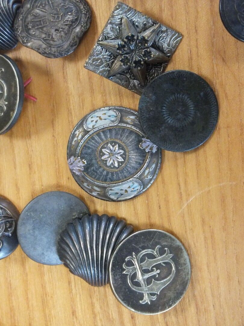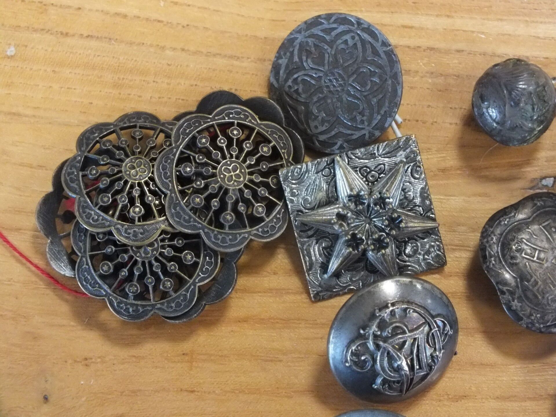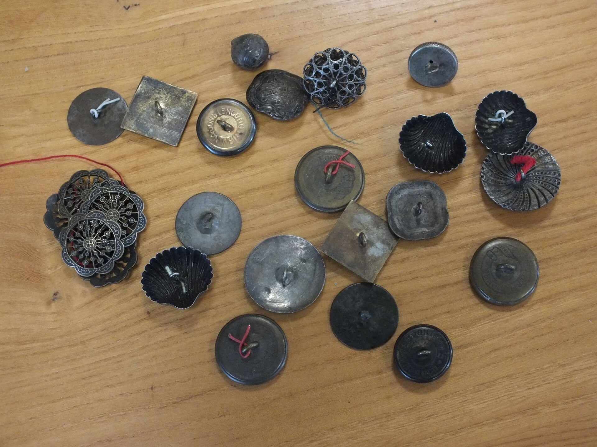 Batch of metal buttons, including scallop shells, with chased, filigree or monogram decorations
