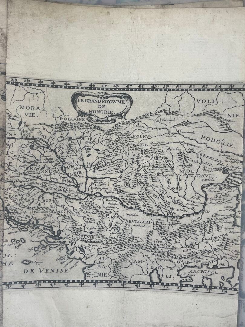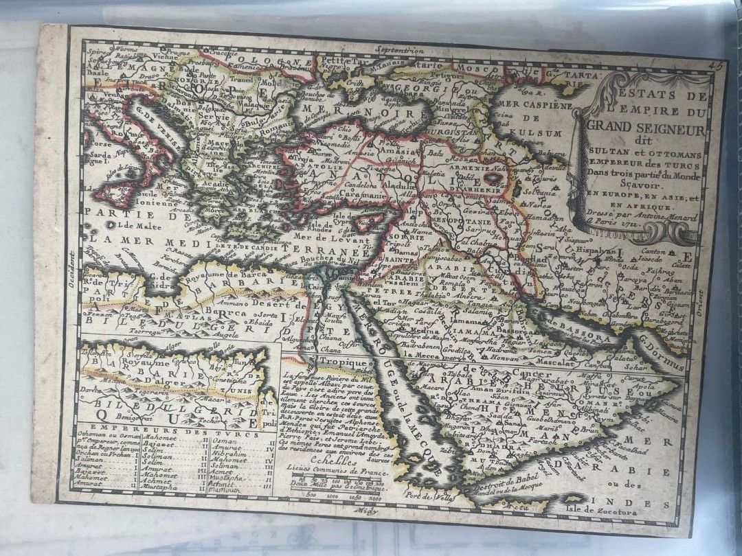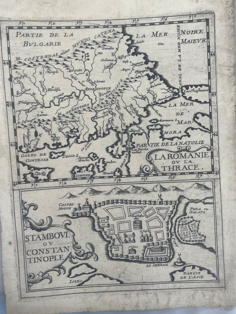 "Estats de L'Empire du grand seigneur dit Sultan et ottomans Empereur des turcs dans trois parties du monde, scavoir en Europe, Asie, et en Afrique" (Estates of the Empire of the great lord called Sultan and Ottoman Emperor of the Turks in three parts of the world, namely Europe, Asia and Africa)