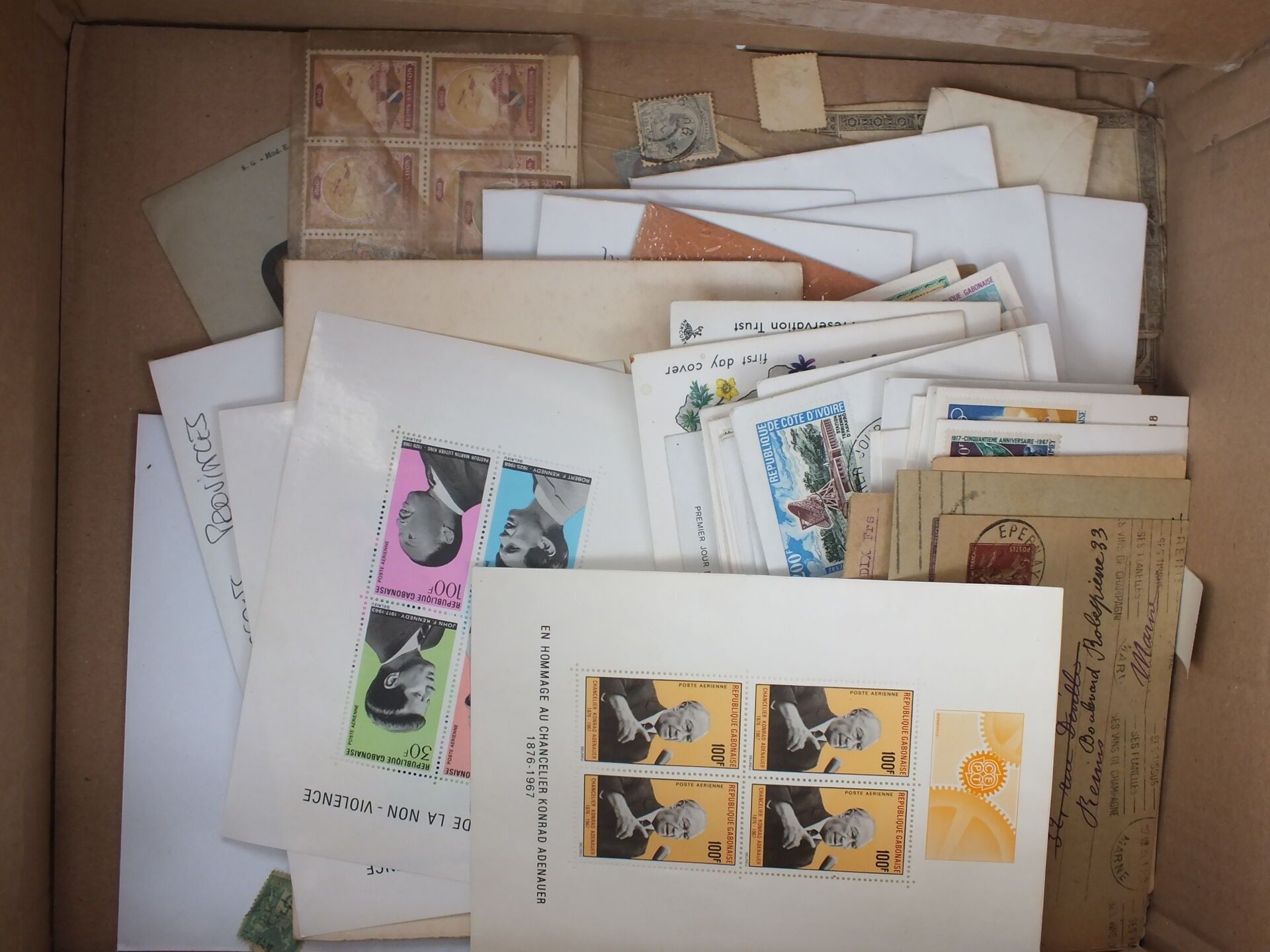 Stamp box including 1 black album, sheets, 1st day covers and miscellaneous to sort.