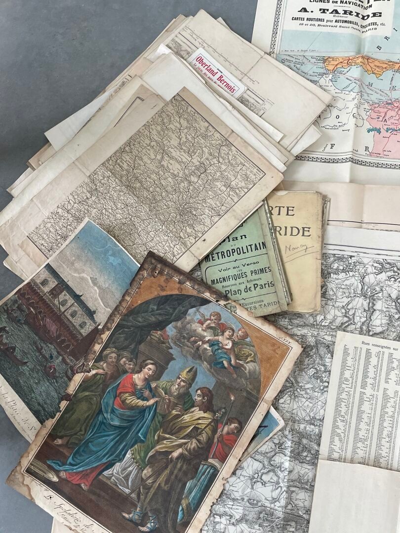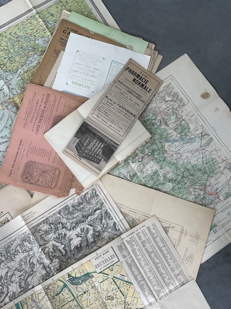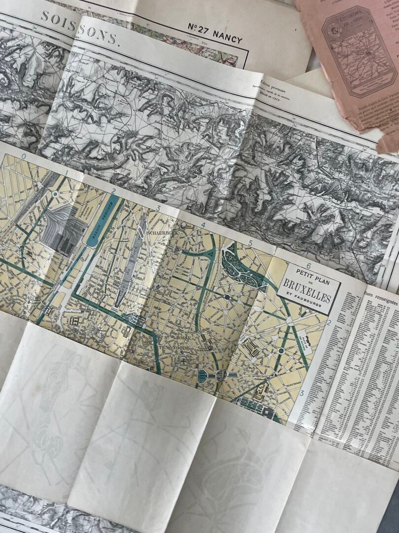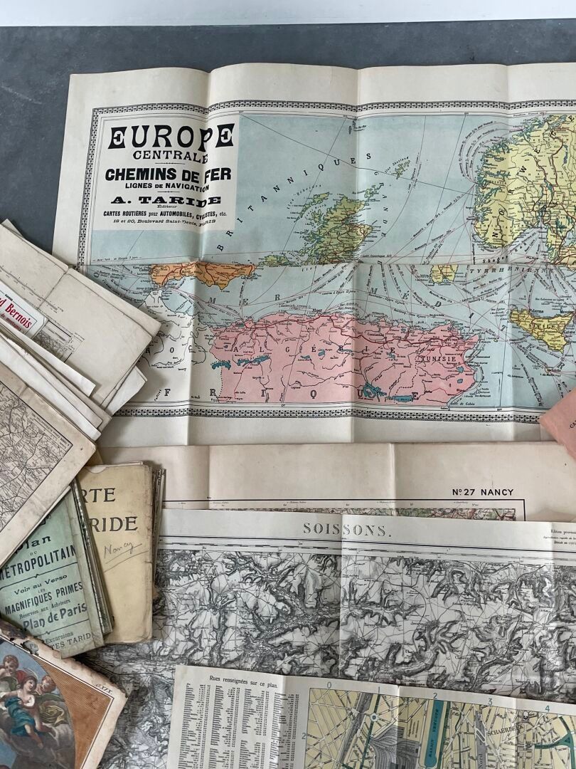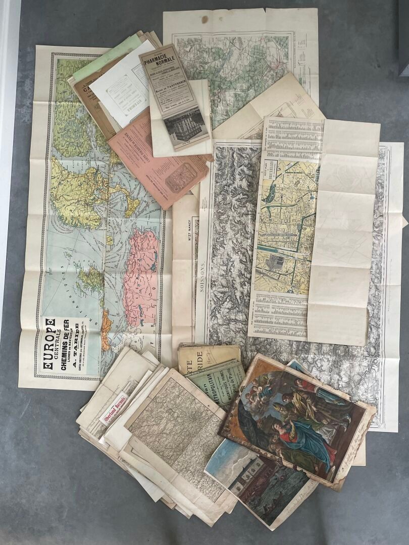 Lot of miscellaneous documents mainly comprising maps including "Europe centrale chemins de fer, A. TARDIE", map of "Ramouillet, Maison Andriveau - Goujon", "Carte de France et des frontières type 1912, N.27, Nancy", "Petit plan de Bruxelles et Faubourgs".