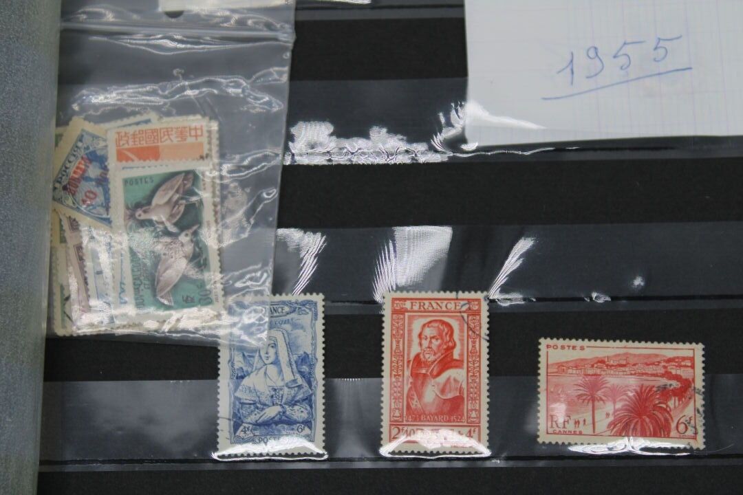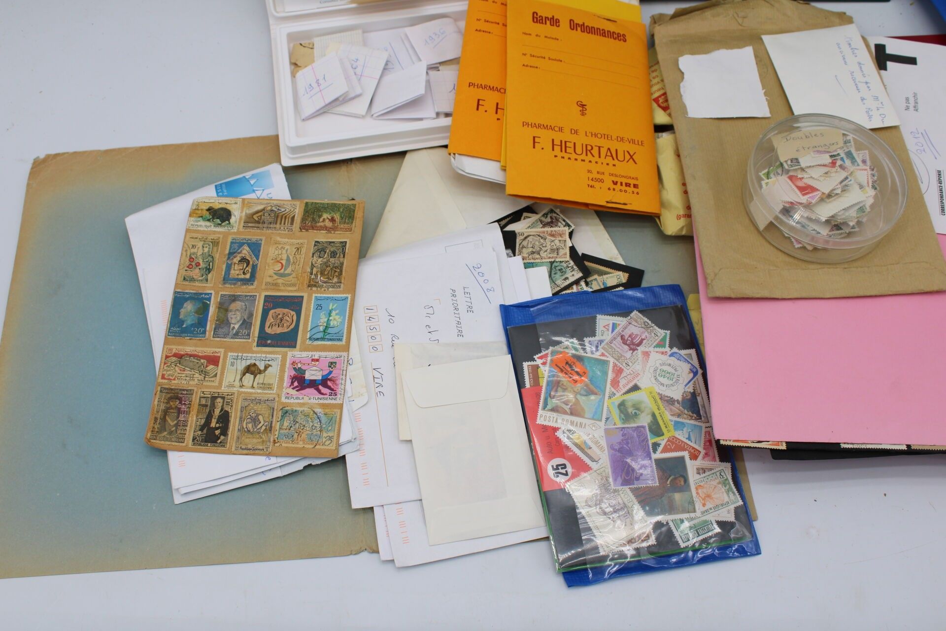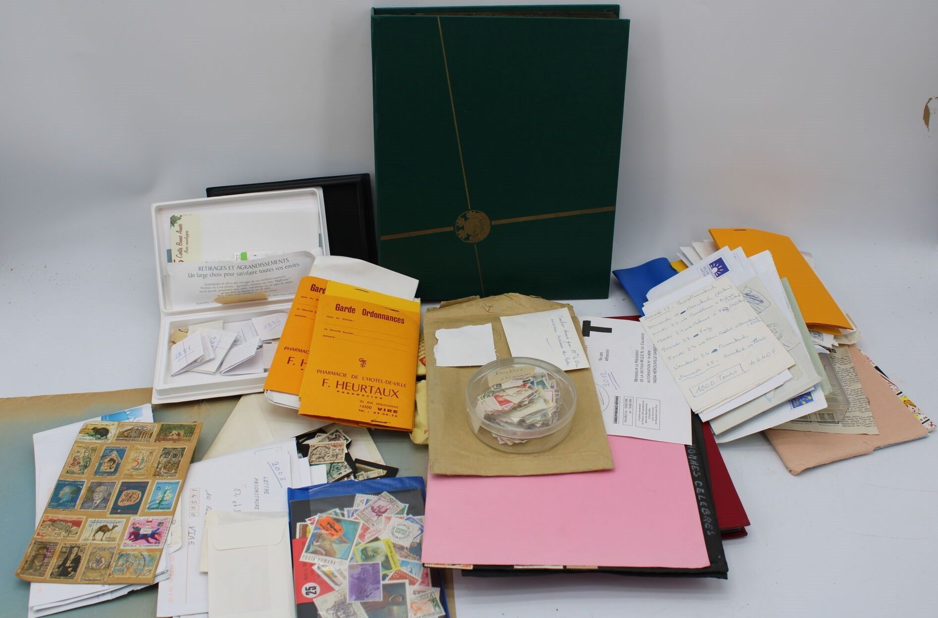 In a green bag, two albums, one of which is a Yvert and Tellier, and a large number of loose items from all over the world. Many are corners of envelopes to be removed.