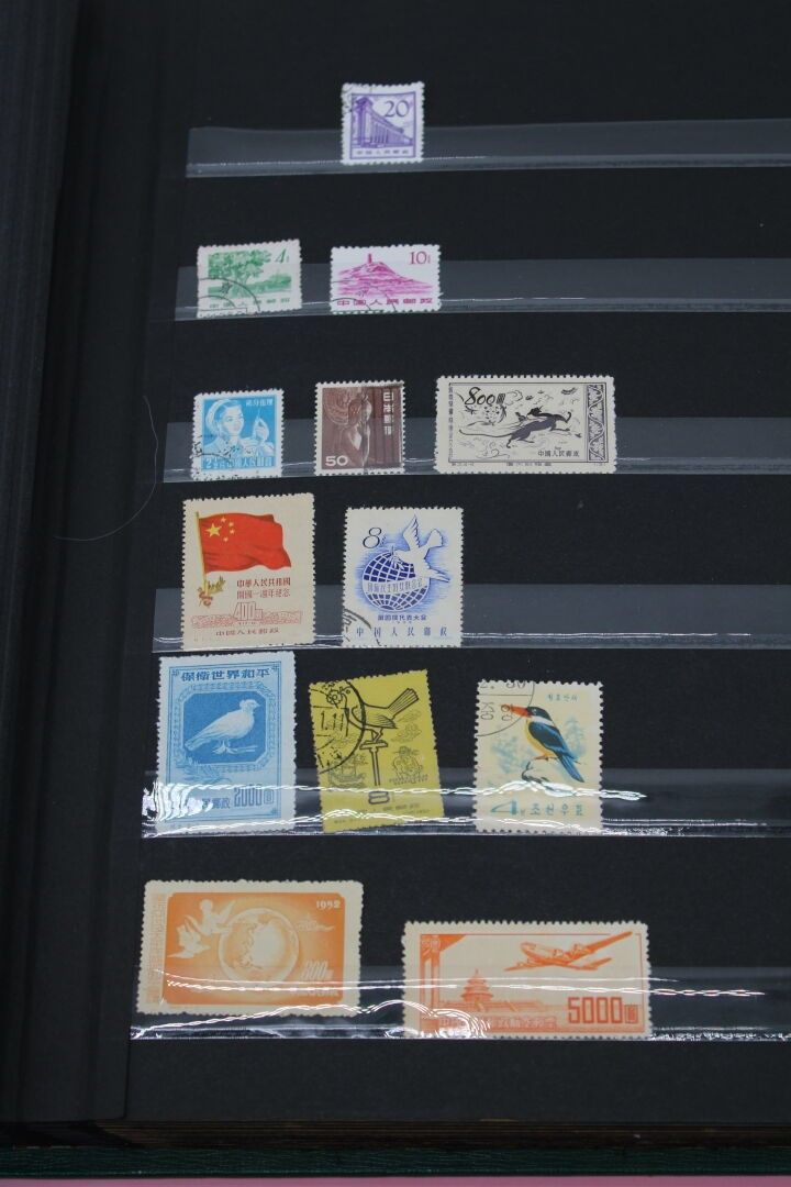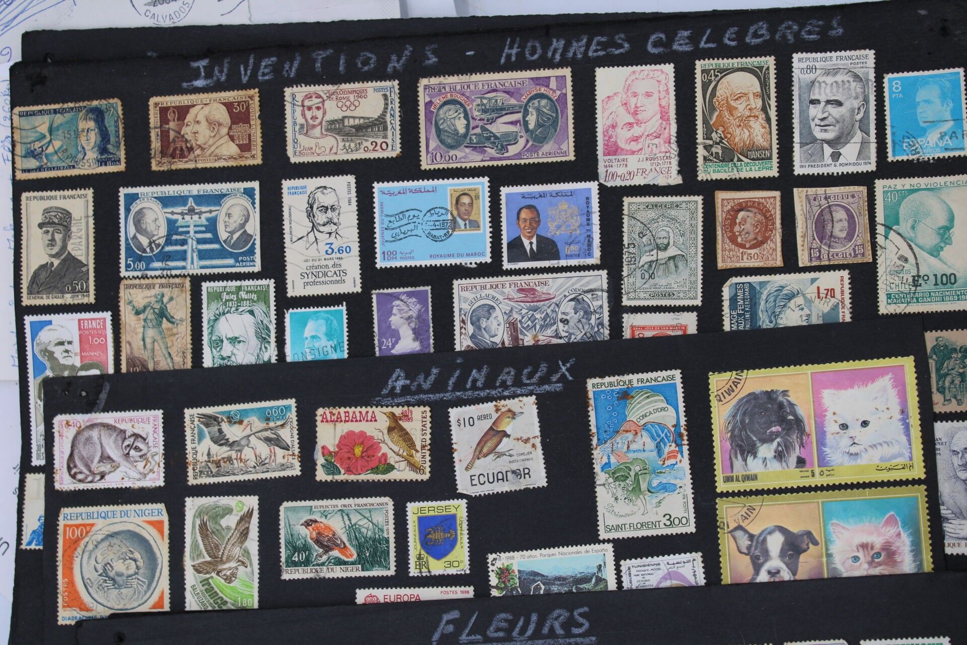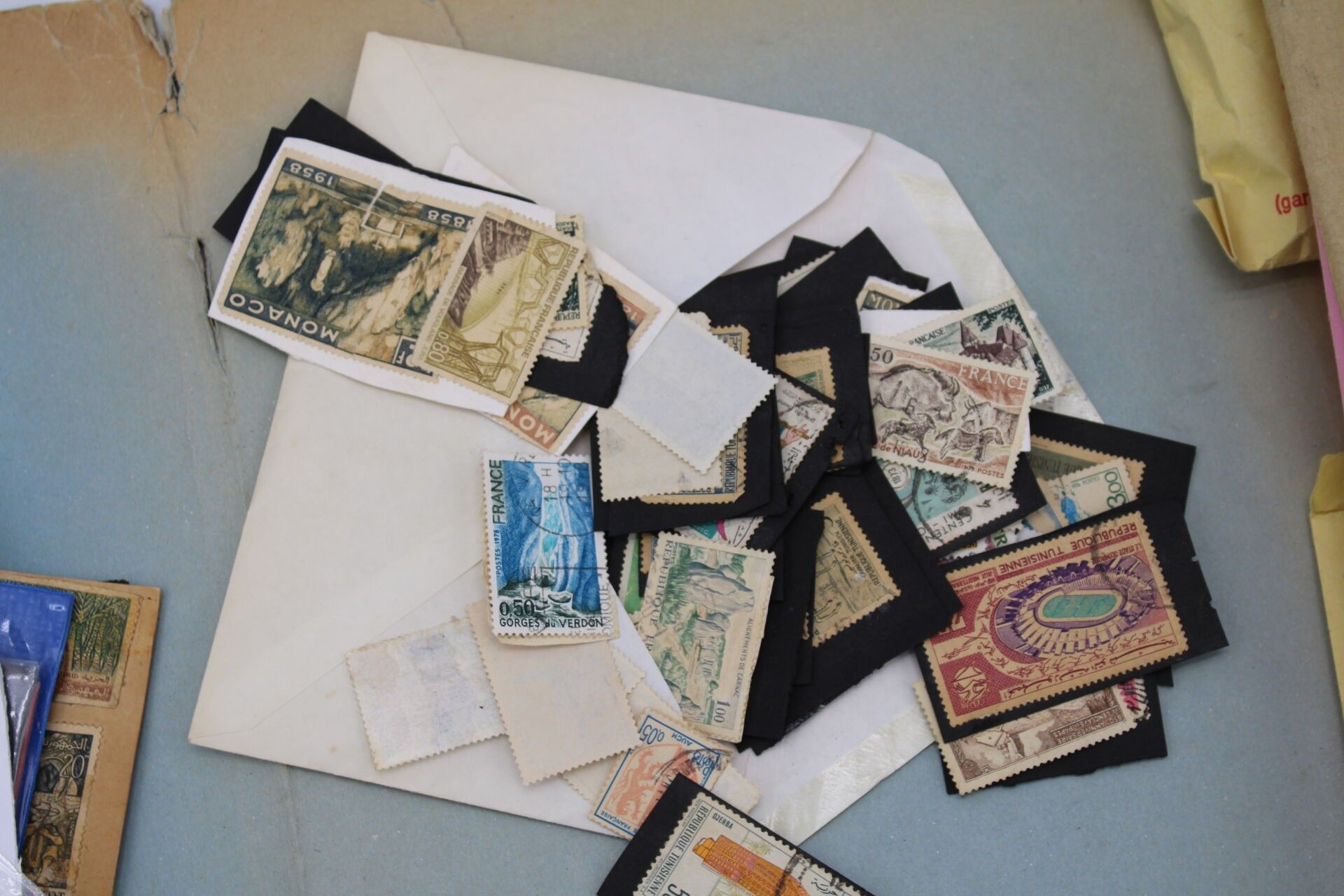 In a green bag, two albums, one of which is a Yvert and Tellier, and a large number of loose items from all over the world. Many are corners of envelopes to be removed.
