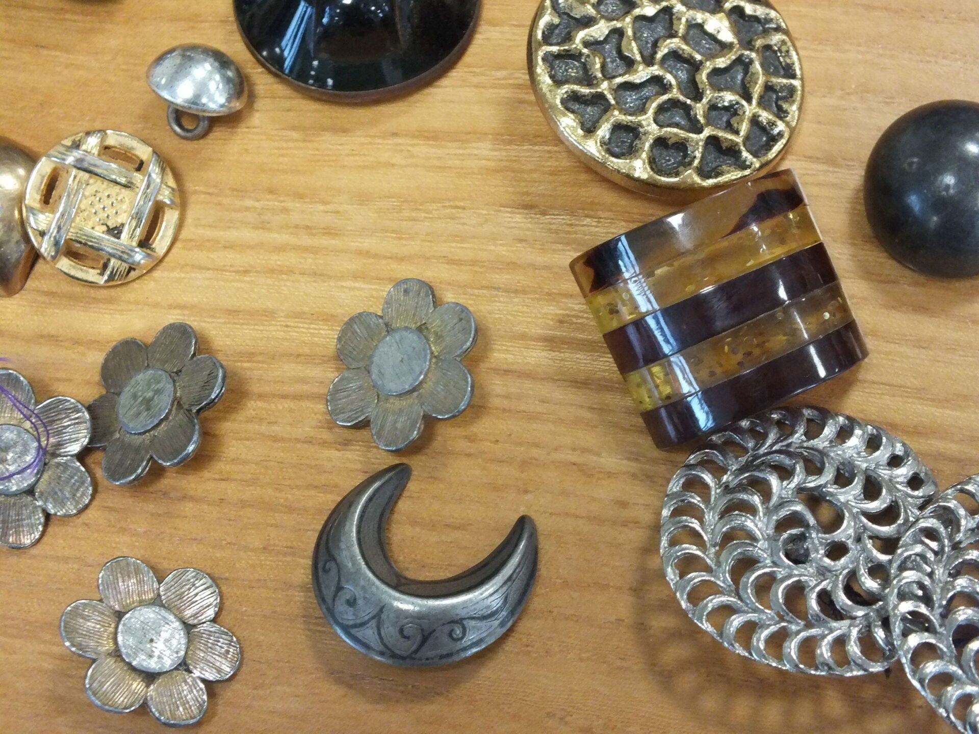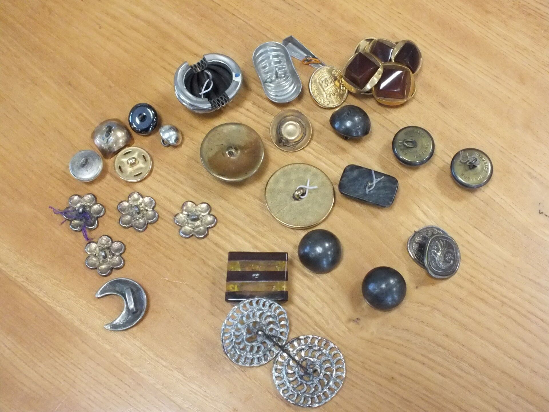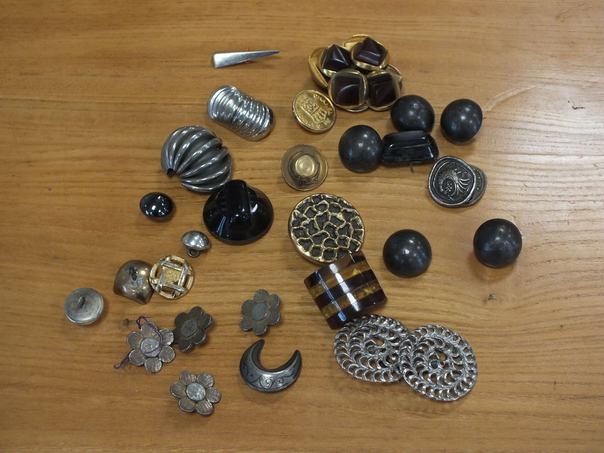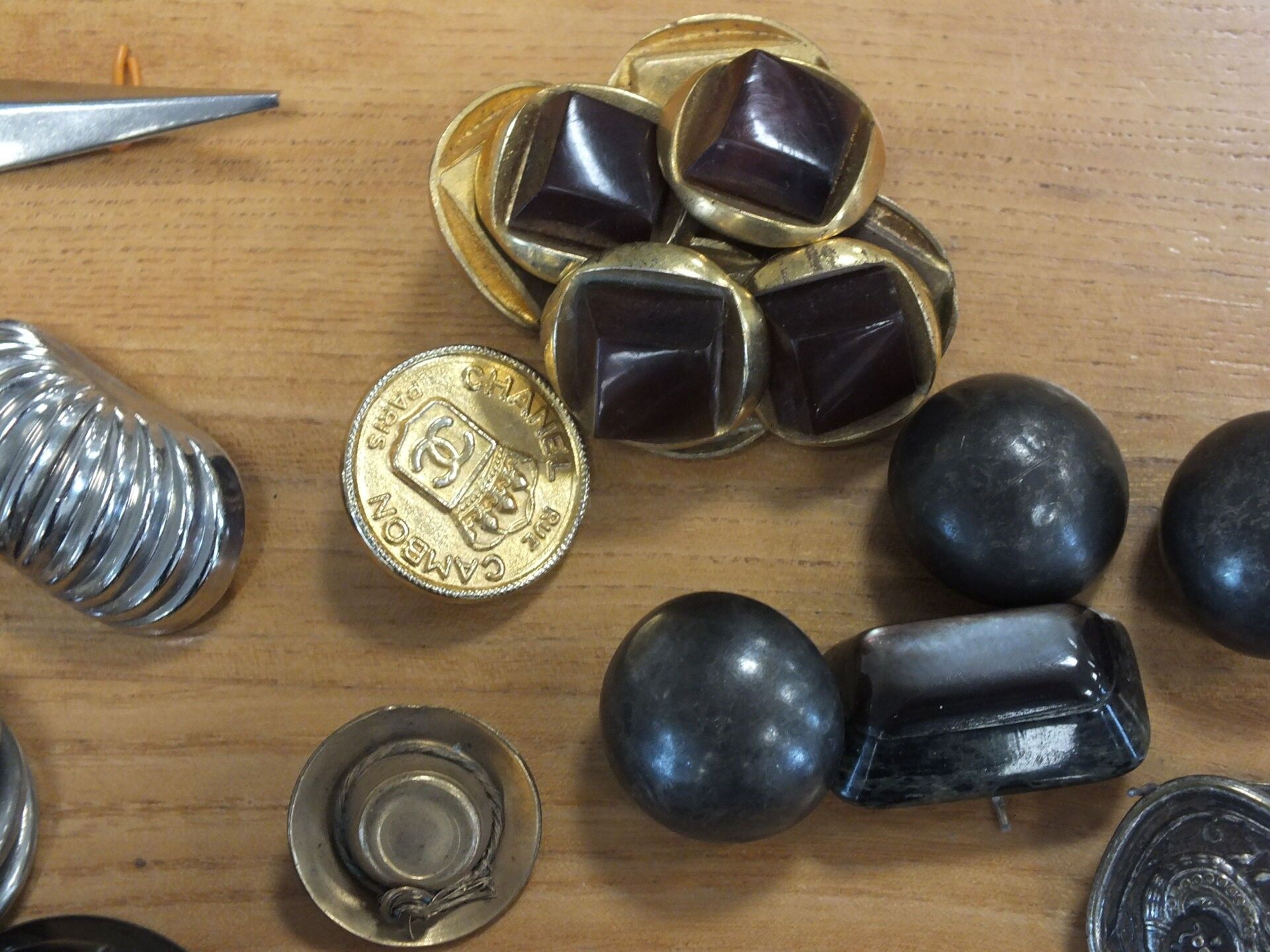 Lot of designer metal and resin buttons, five signed Maurice BOURDON, one marked "Chanel, rue Cambon Paris", two signed "LEMINOR Bretagne", one signed "LWP Paris" and others.