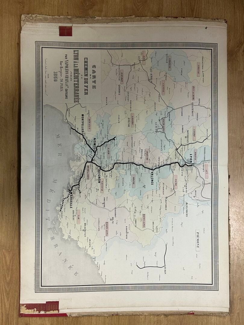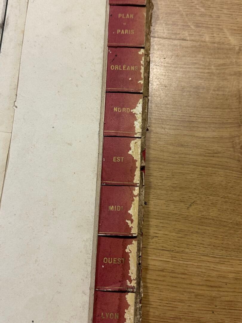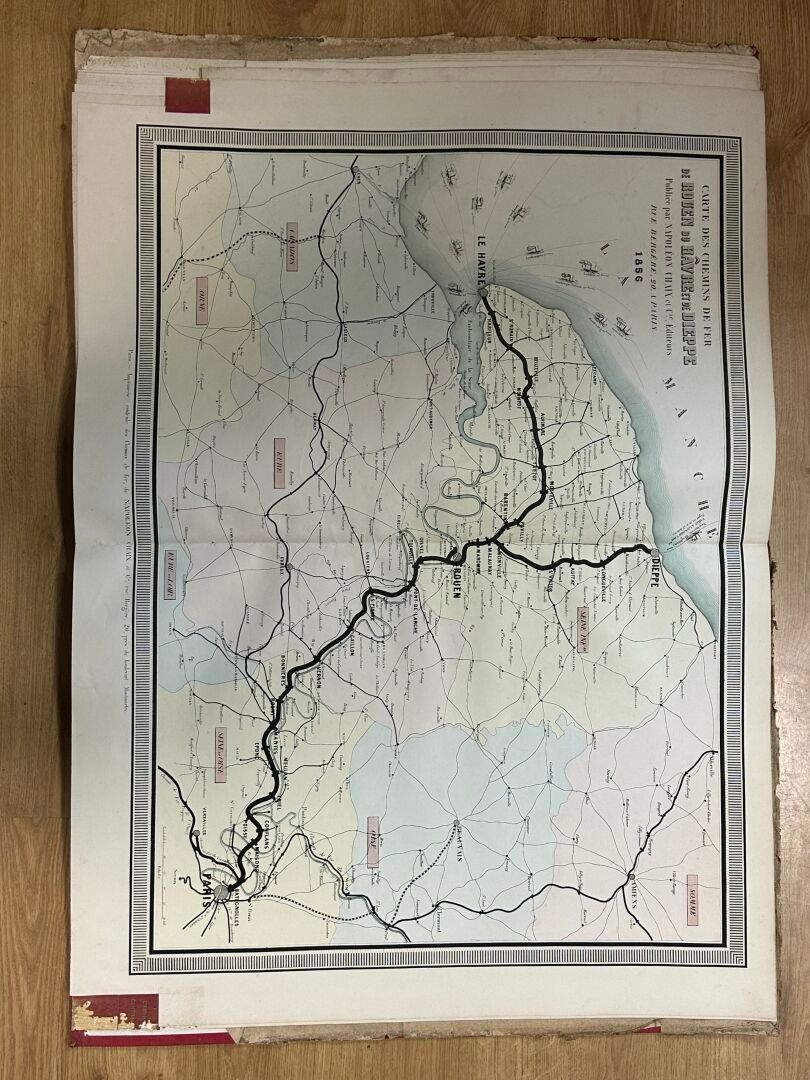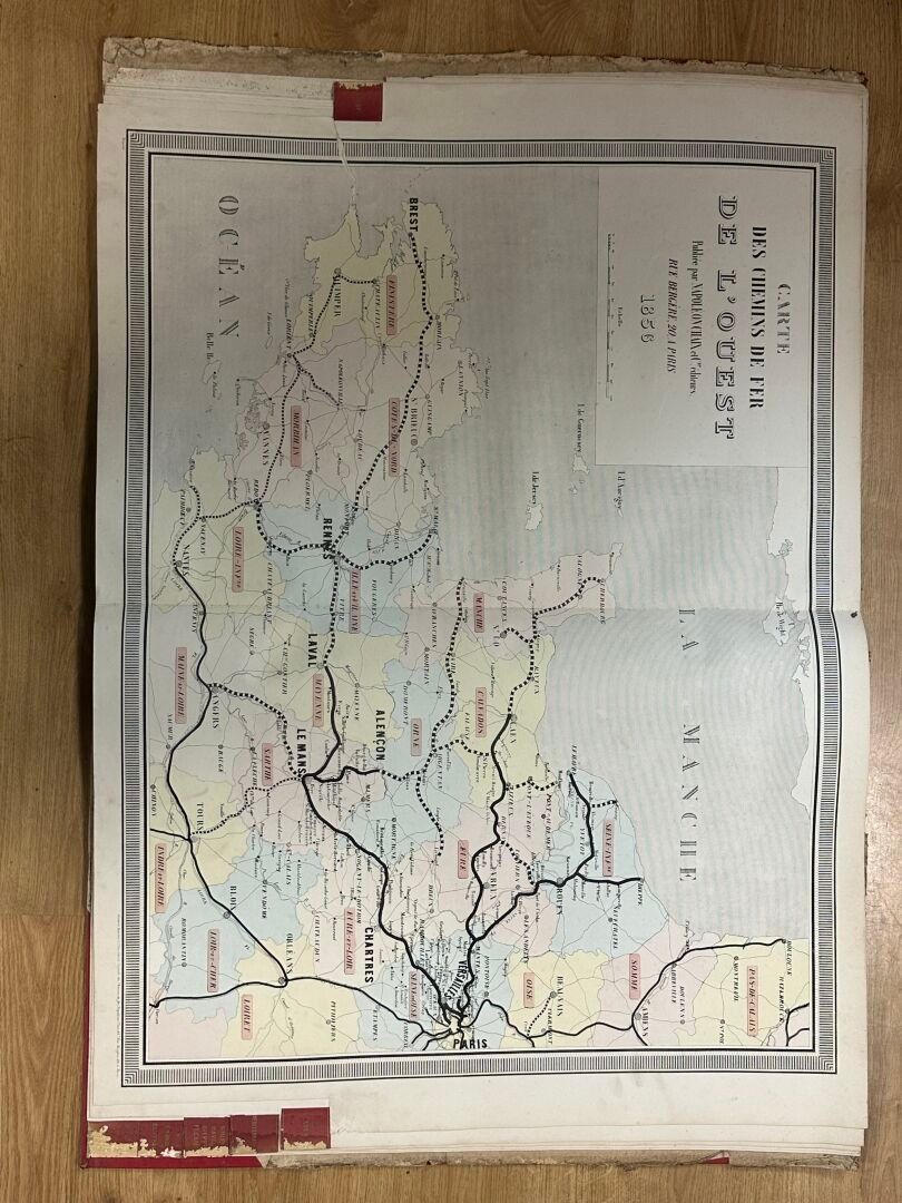 Publisher's red hardback. 15 large double-page colour engraved maps (France, Great Britain, Central Europe, United States, environs de Paris, Plan de Paris, Orléans, Nord, Est, Midi, Ouest, Lyon, Méditerranée, Rouen-Le Havre-Dieppe-Fécamp, Grand central).