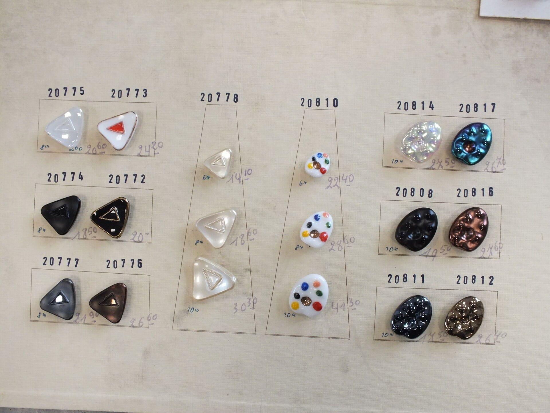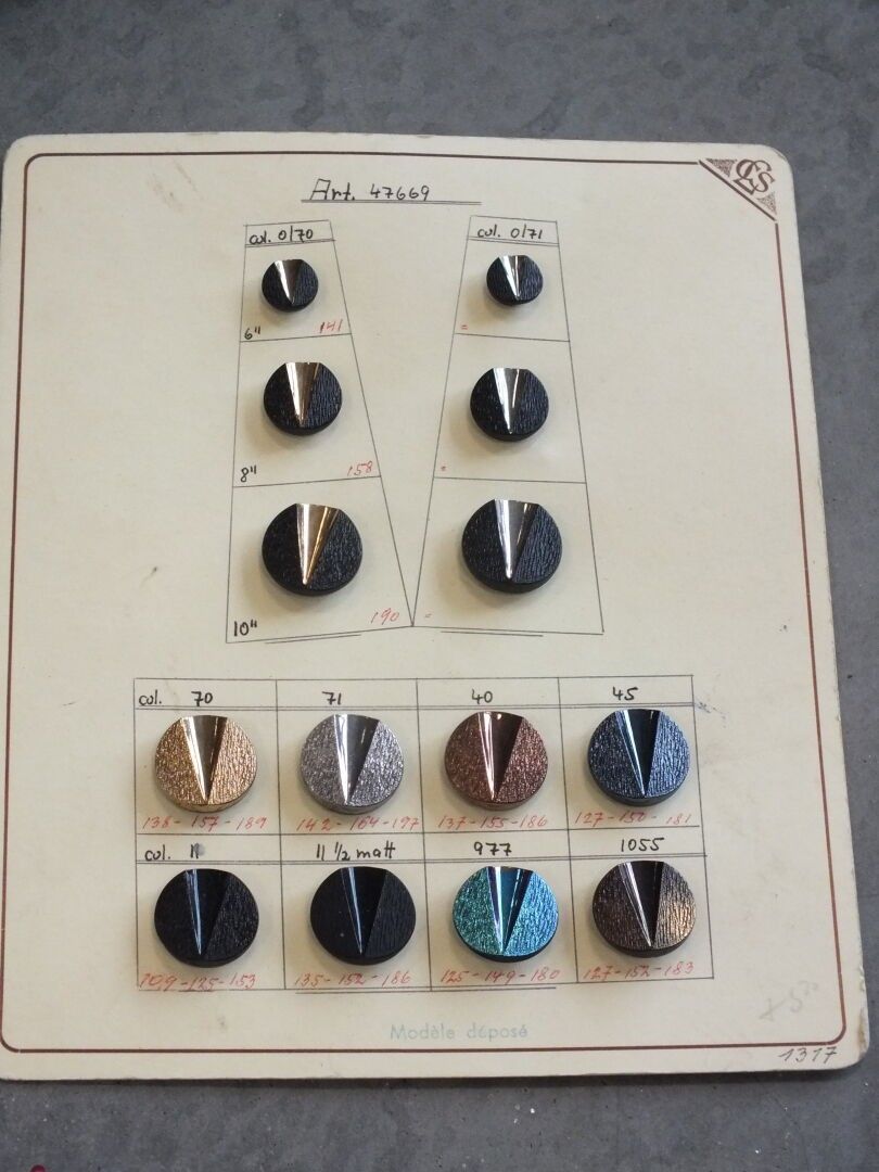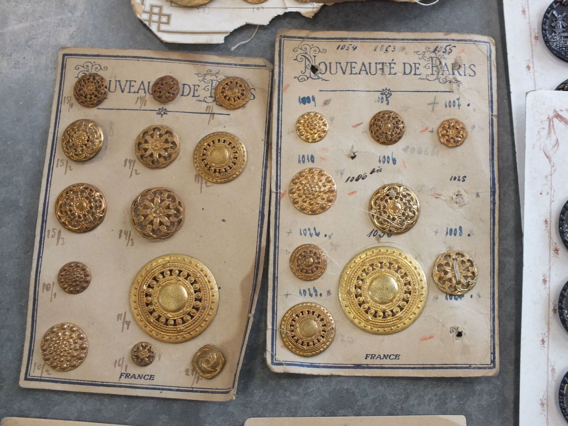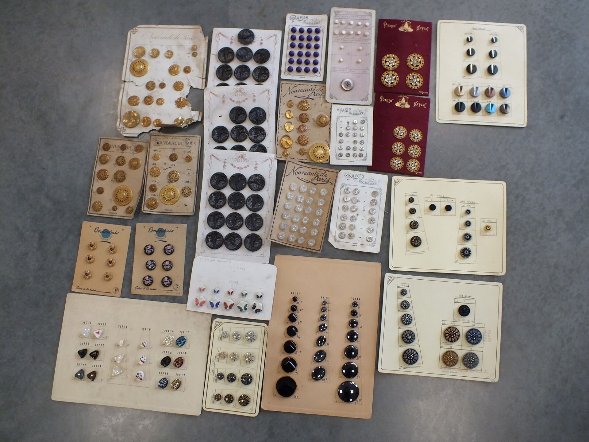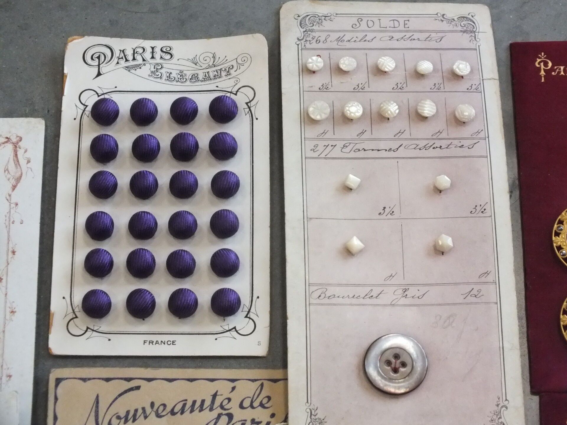 Lot of button plates, various shop stock including "Paris Élégant", "CLS(?)", "Paris Style", "Boutonbuis", "Nouveauté de Paris" and others