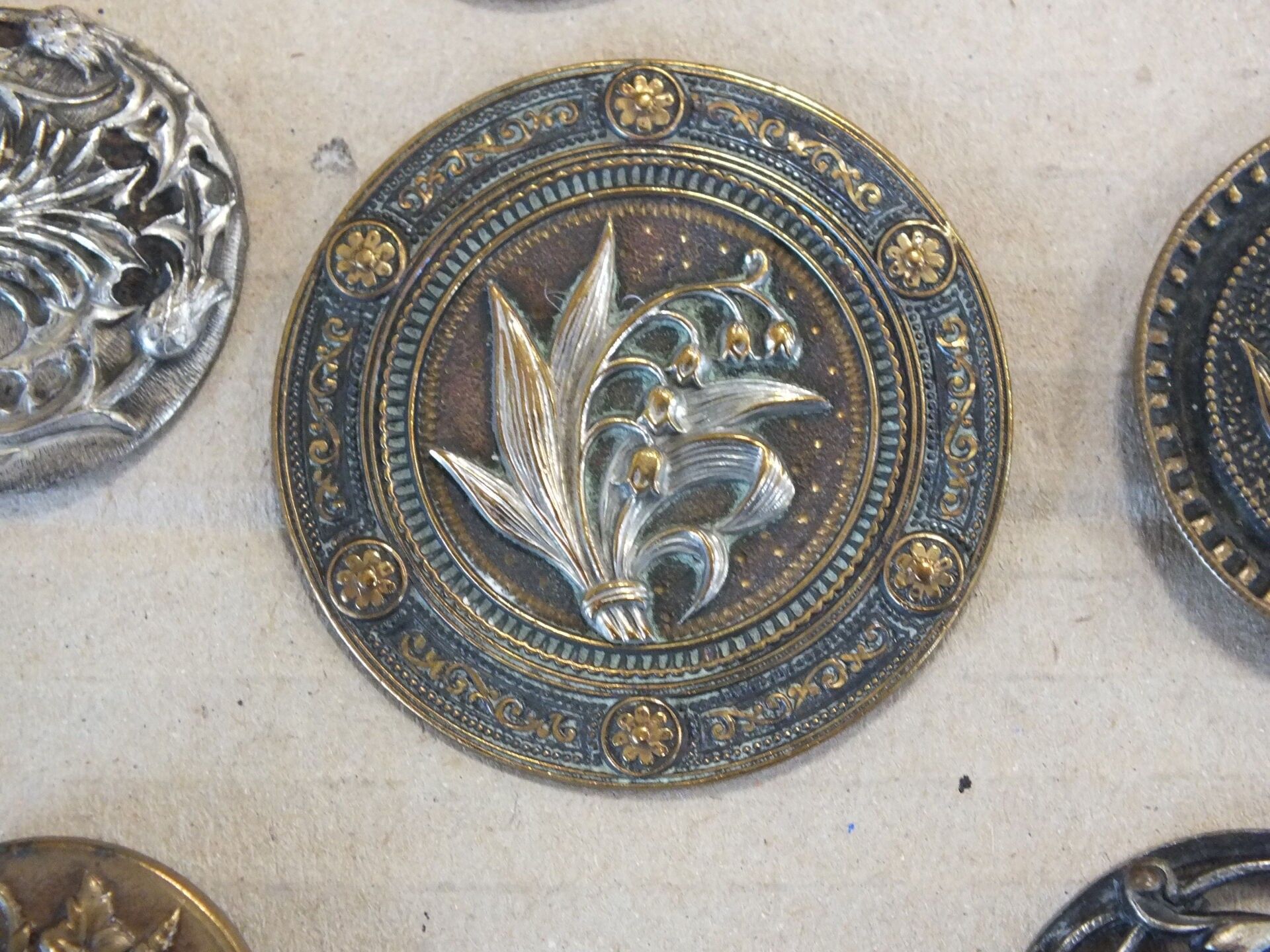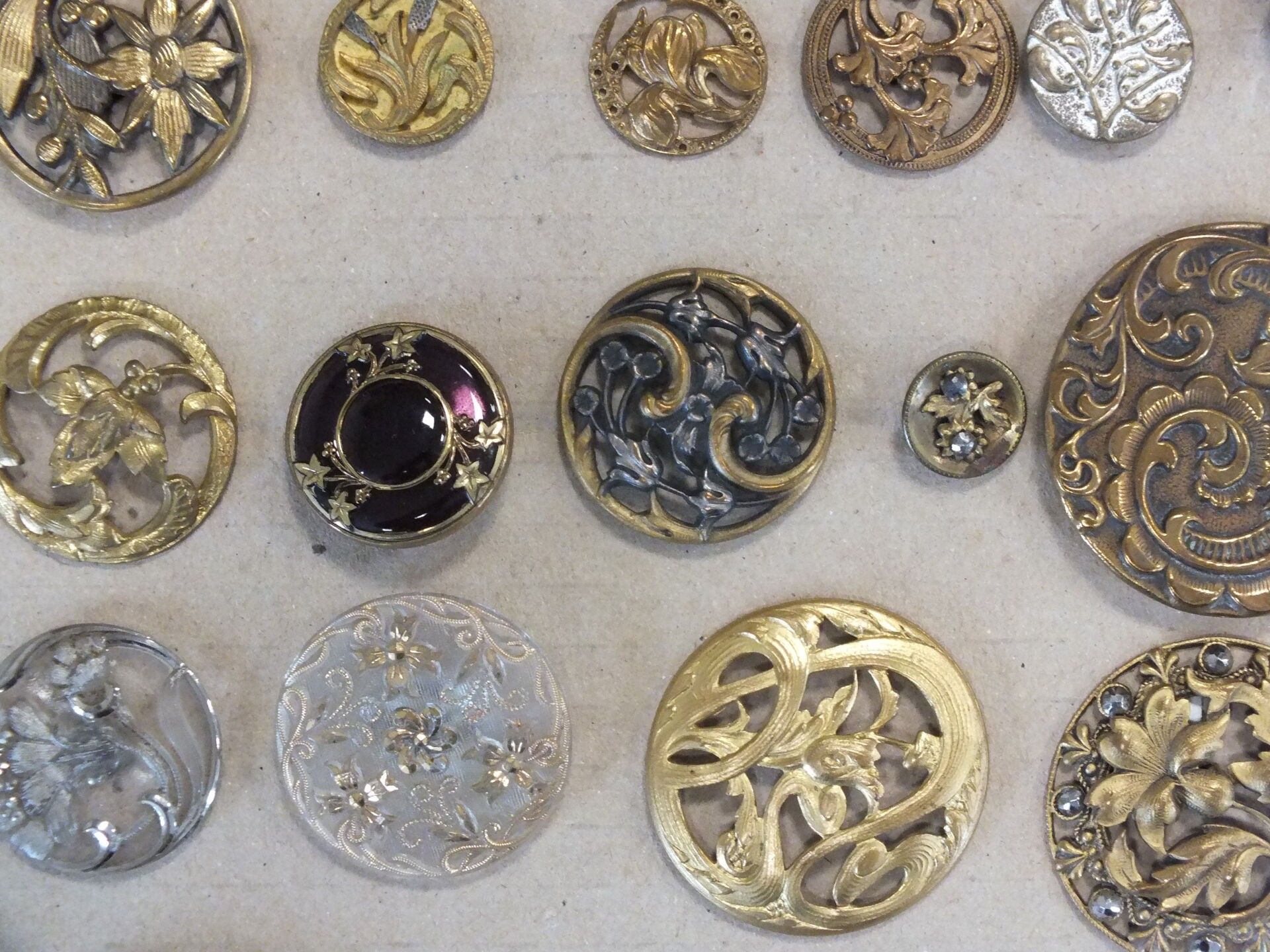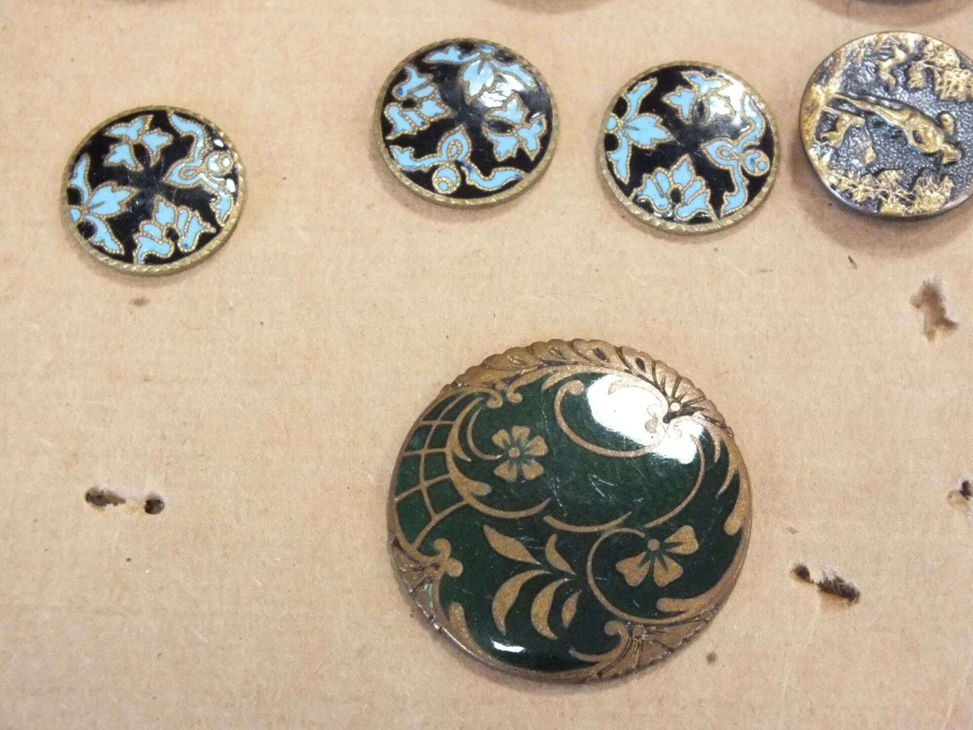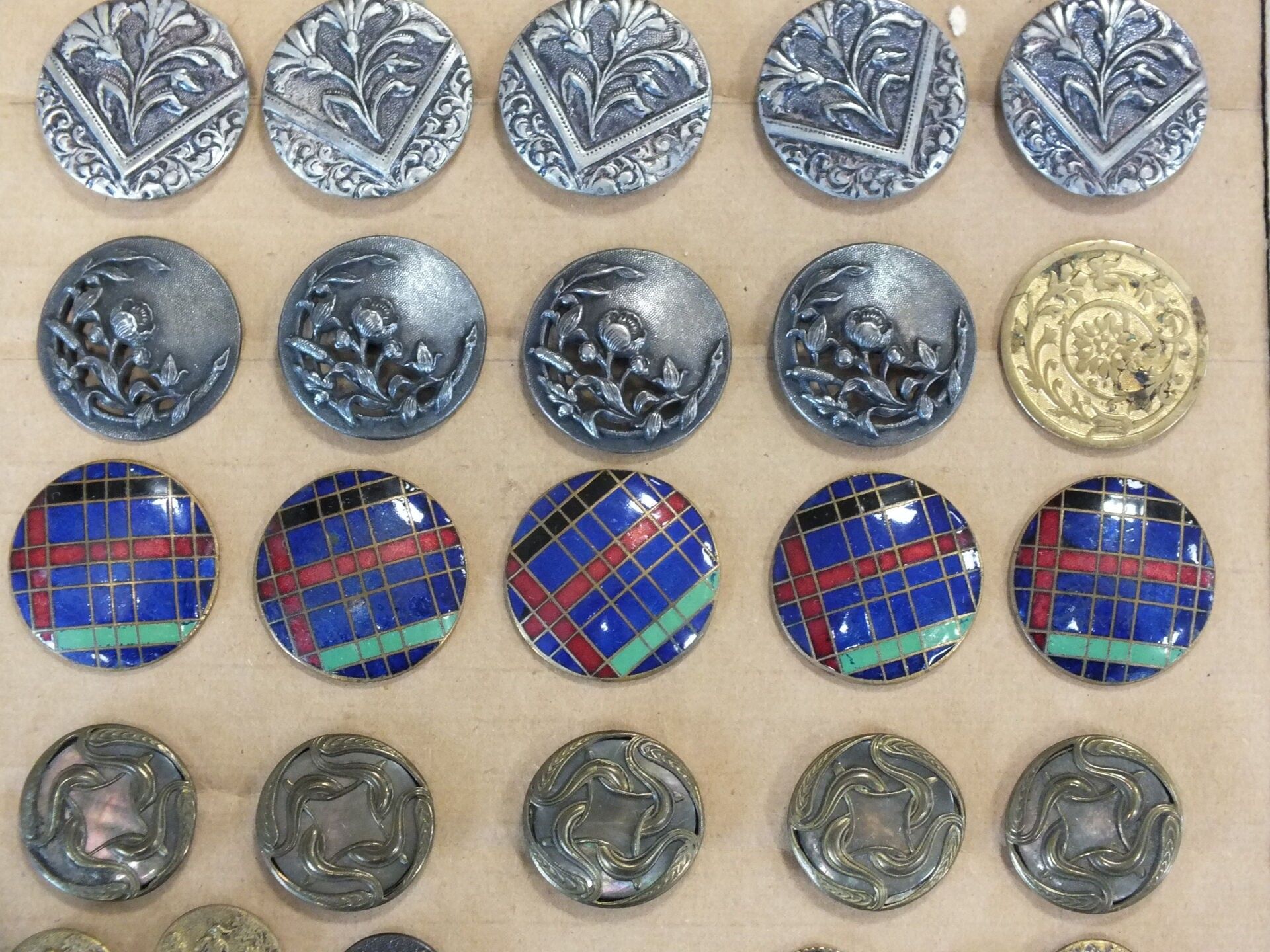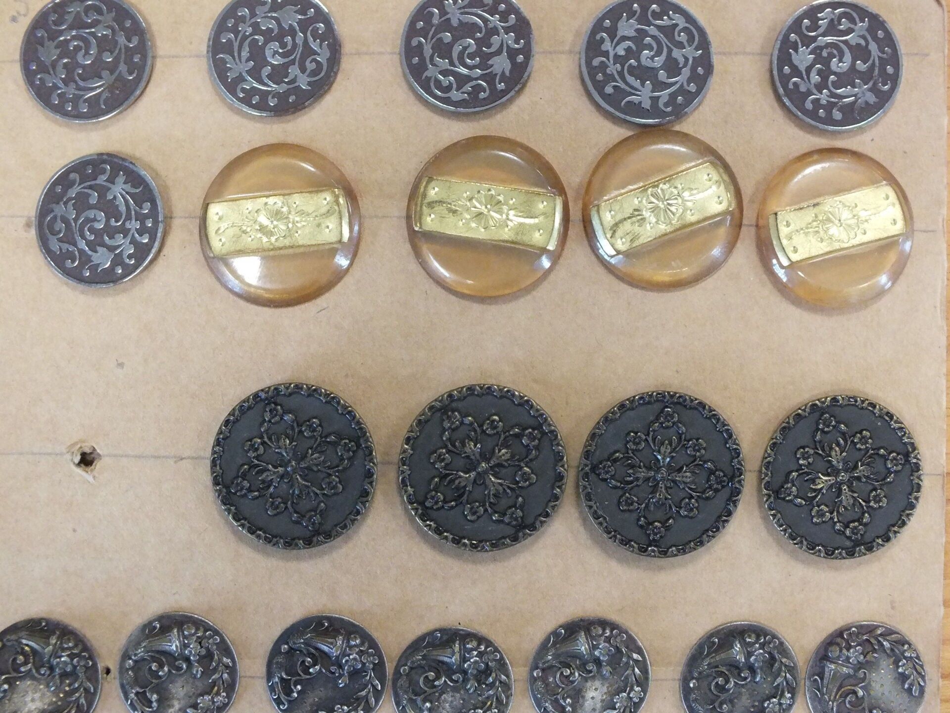 Set of three plates of buttons of various sizes and materials, mostly with floral decoration