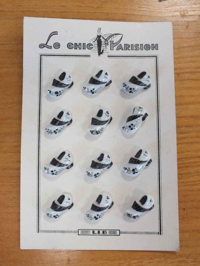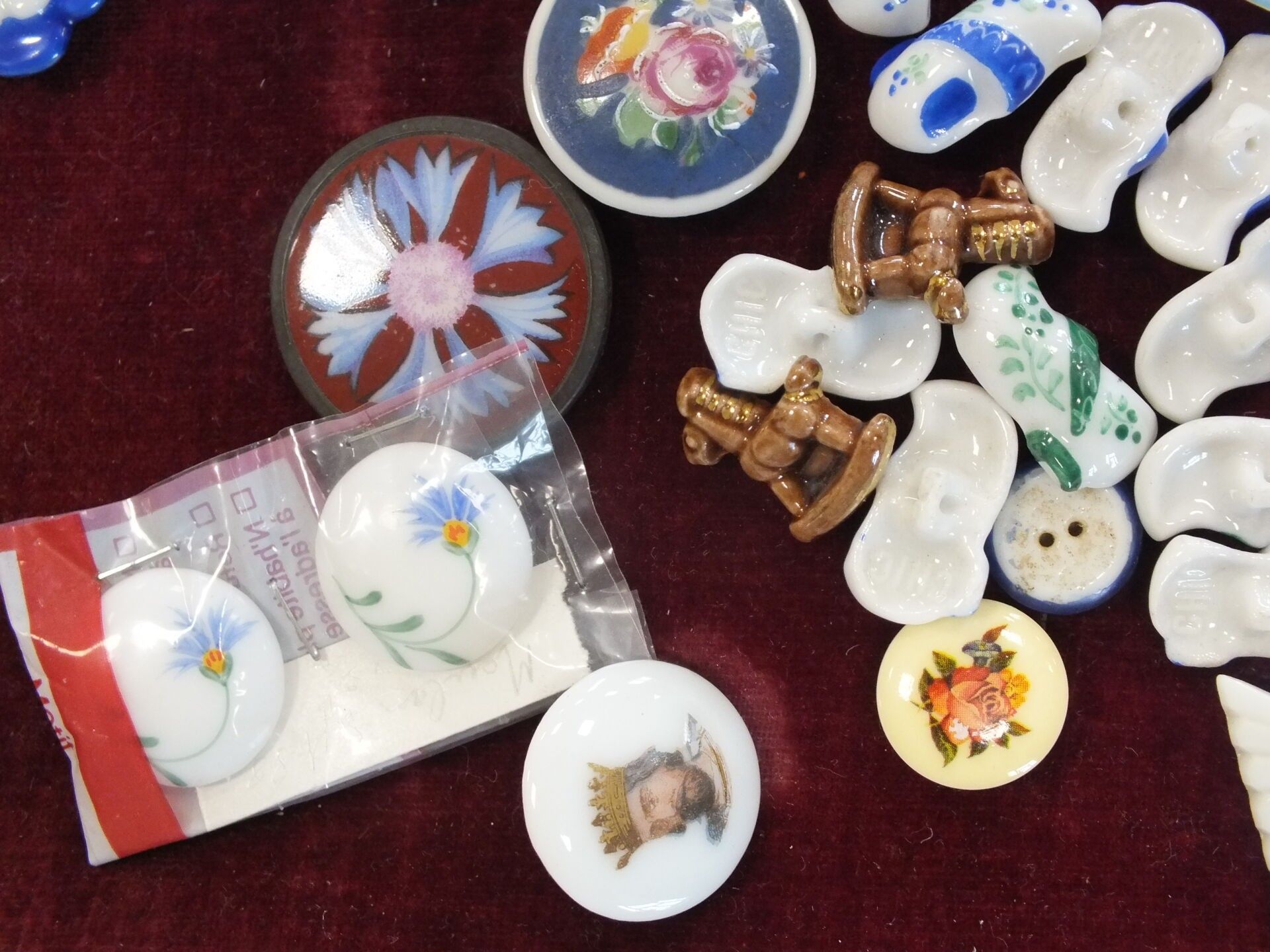 A set of porcelain sewing buttons, many with clog decoration