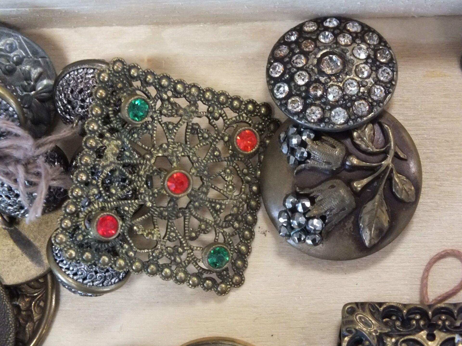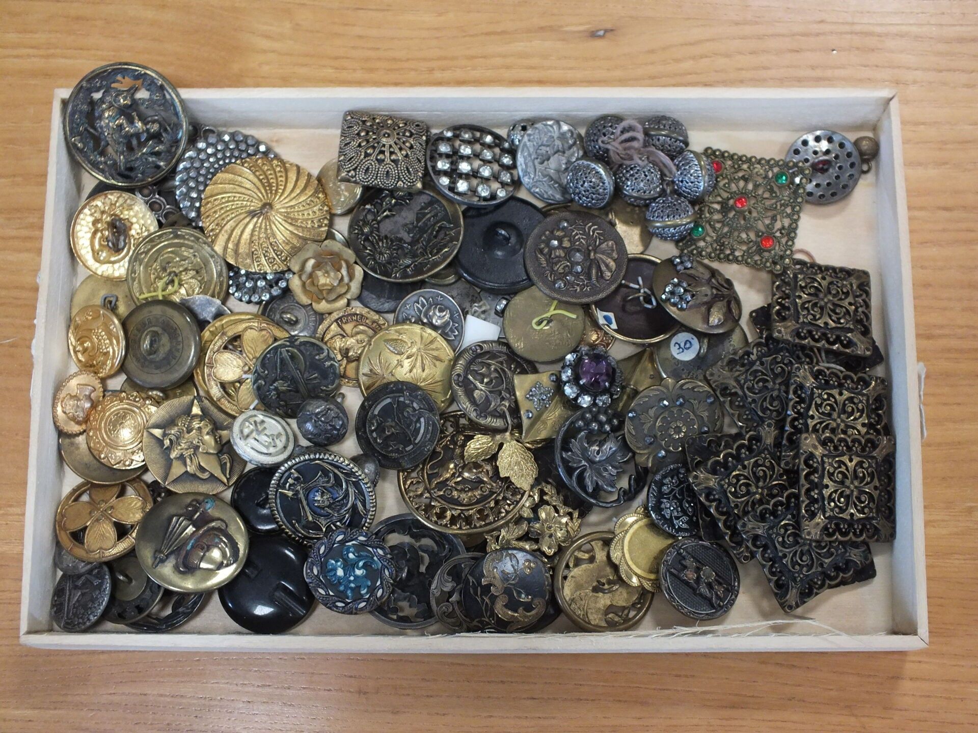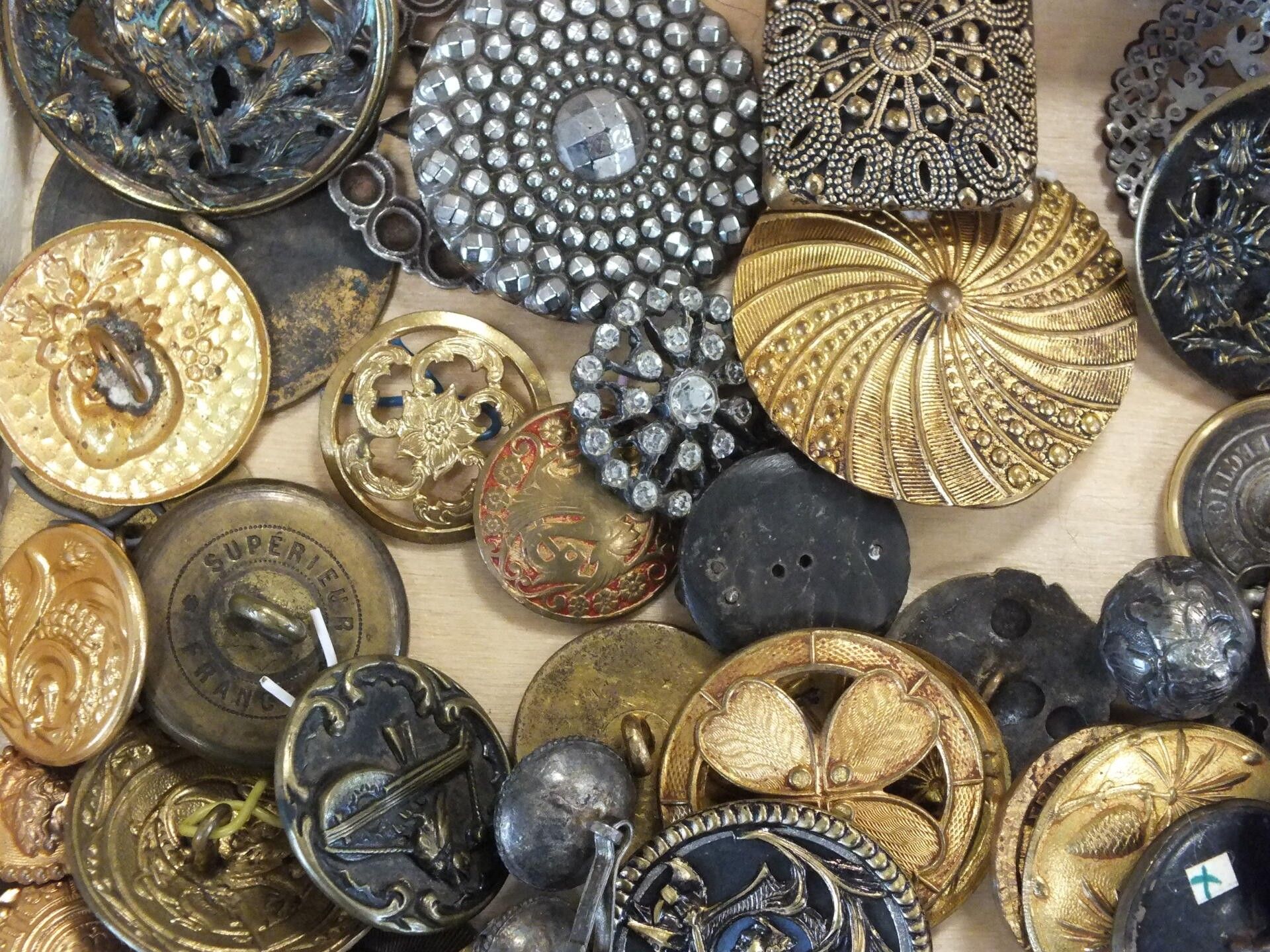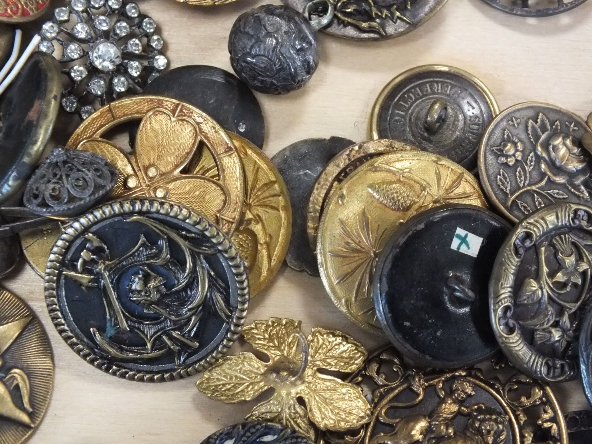 Batch of various buttons, mostly in metal with openwork decoration, animals, characters, flowers, decorated with rhinestones and others