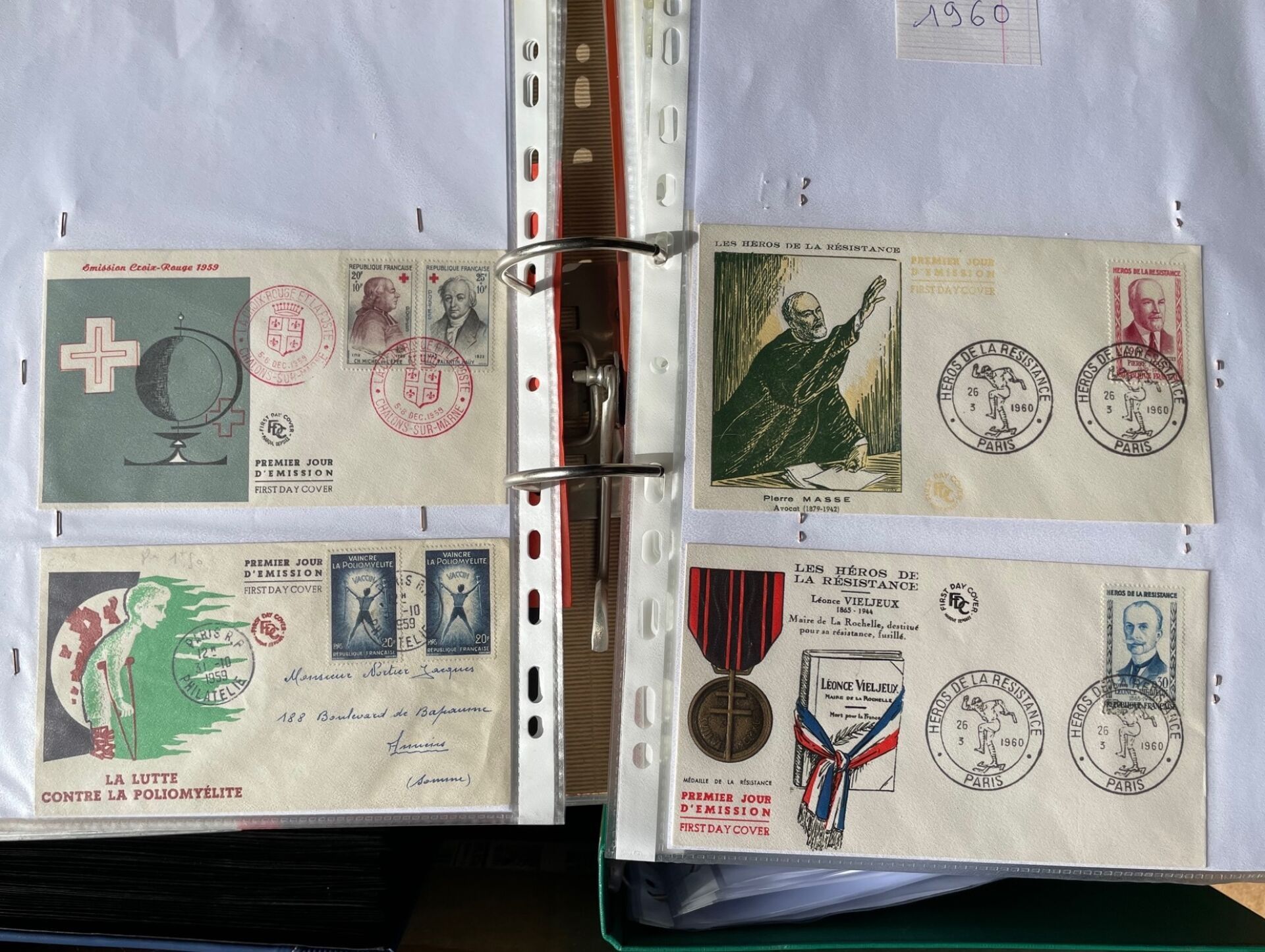 1 box of 11 binders of 1st Day envelopes from France, many years complete or almost complete.