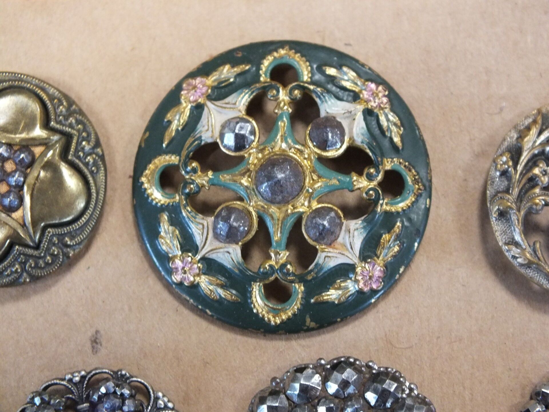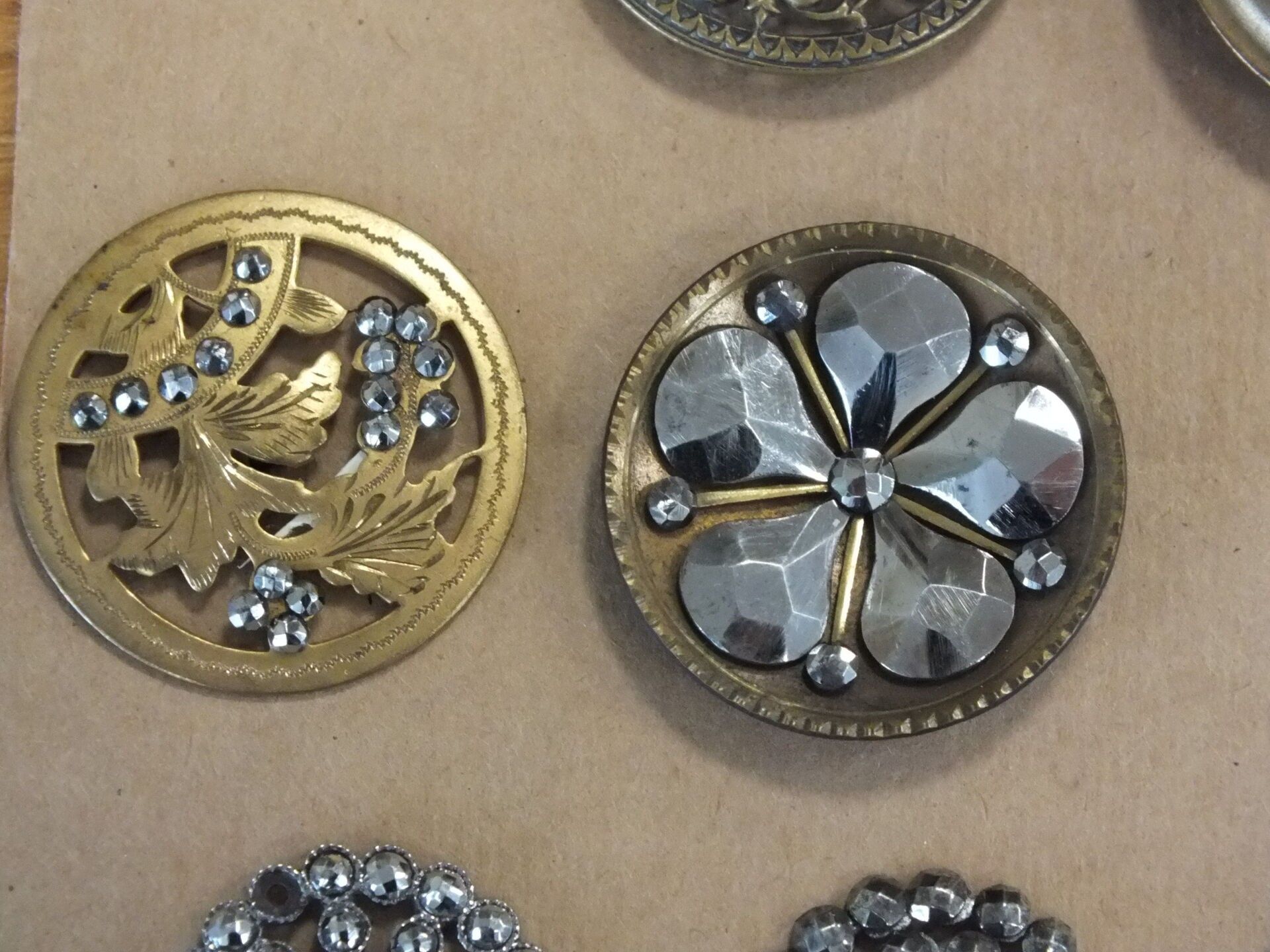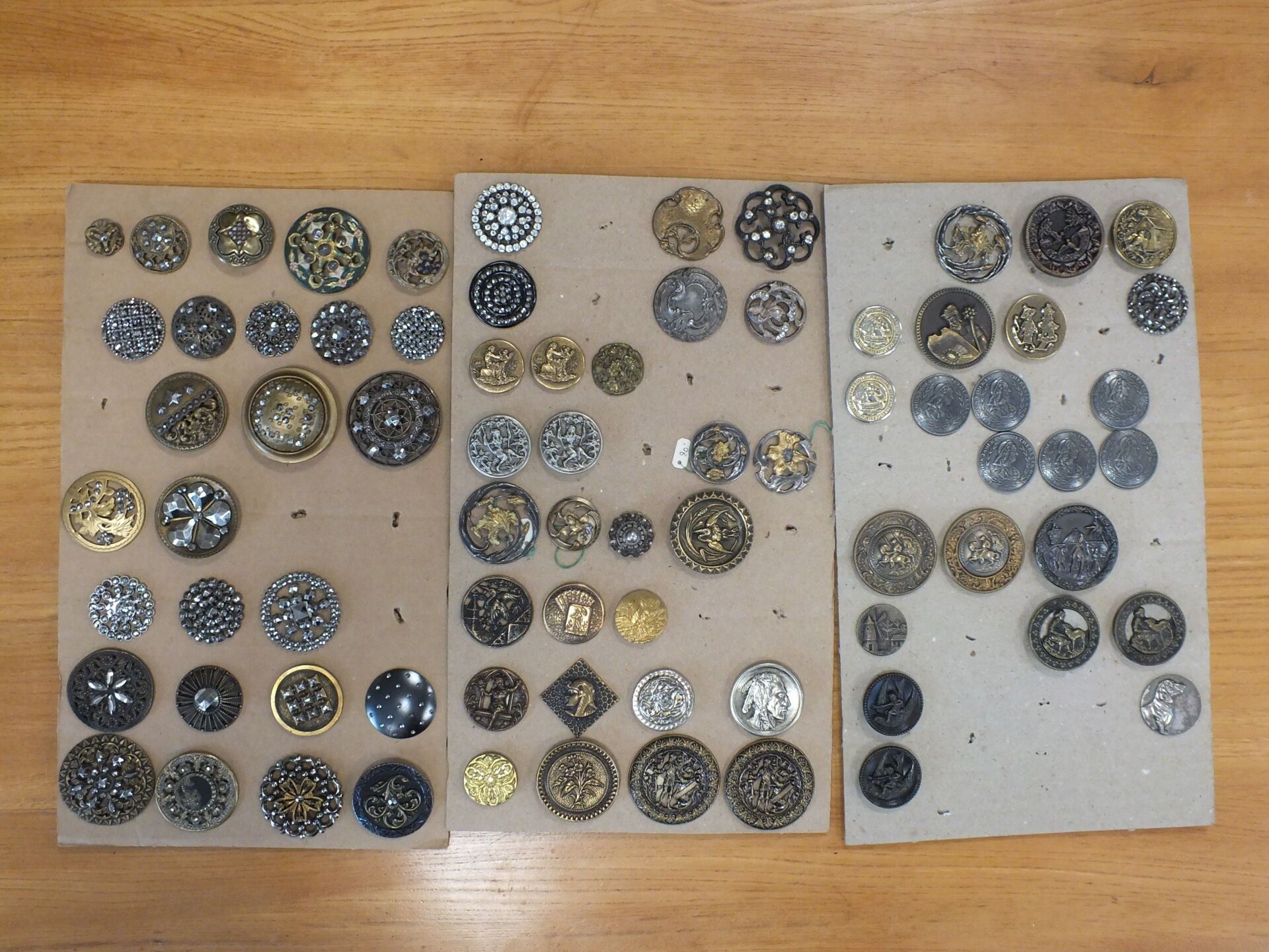 Set of three plates of buttons of various sizes and materials, some with rhinestones and decorated with figures, flowers and animals.