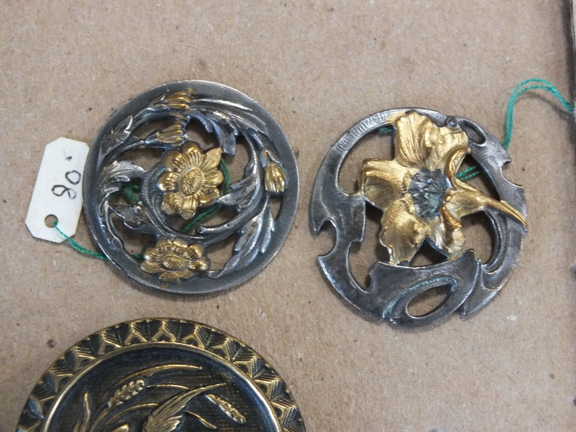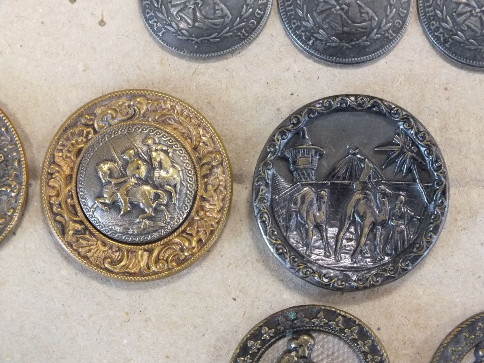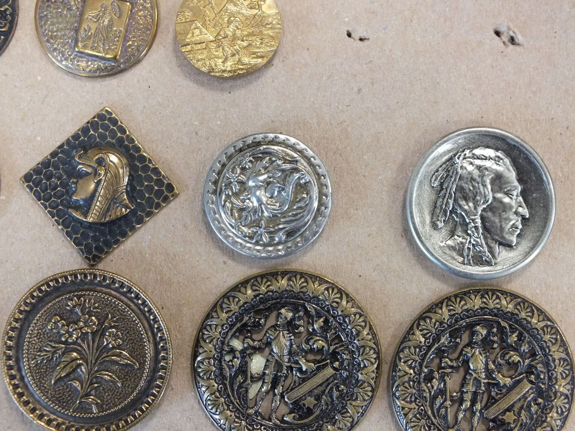 Set of three plates of buttons of various sizes and materials, some with rhinestones and decorated with figures, flowers and animals.