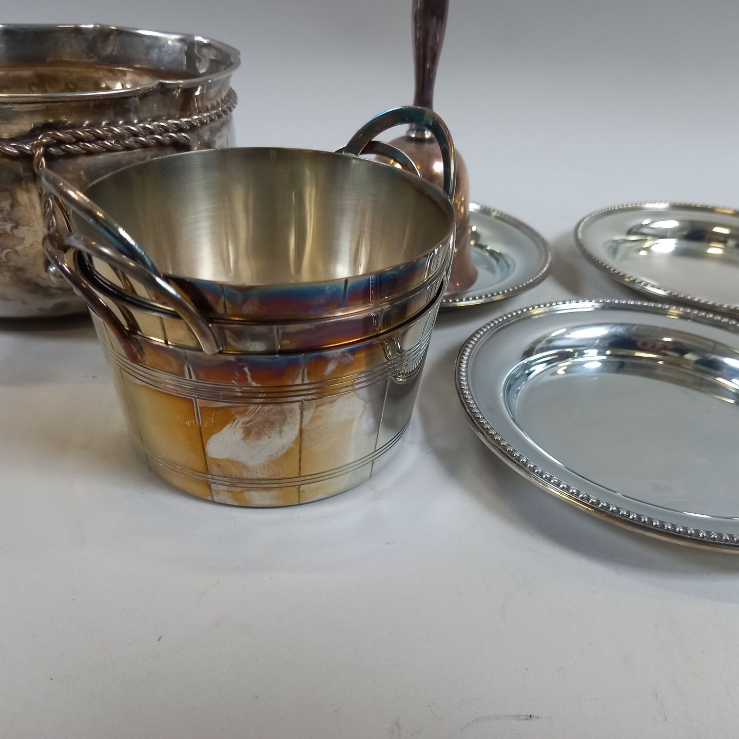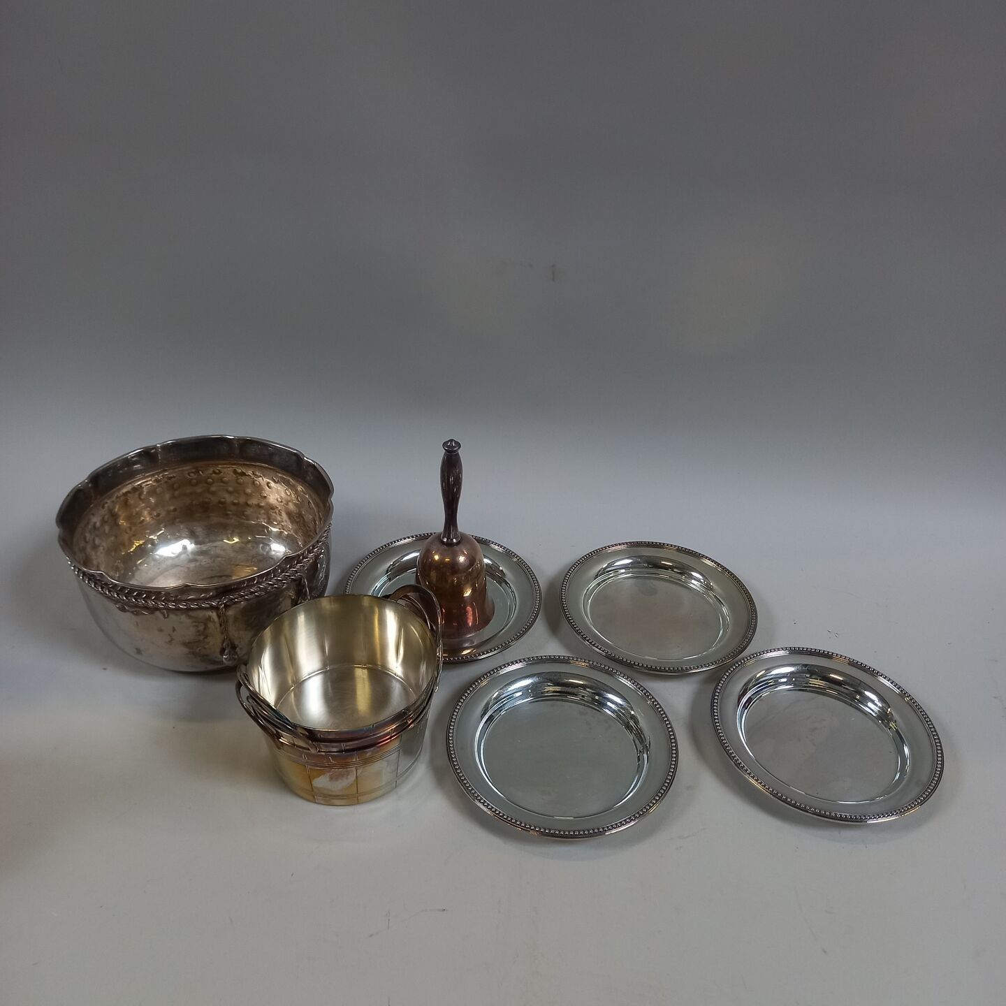 A metal lot comprising: 4 coasters, a table bell, three rame…