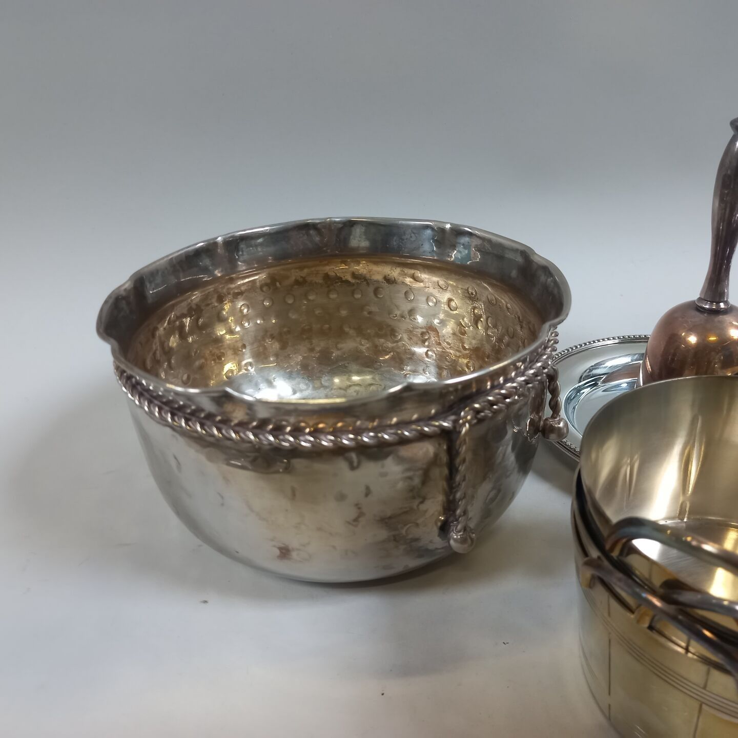 A metal lot comprising: 4 coasters, a table bell, three ramekins and a jardinière with hammered decoration IN THE STATE (accidents)