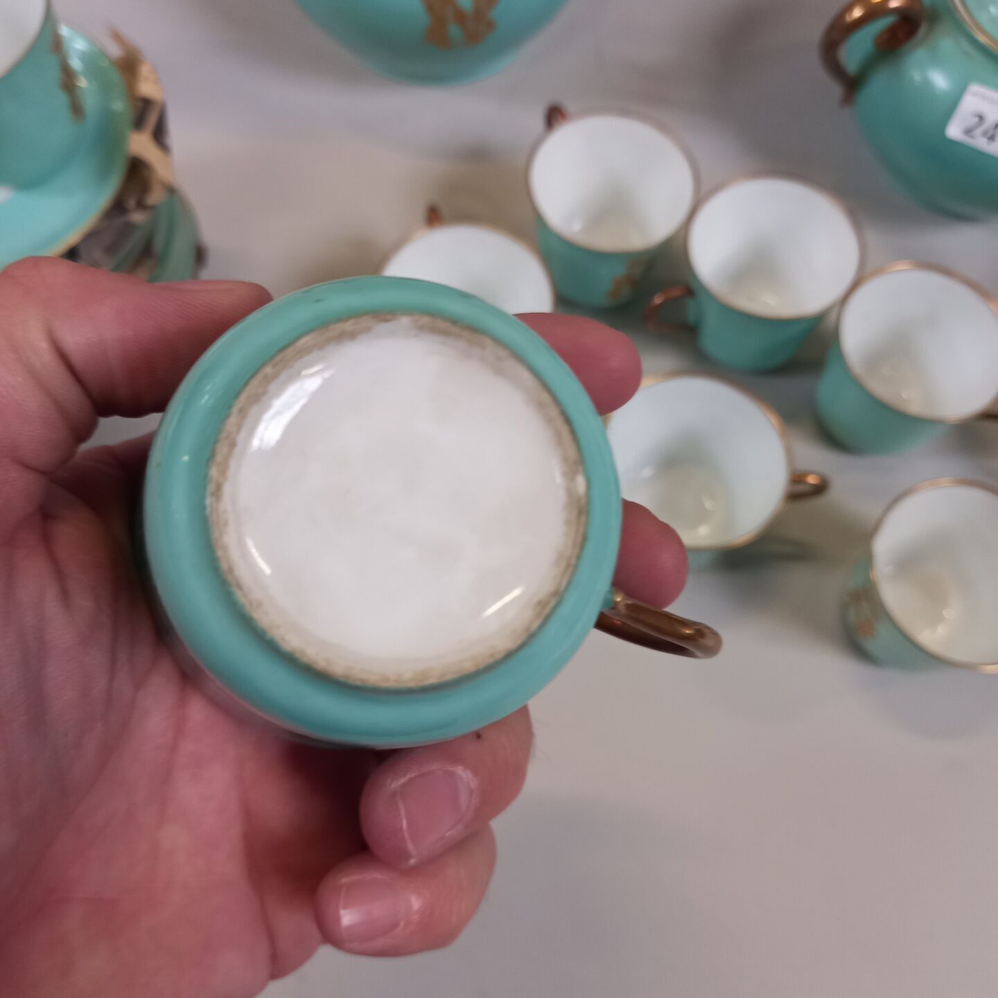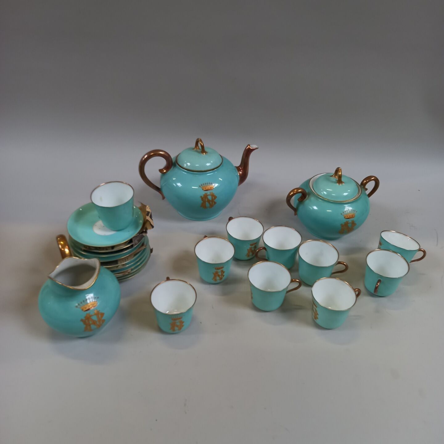 Part of a porcelain tea service decorated with count's crowns on a blue background, numbered NB, comprising: 10 cups and their saucers, a teapot, a sugar bowl and a milk jug.