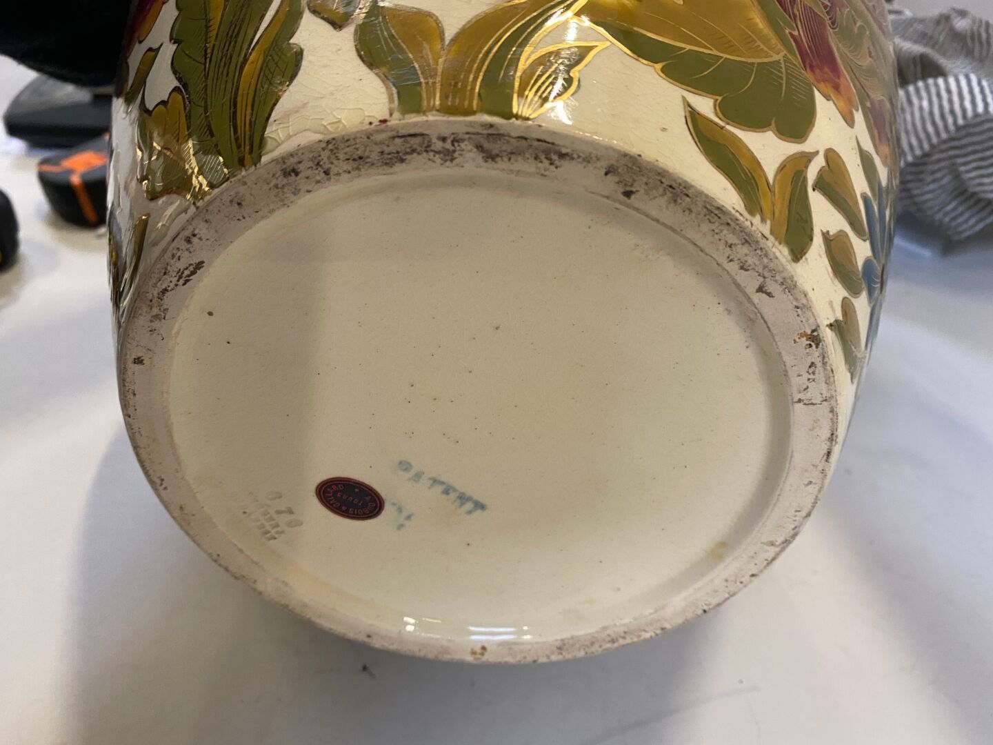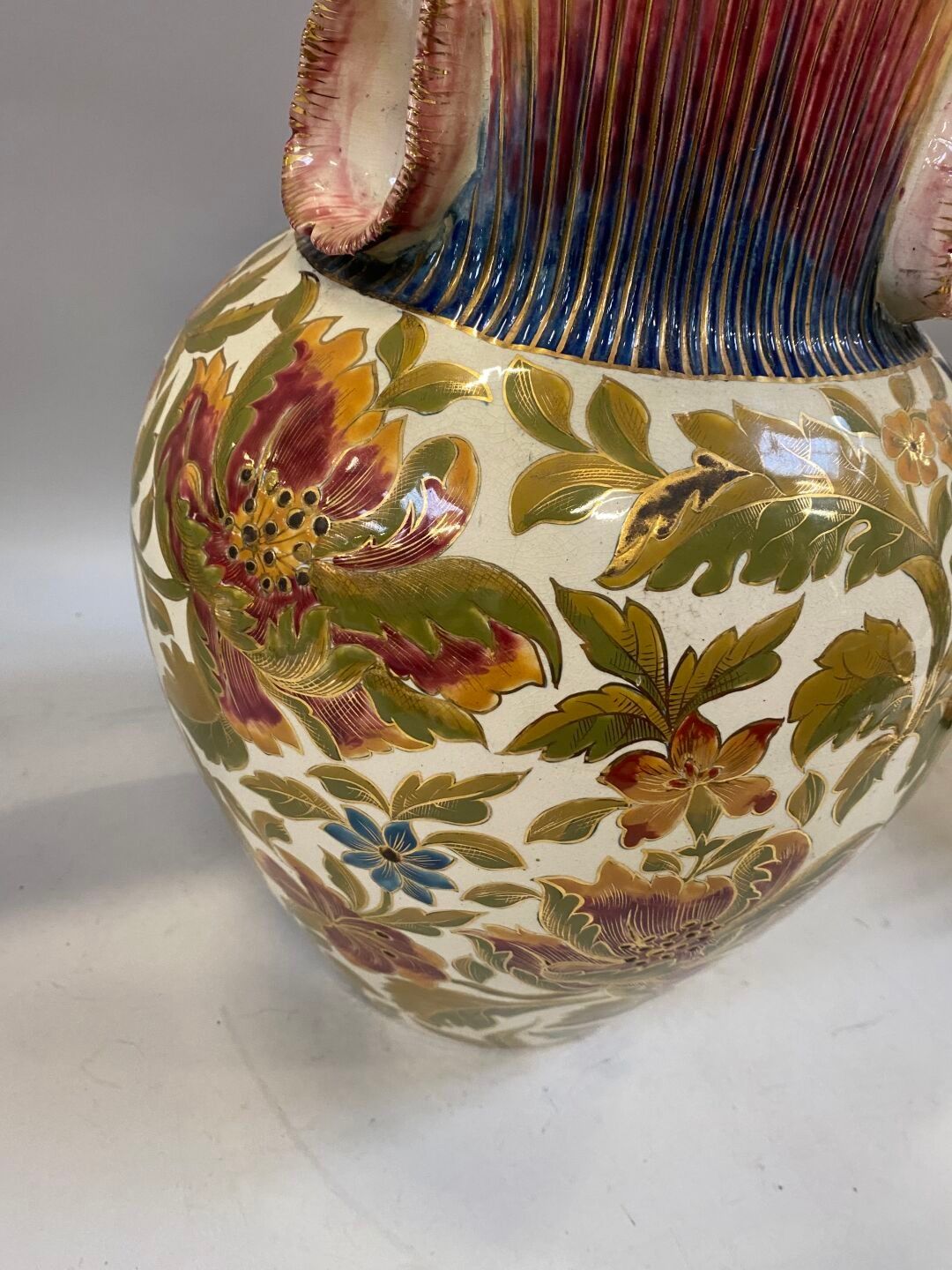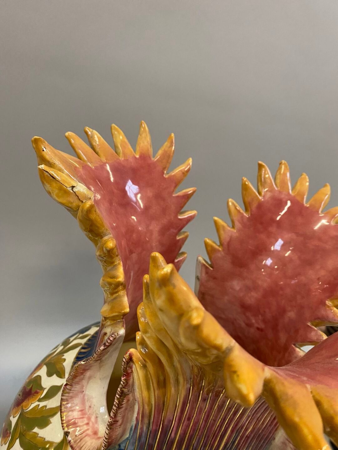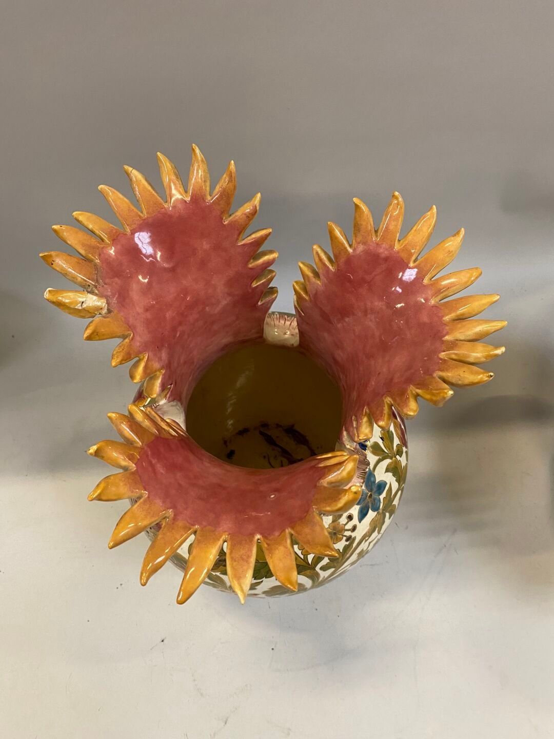 A large baluster-shaped earthenware VASE enamelled in gold highlights, with an openwork neck decorated with a stylized carnivorous plant. 19th century. Height 49 cm. Damage.