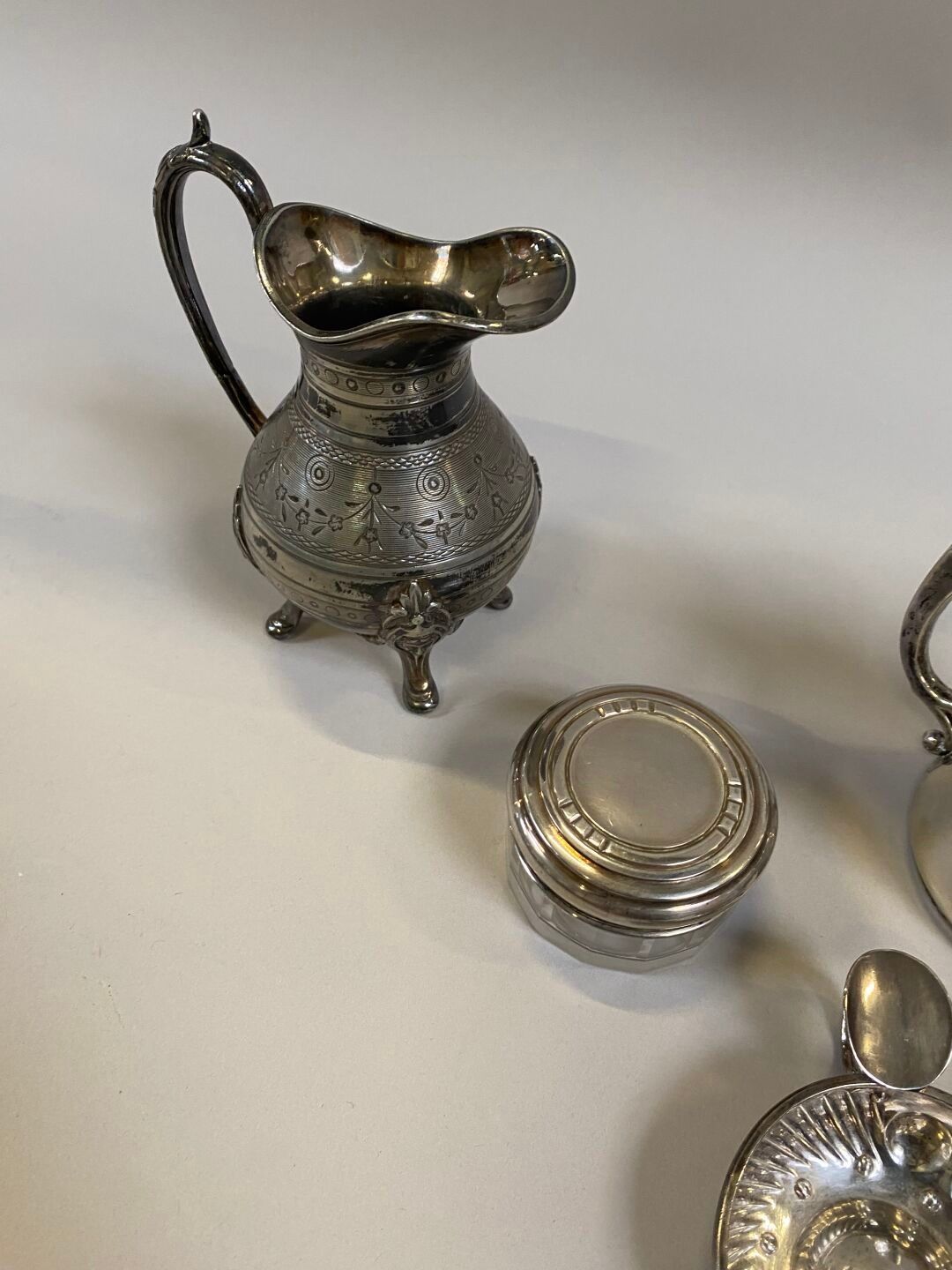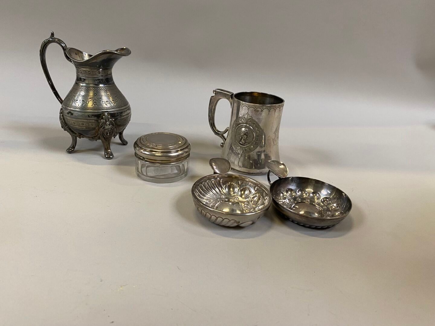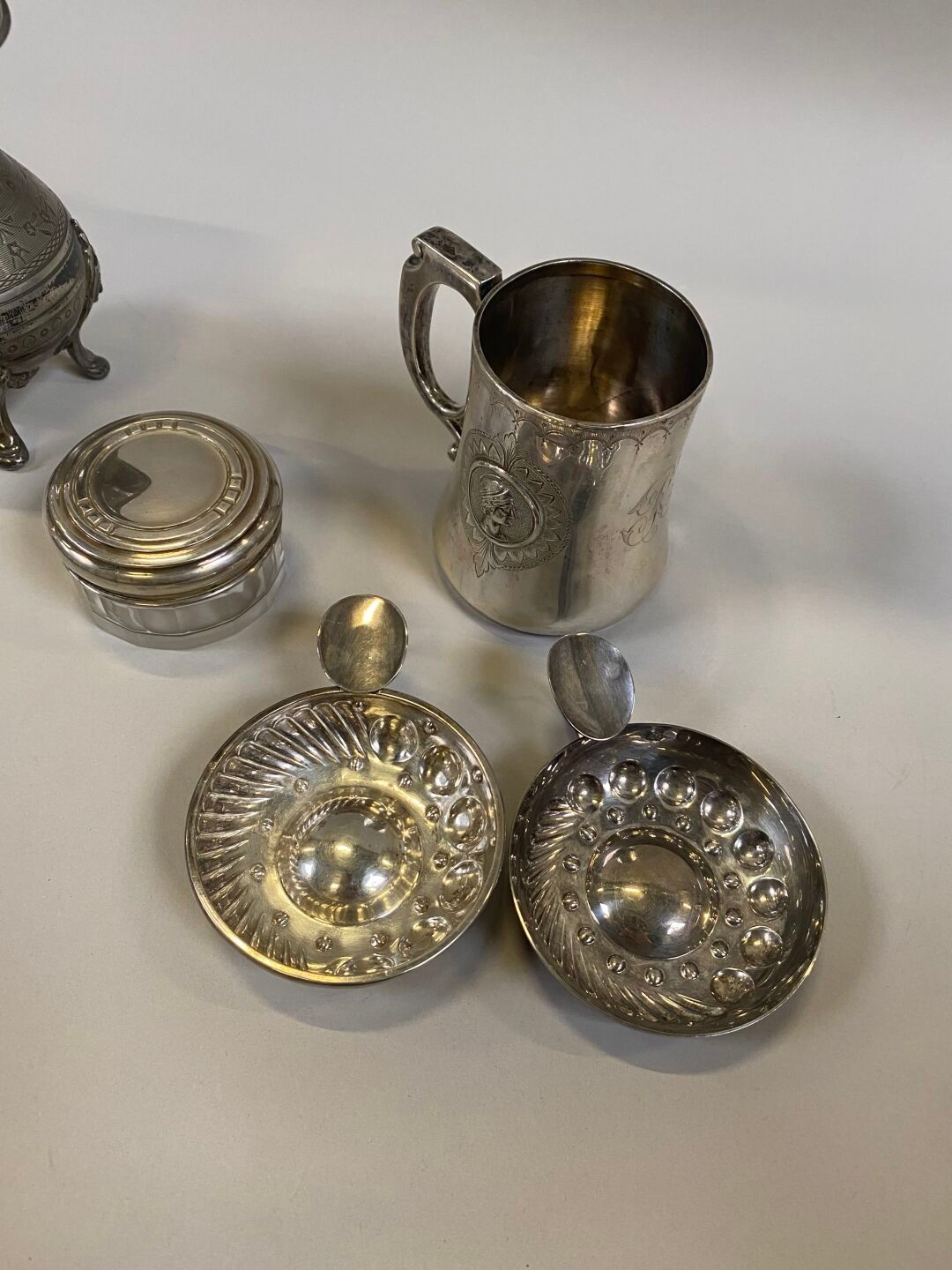 SILVER SET comprising two tastevins, a pint decorated with an antique profile, and a silver and crystal covered box. Weight of silver: 260 g. A silver-plated milk jug is included.