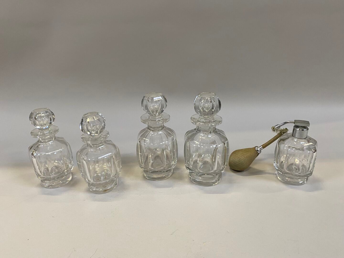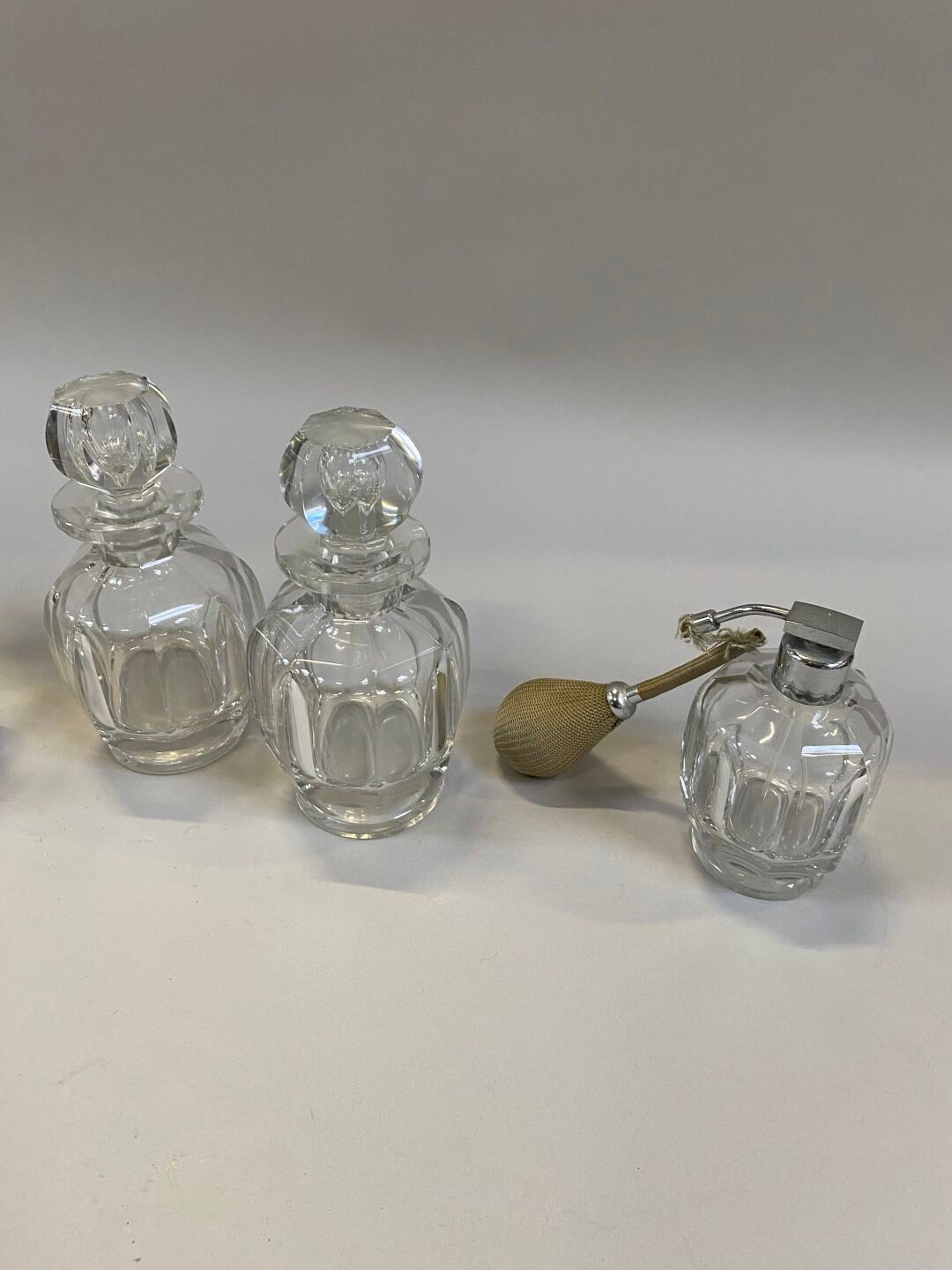 In the taste of BACCARAT. Crystal TOILETTE set including four bottles and a perfume spray. Damage and chips to the spray bottle.