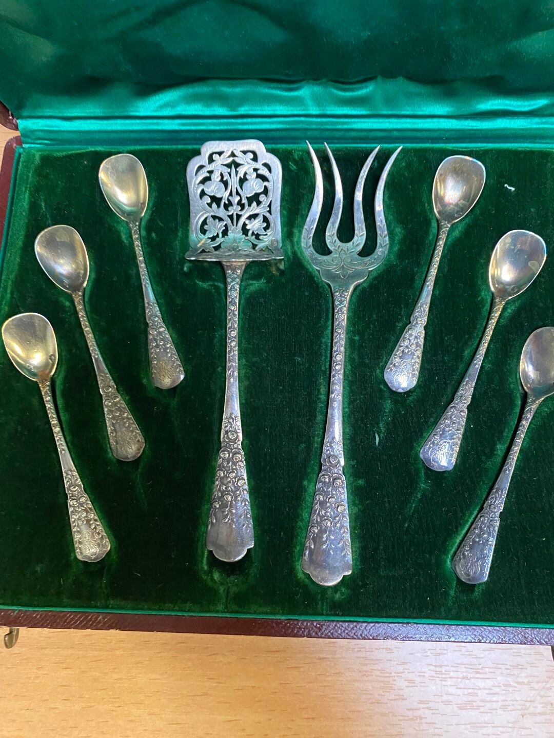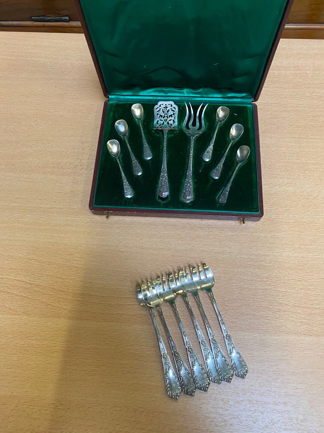 Silver set comprising six oyster forks with foliate decoration and a candy set and teaspoons. Weight: 230 g.