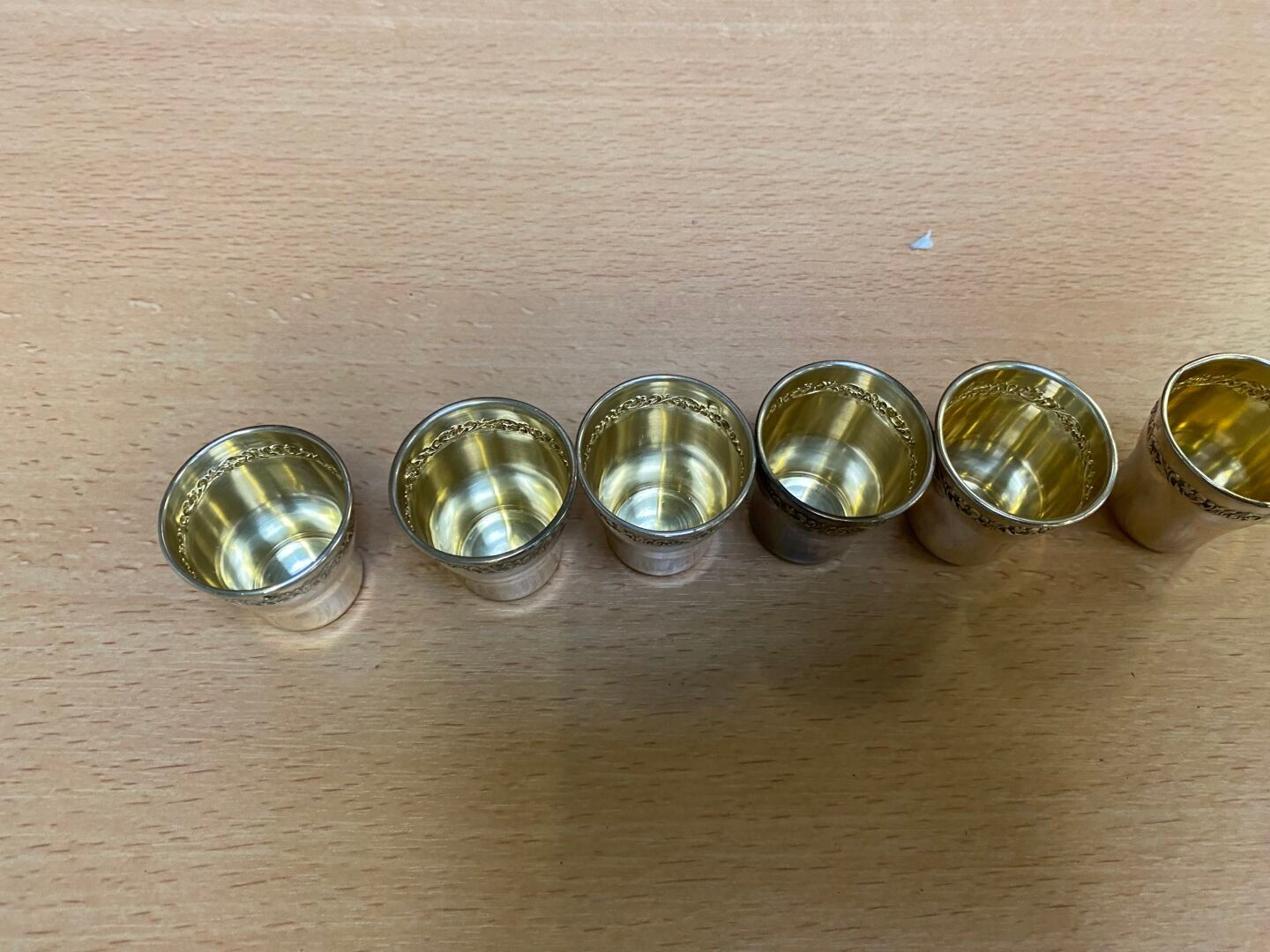 Six silver liqueur GLASSES with vermeil inside.